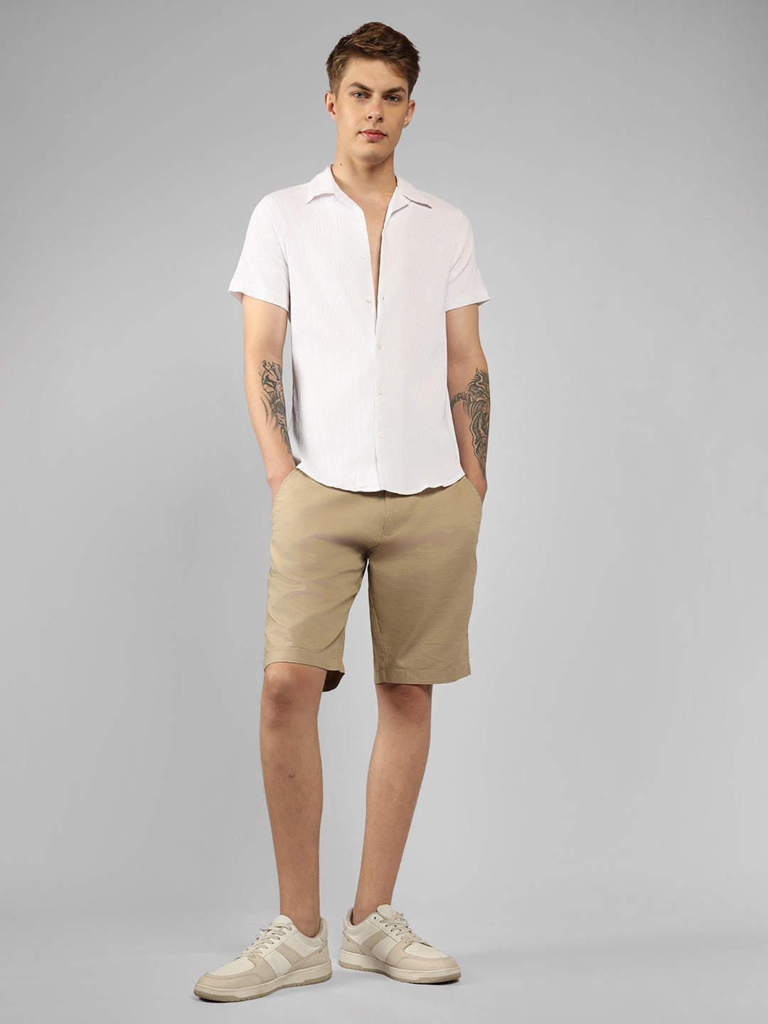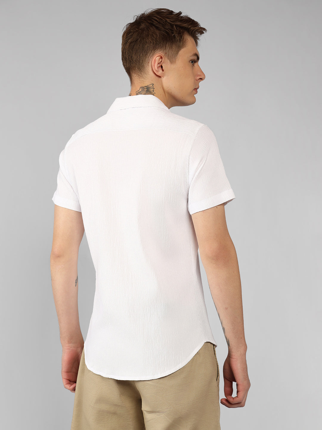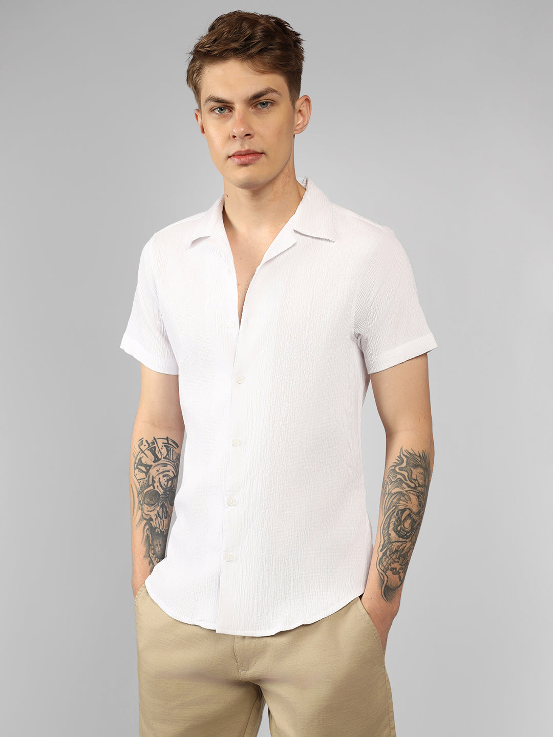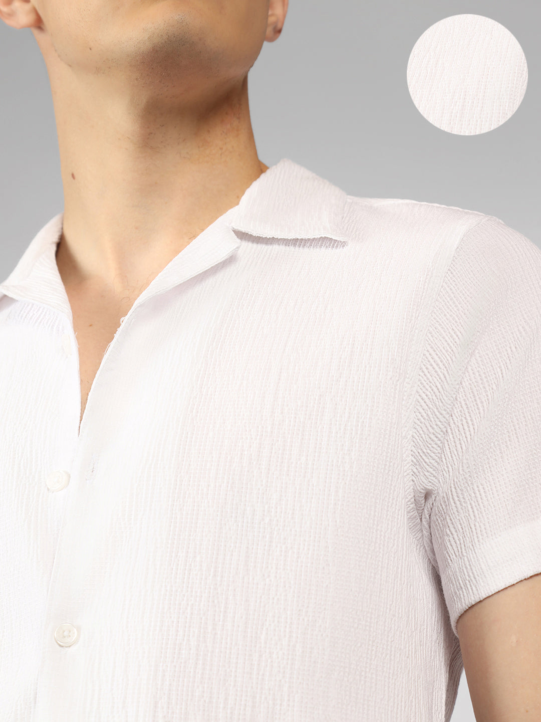 Men's White Solid Textured Cuban Collar Half sleeves relaxed fit Shirt