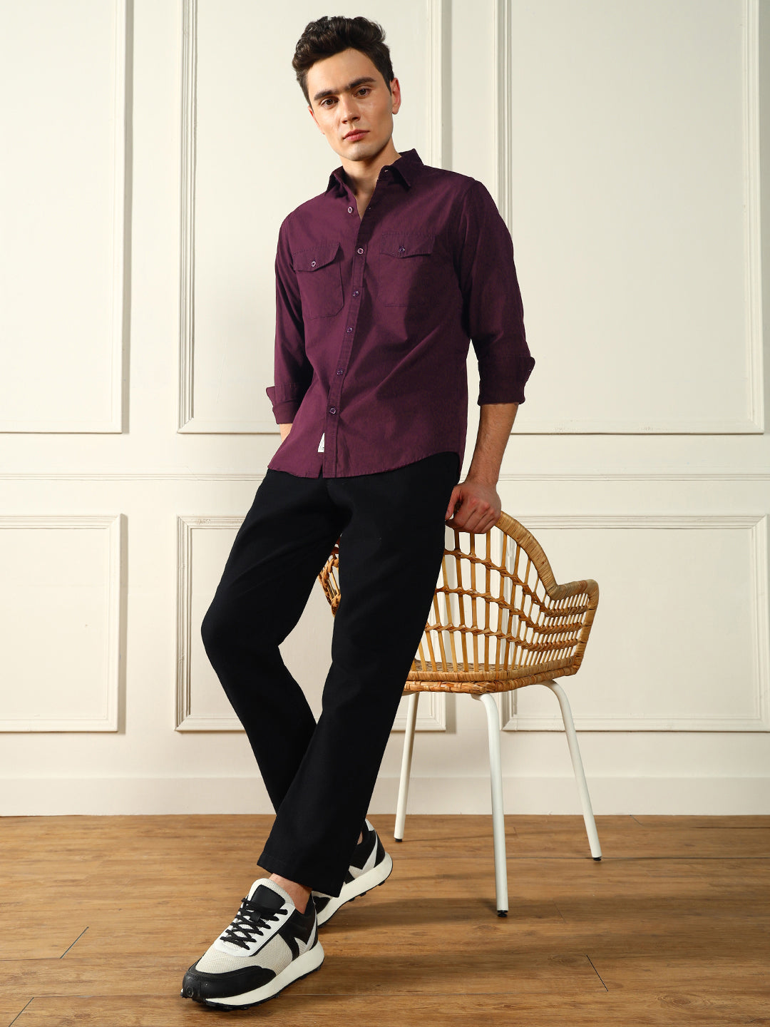 Men's Spread Collar Regular Fit Solid Wine Casual Shirt