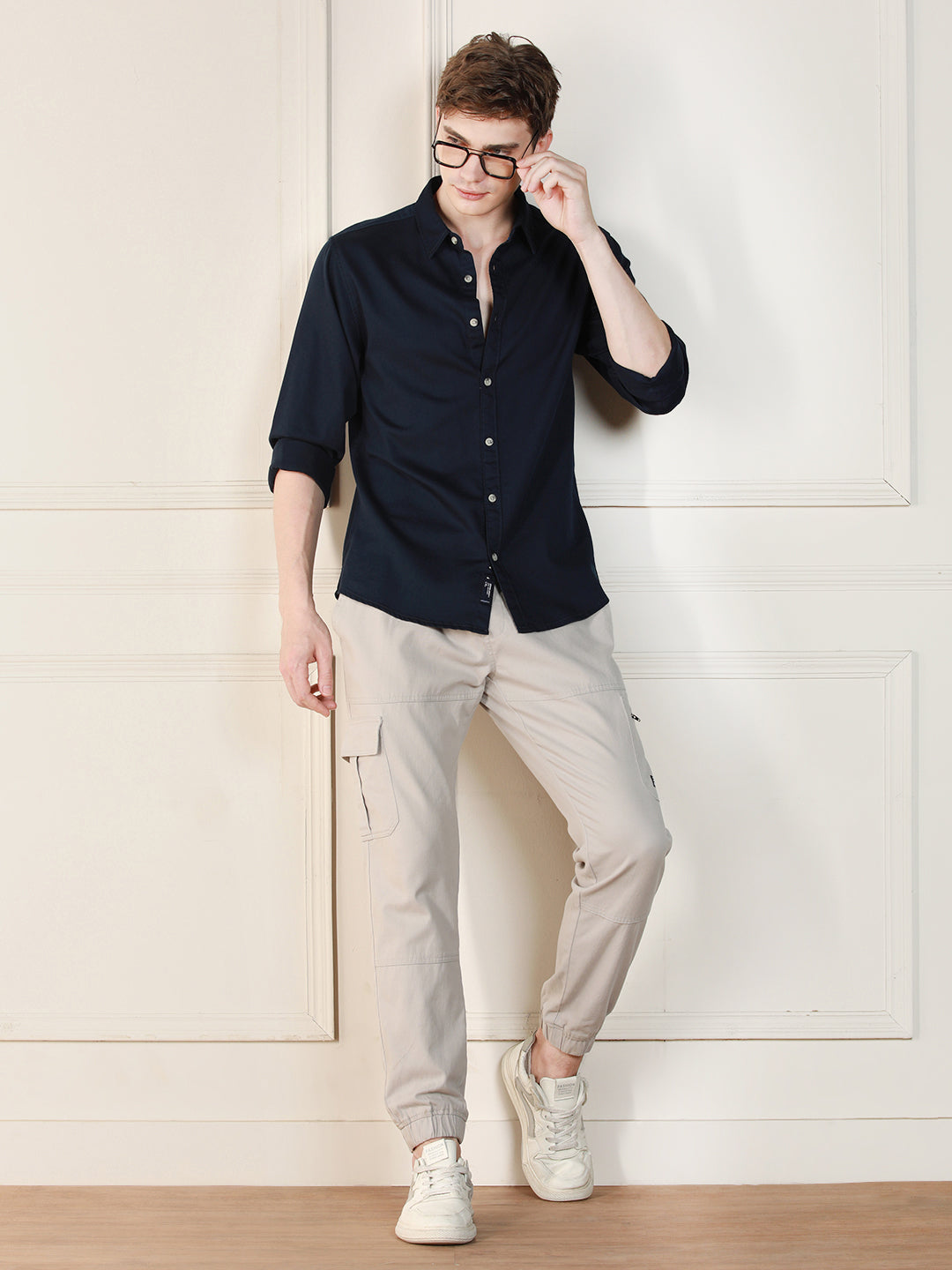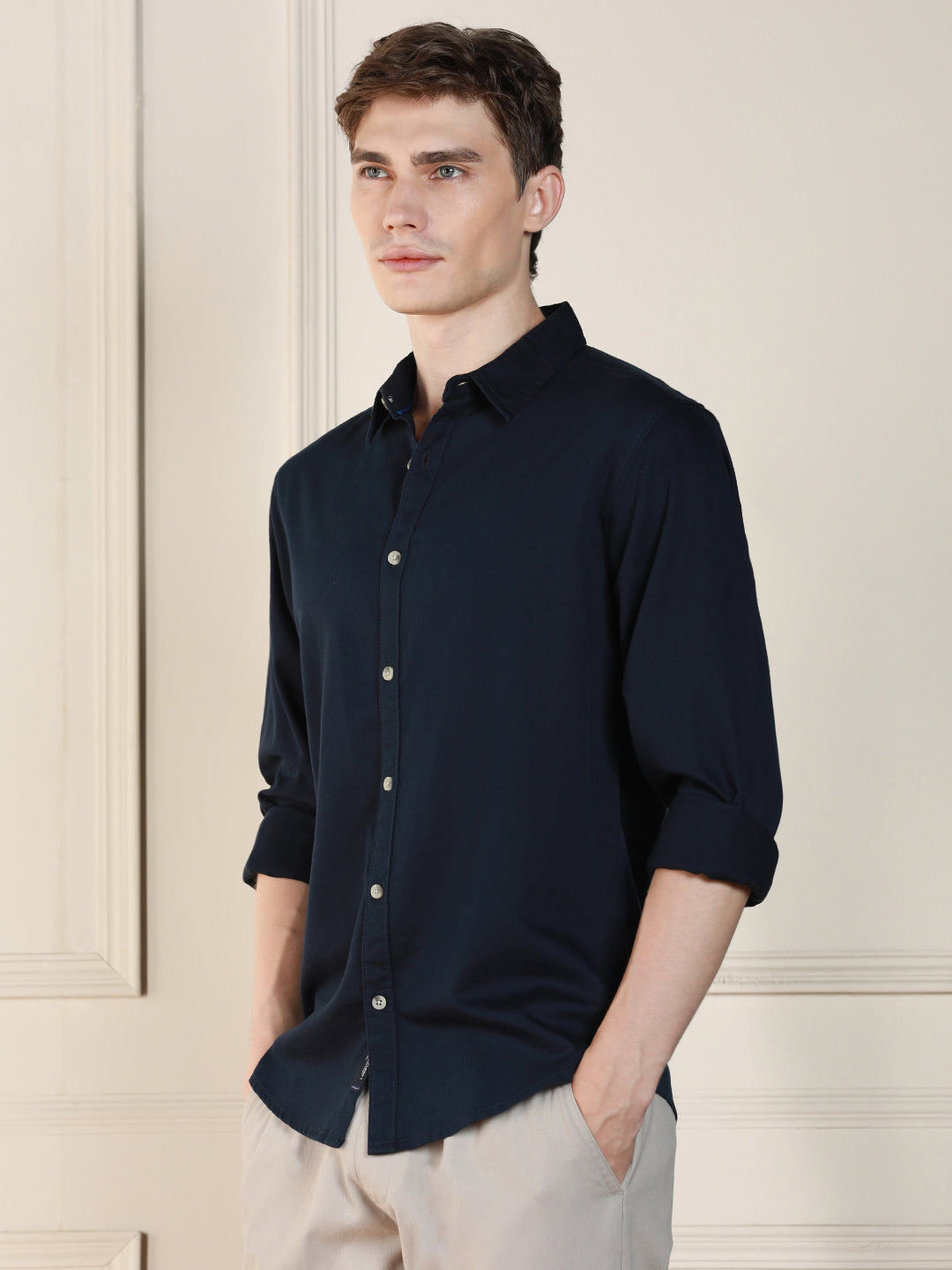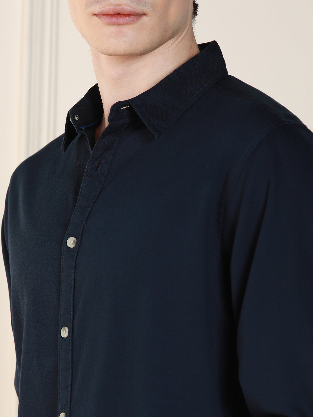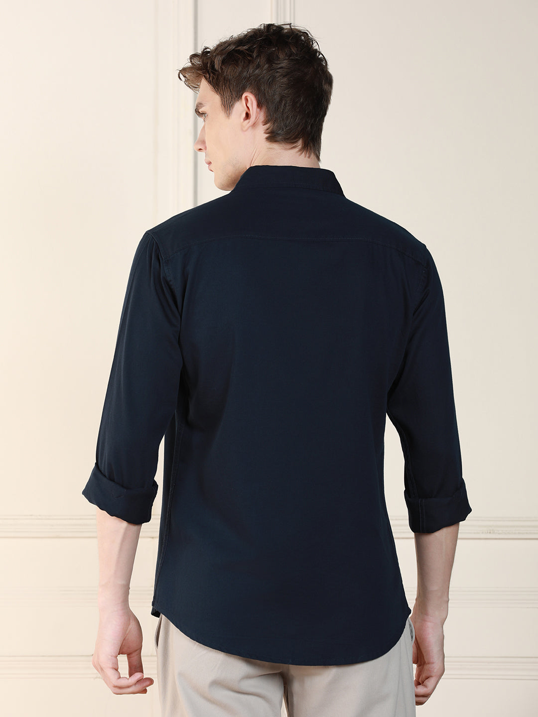 Men's Navy Blue Solid Spread Collar Long Sleeves Regular Fit Casual Shirt