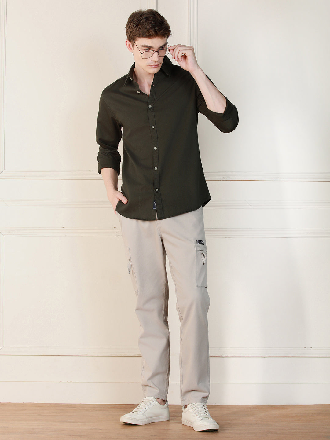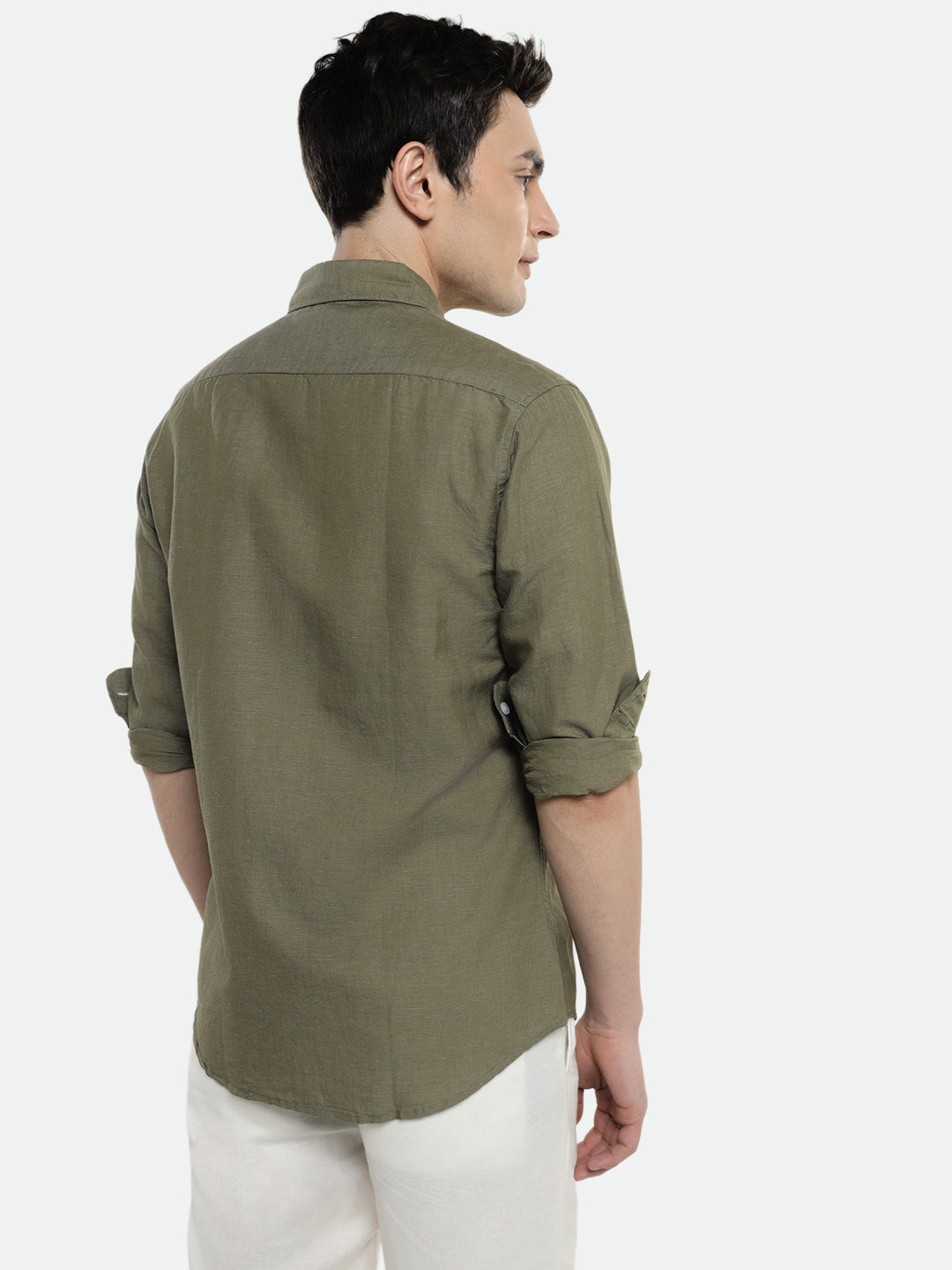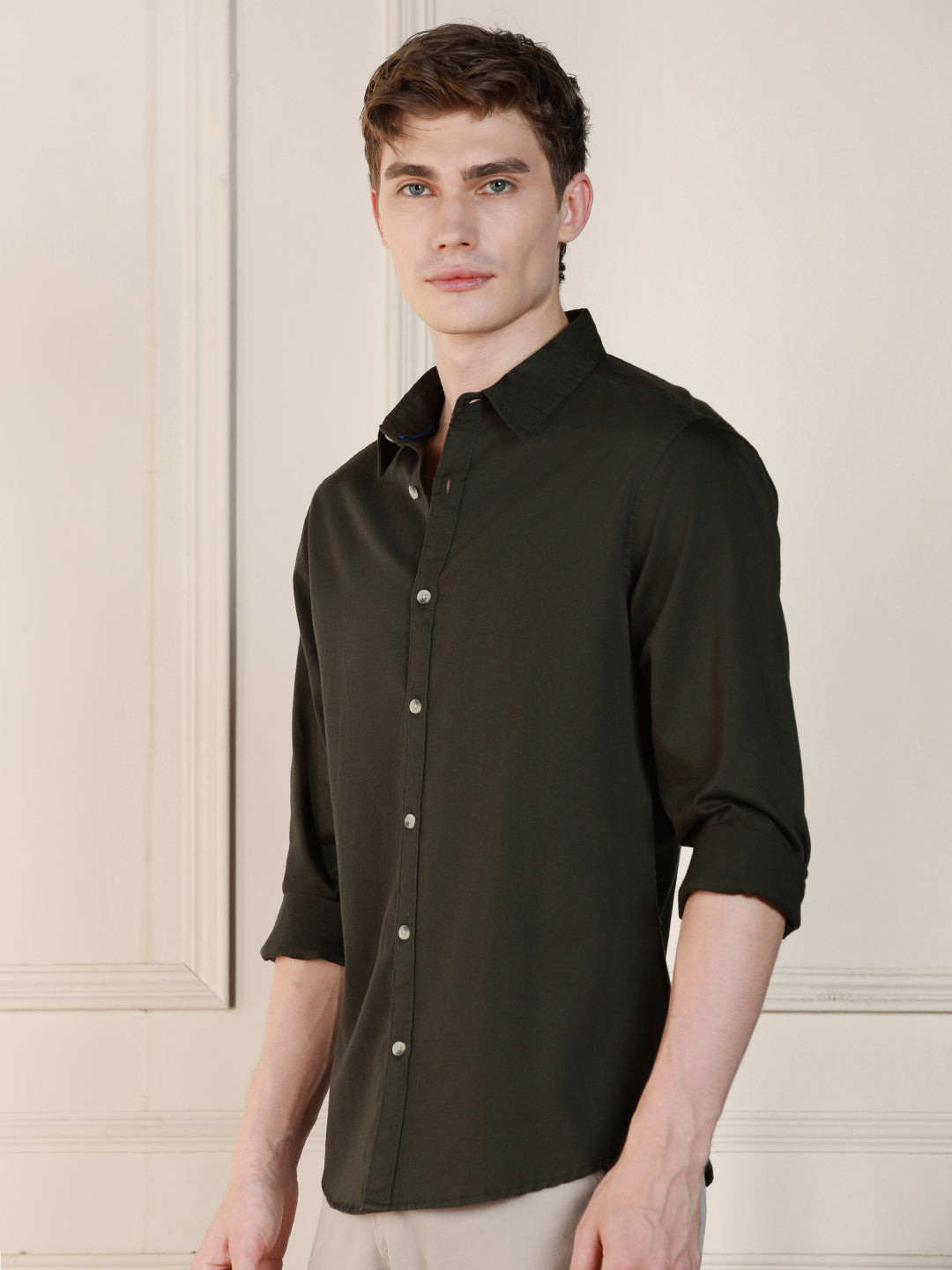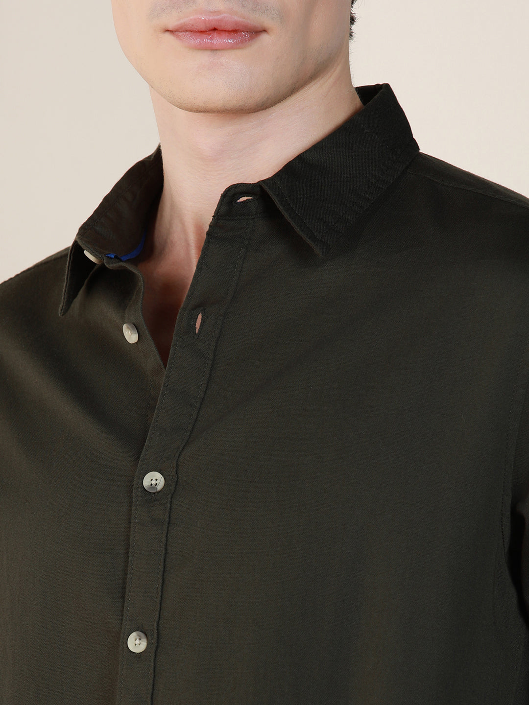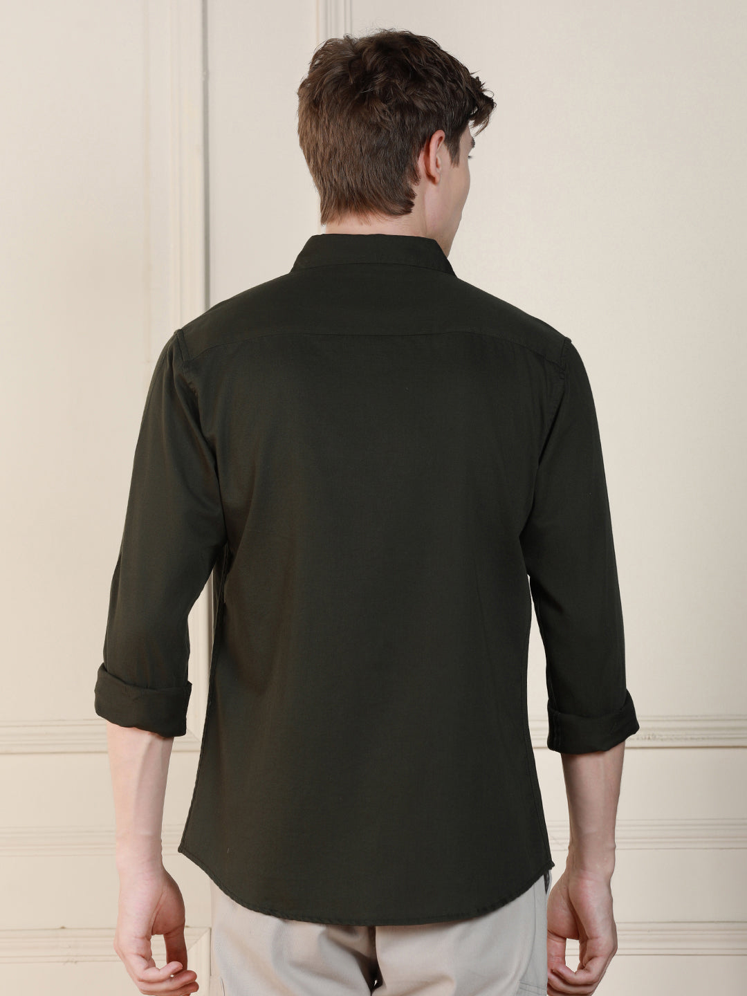 Men's Olive Solid Spread Collar Long Sleeves Regular Fit Casual Shirt