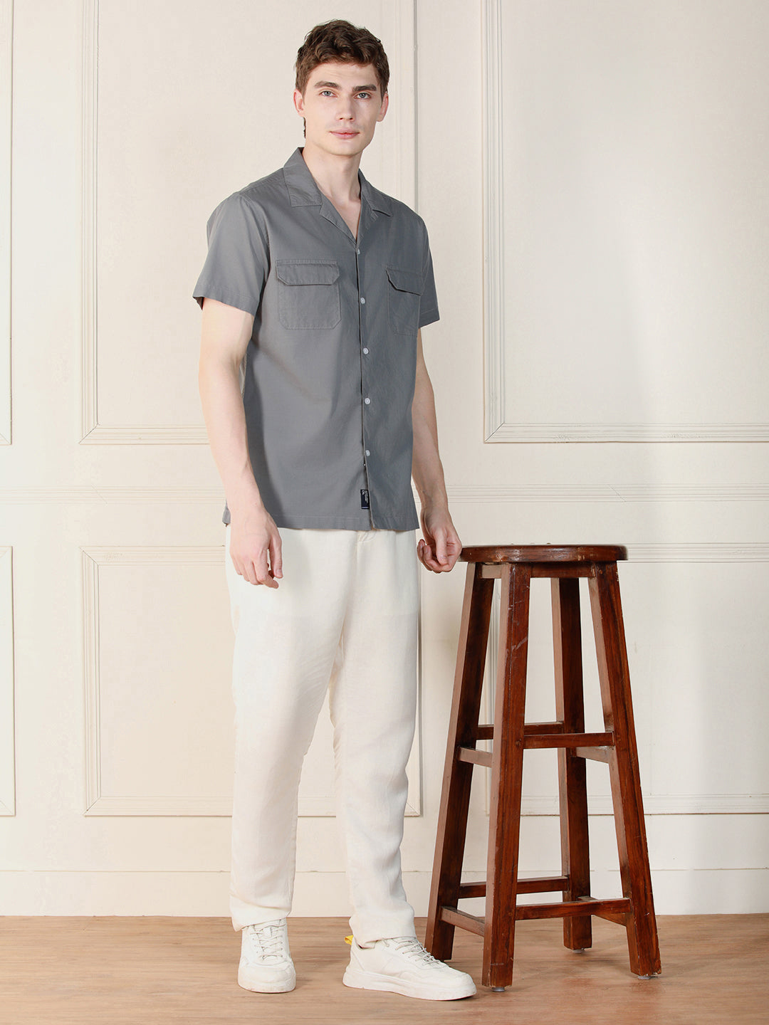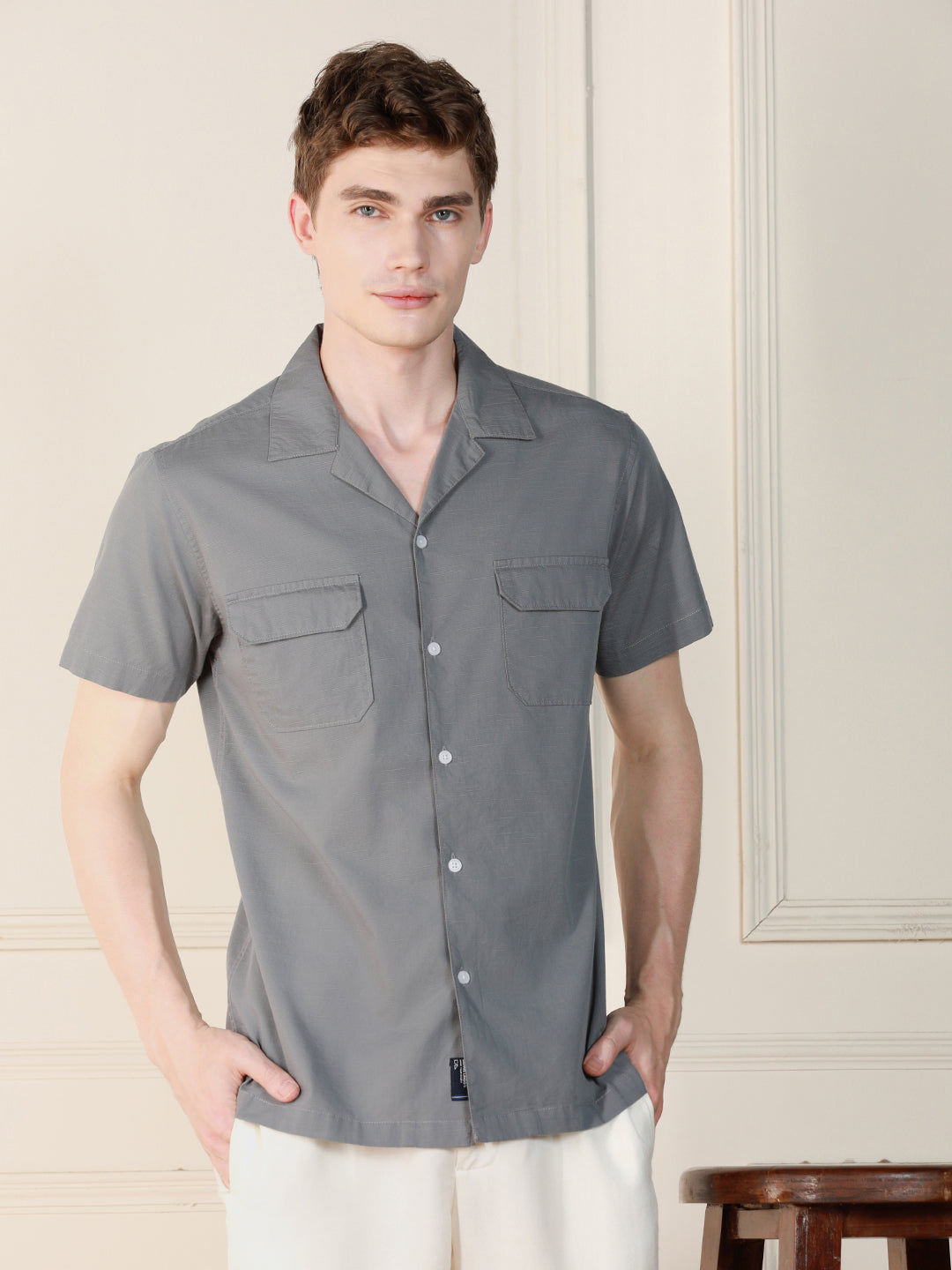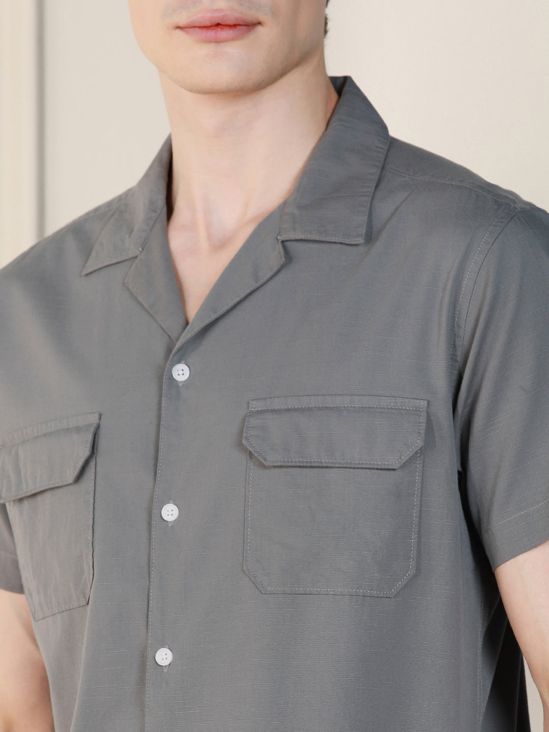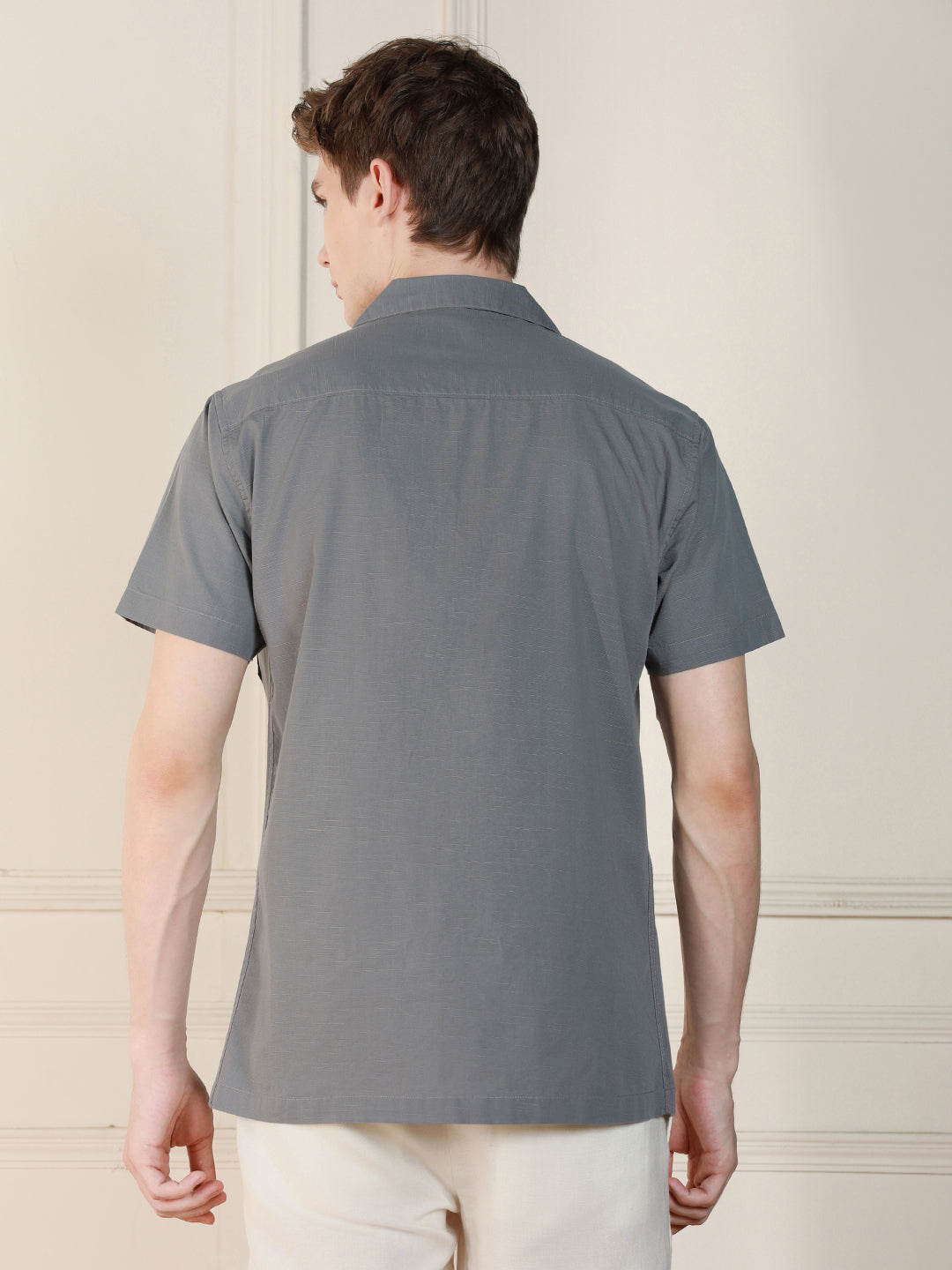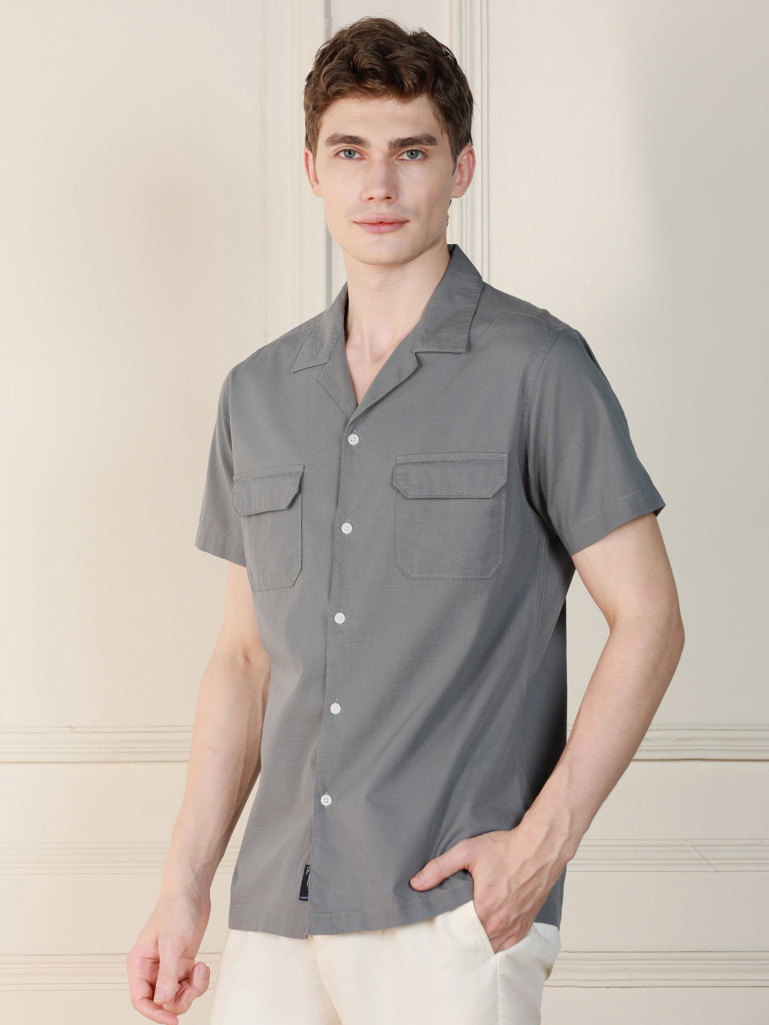 Men's Grey Solid Cuban Collar Short Sleeves Relaxed Fit Casual Shirt