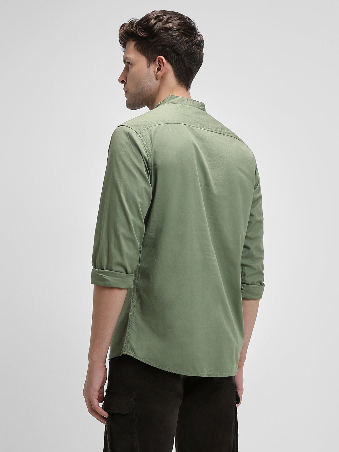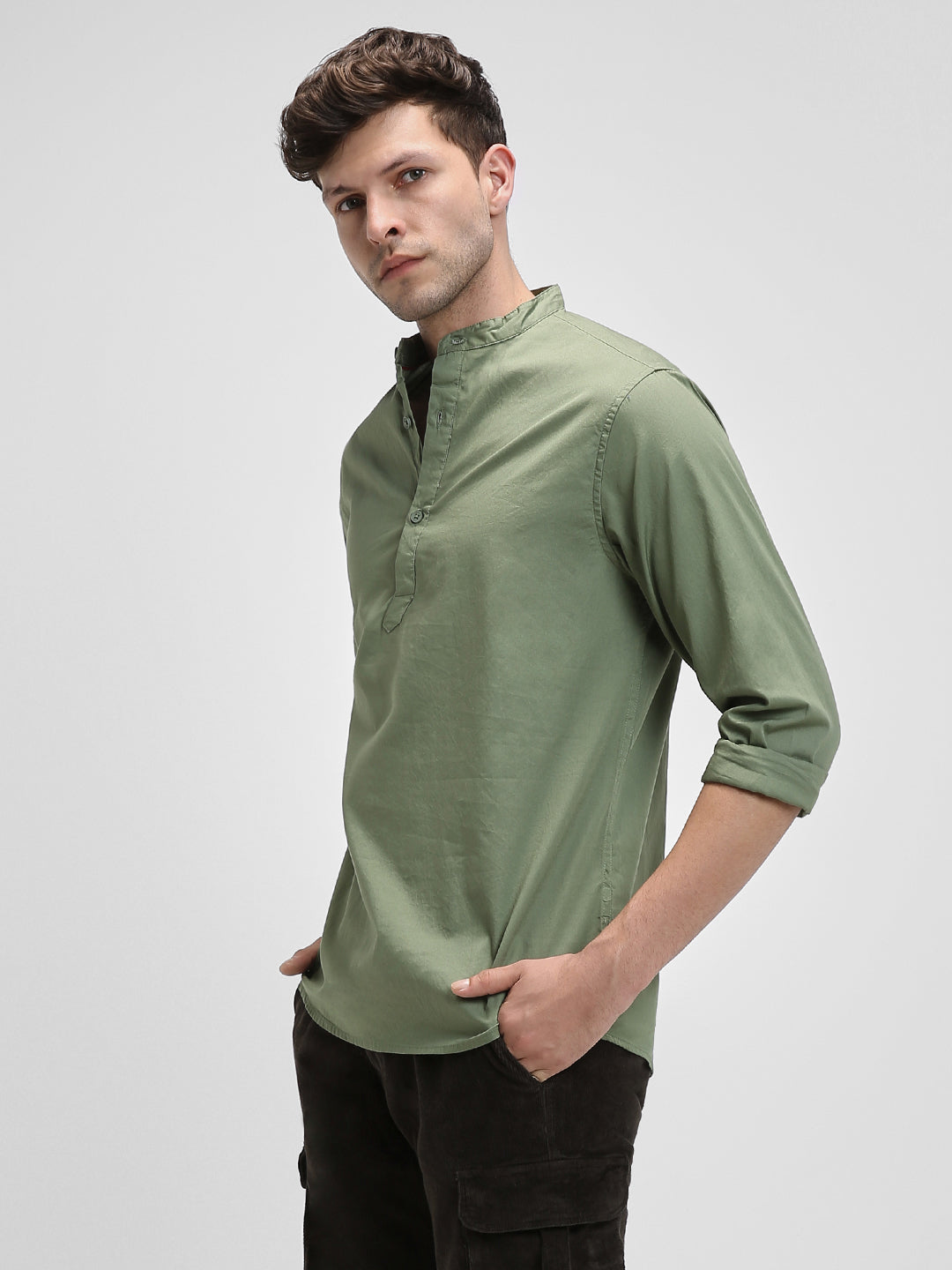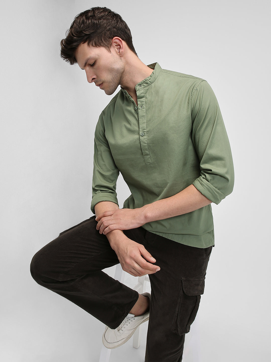 Men's Pop Over Mandarin Collar Slim Fit Solid Green Casual Shirt