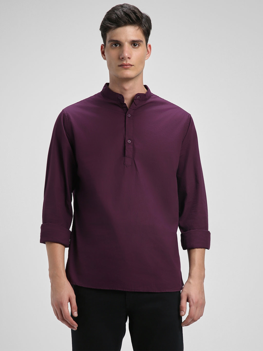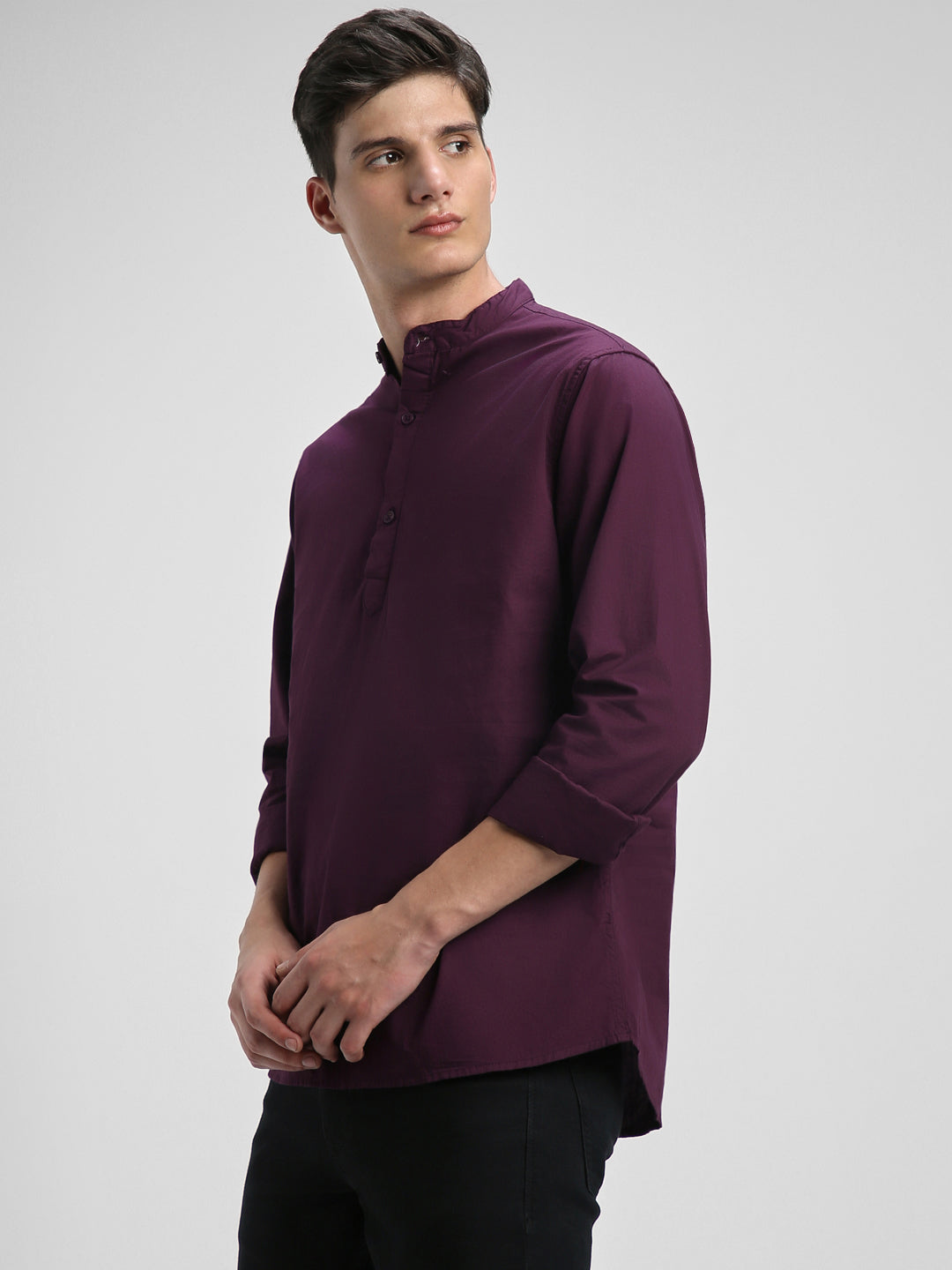 Men's Pop Over Mandarin Collar Slim Fit Solid Purple Casual Shirts