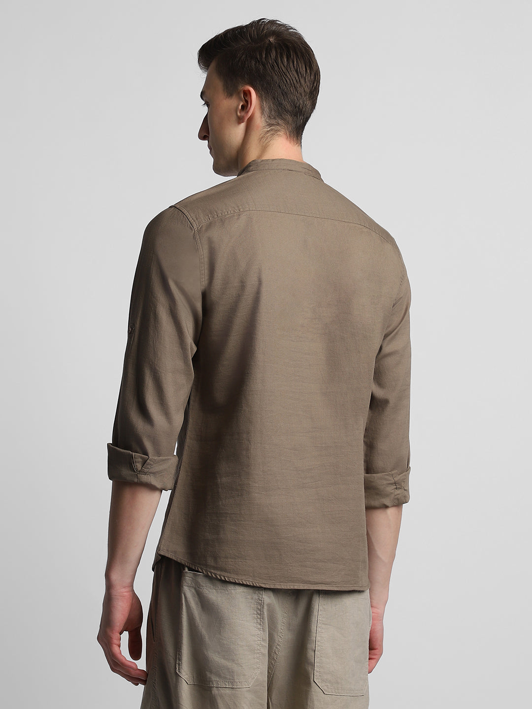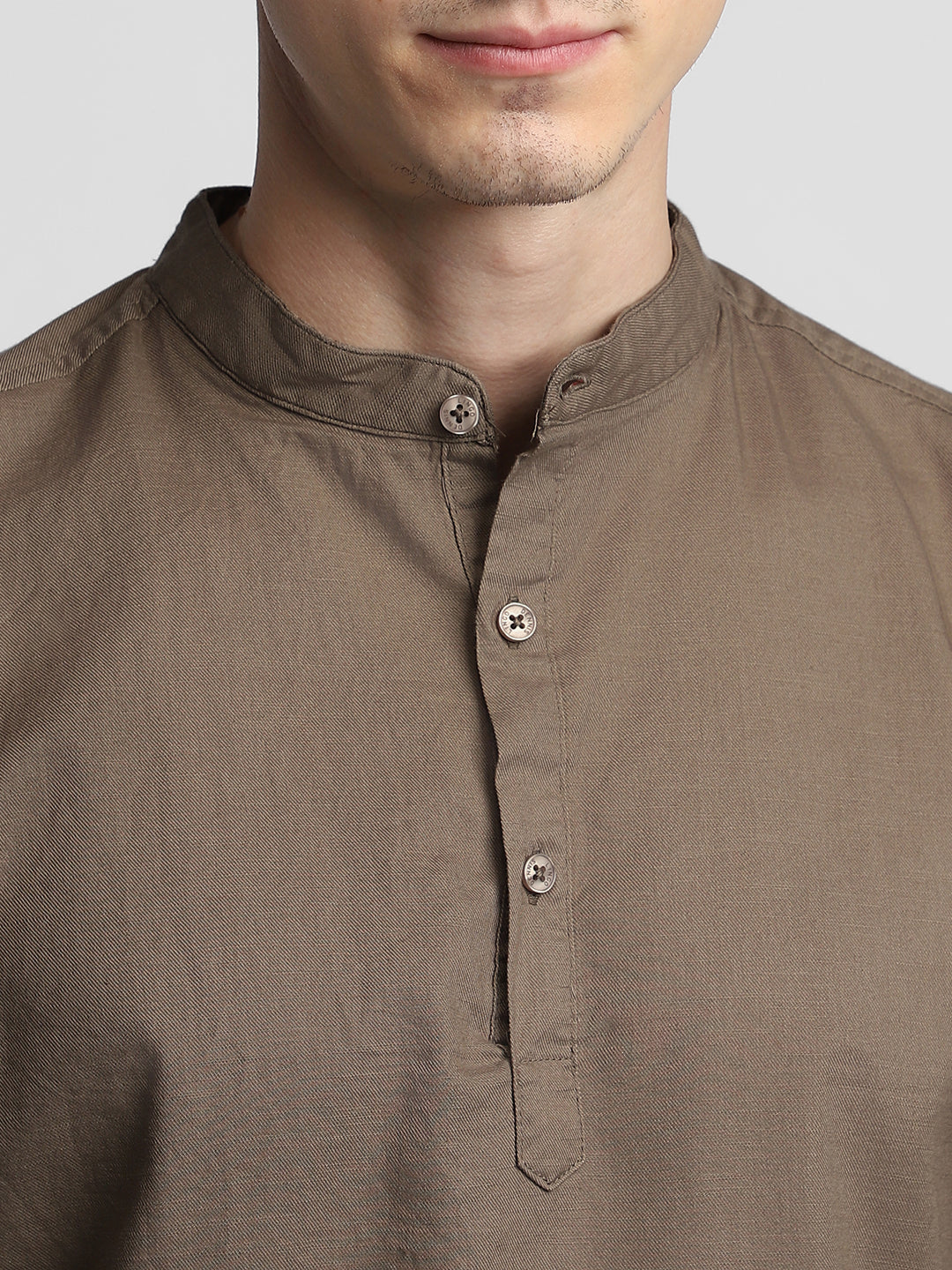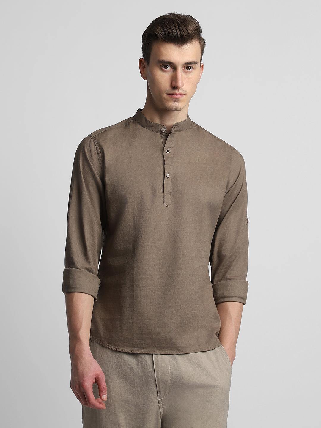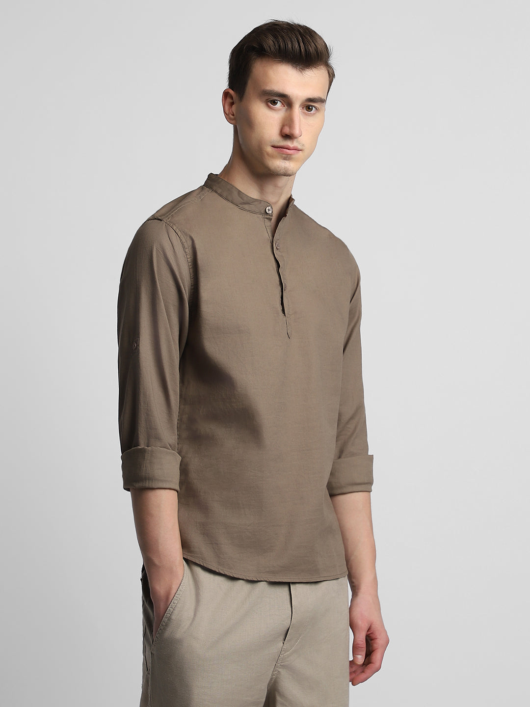 Men's Pop Over Mandarin Collar Slim Fit Solid Brown Casual Shirts