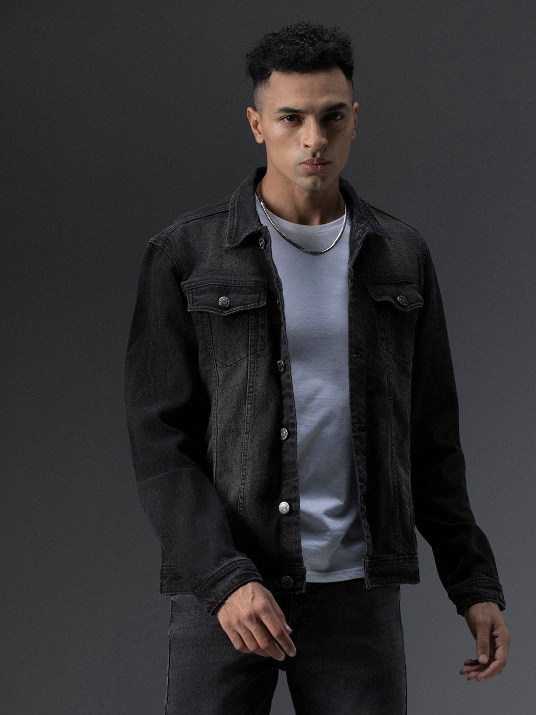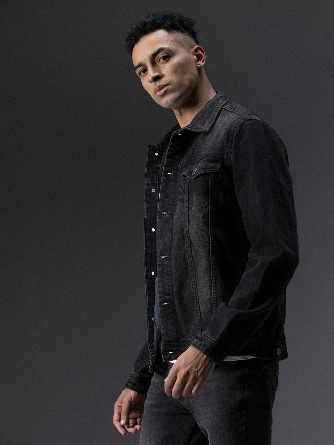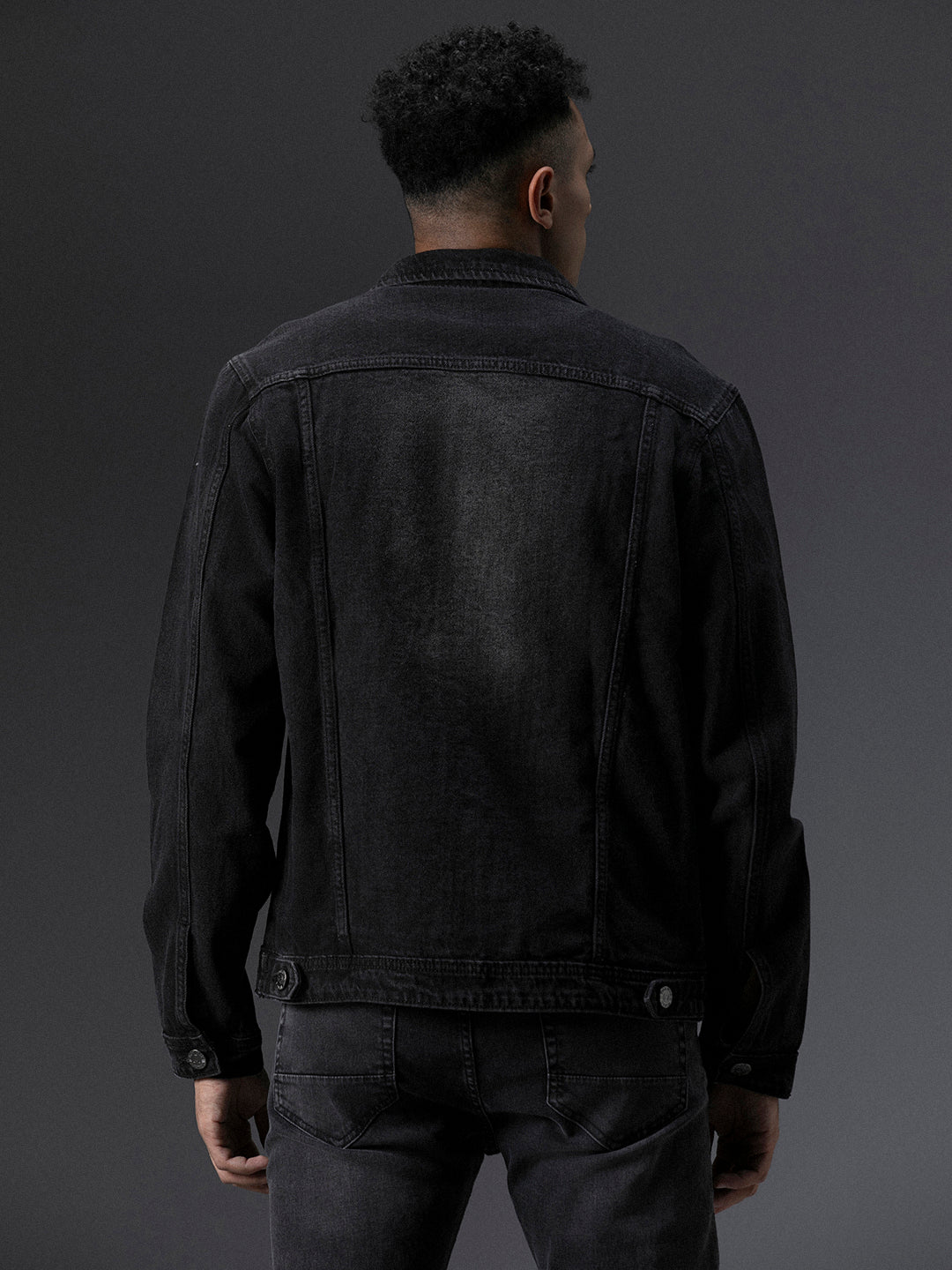Men's Regular Fit Long Sleeve Button Down Panel Denim Jacket (Black)