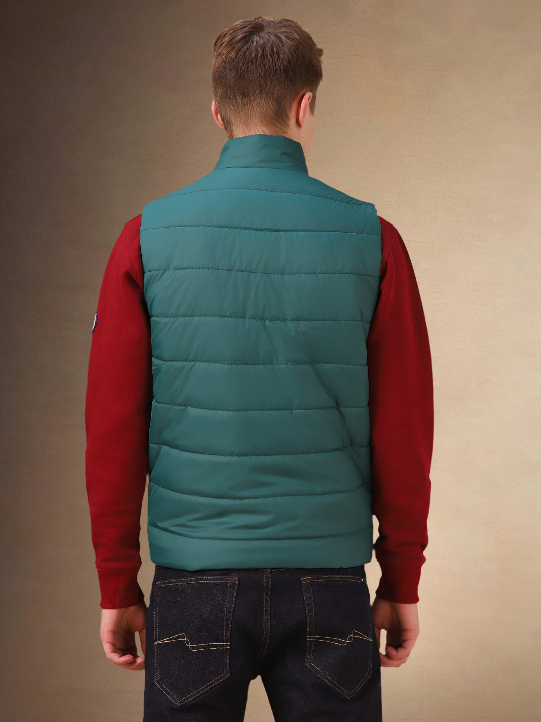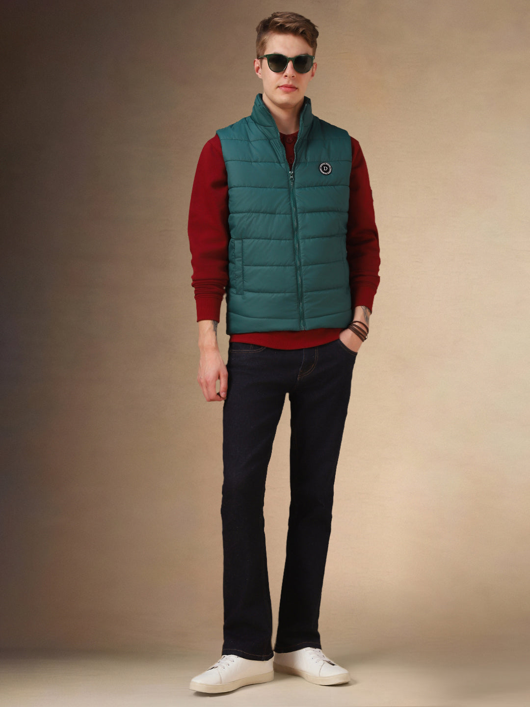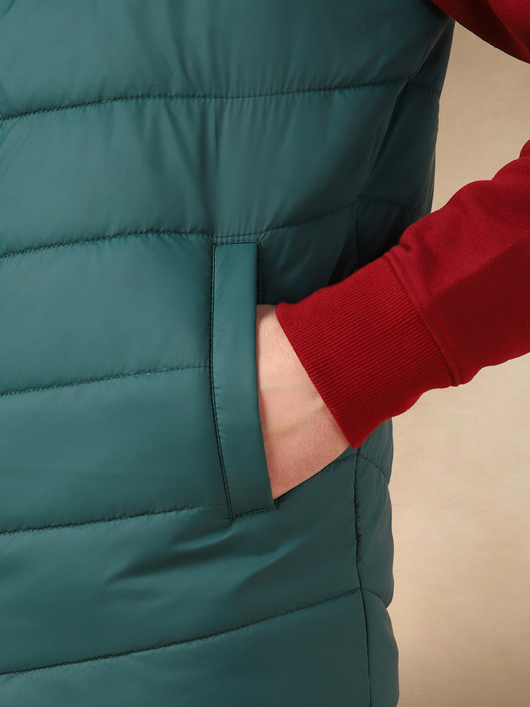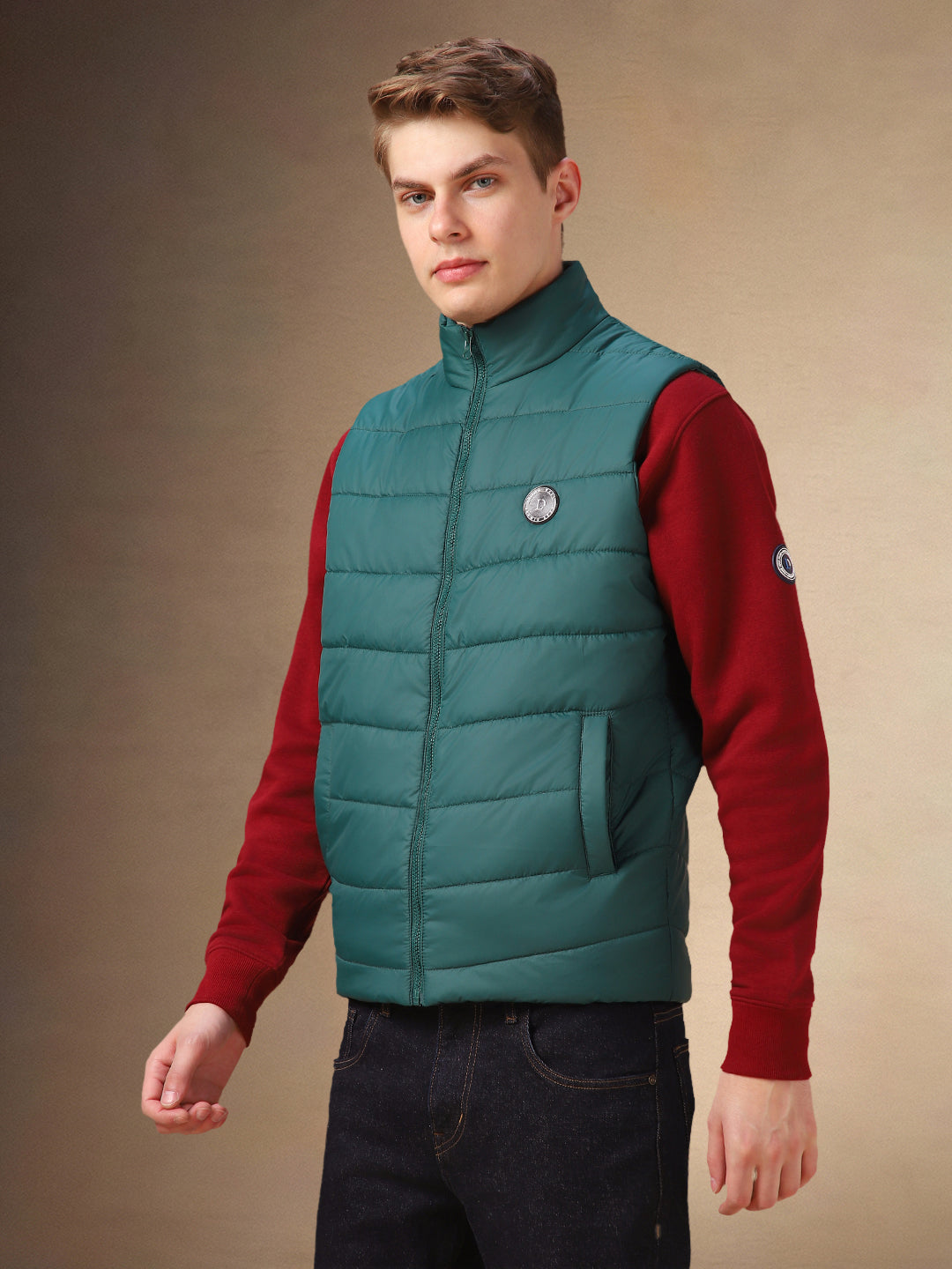 Men's Green Solid Mock Collar Sleeveless Jacket