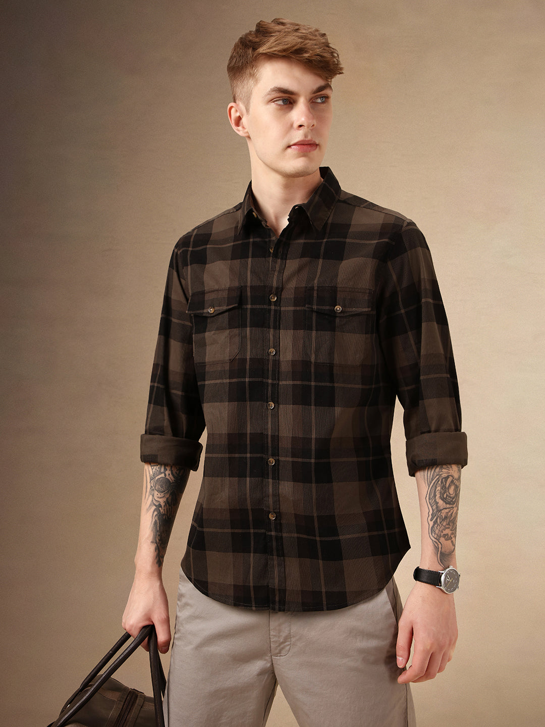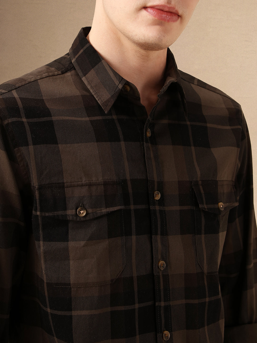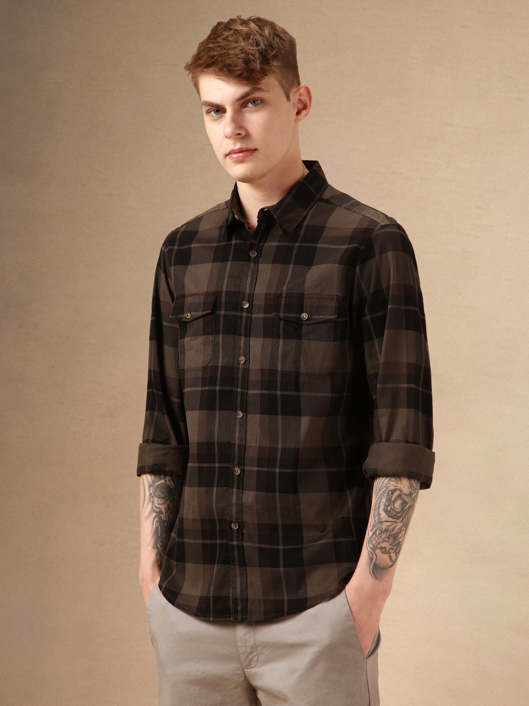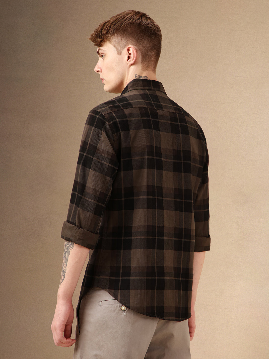 Men's Brown Checks Spread Collar Full Sleeves Regular Fit Shirt