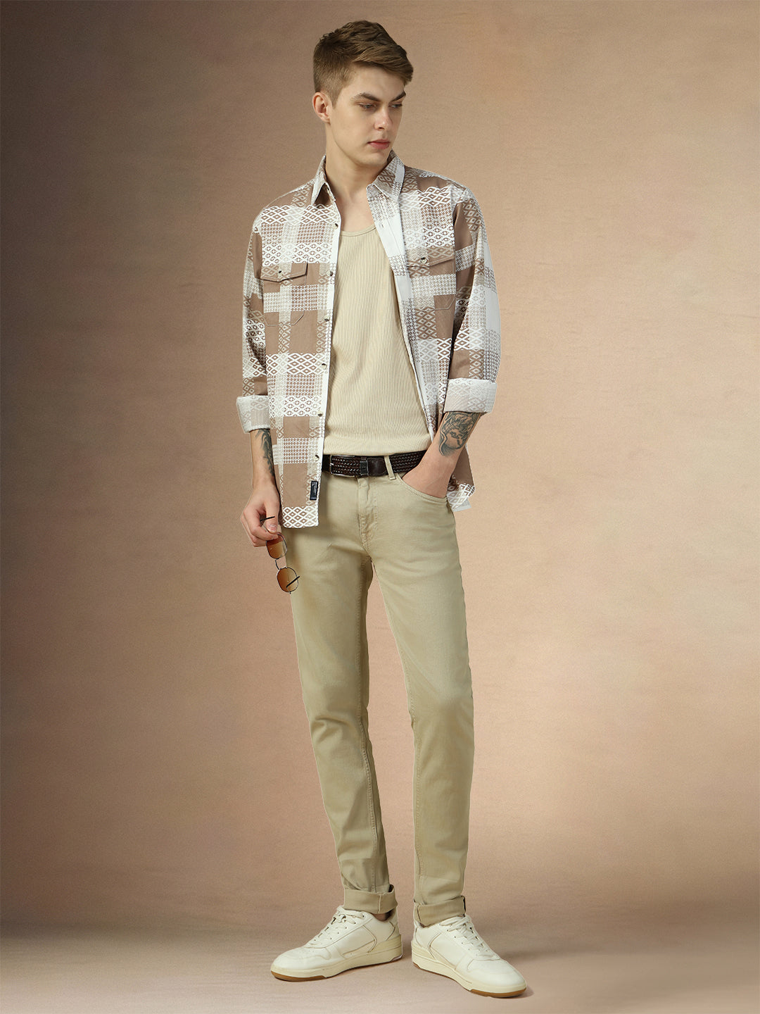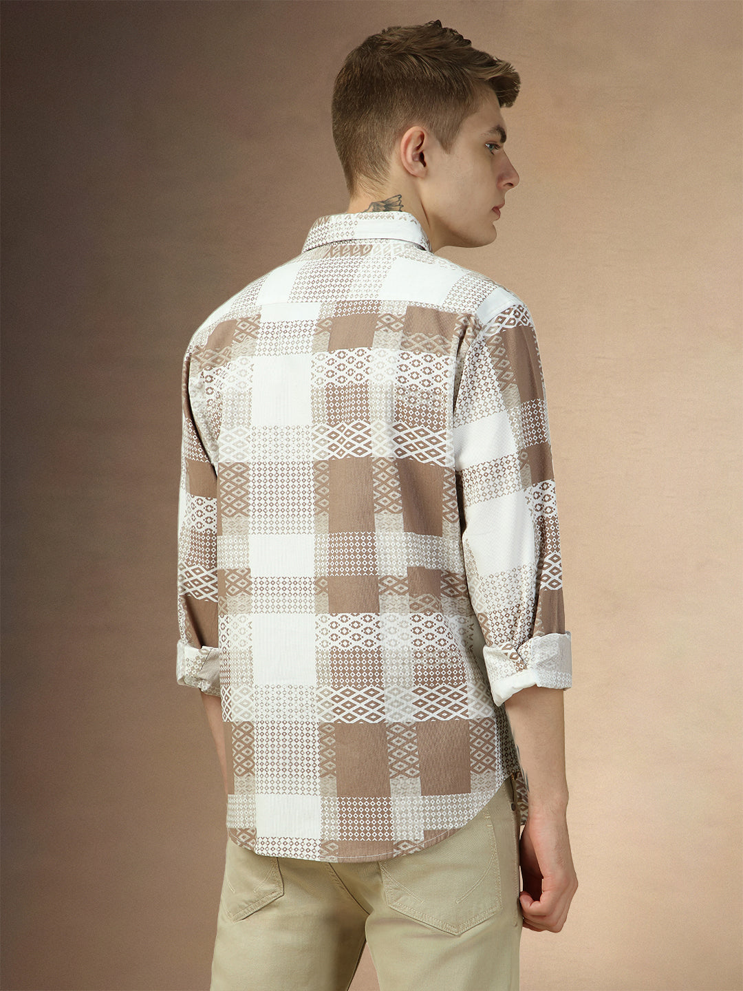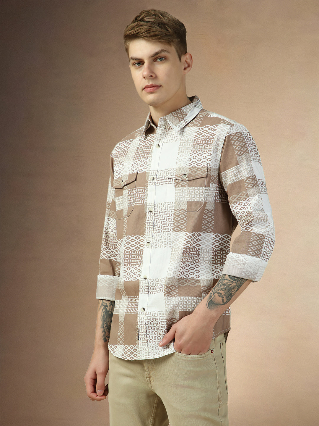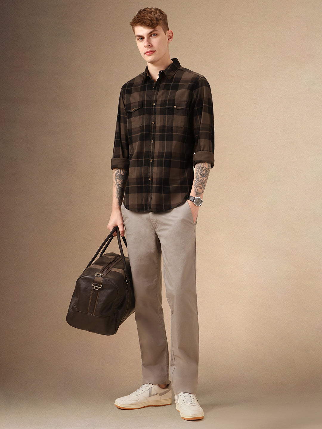 Men's Brown Checks Spread Collar Full Sleeves Regular Fit Shirt