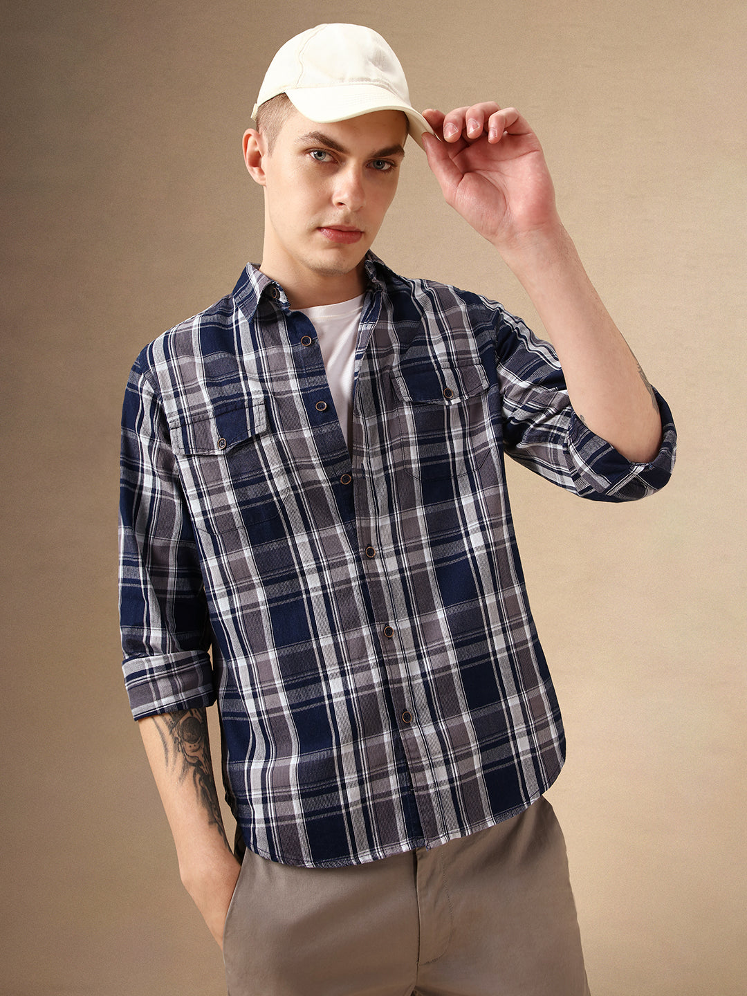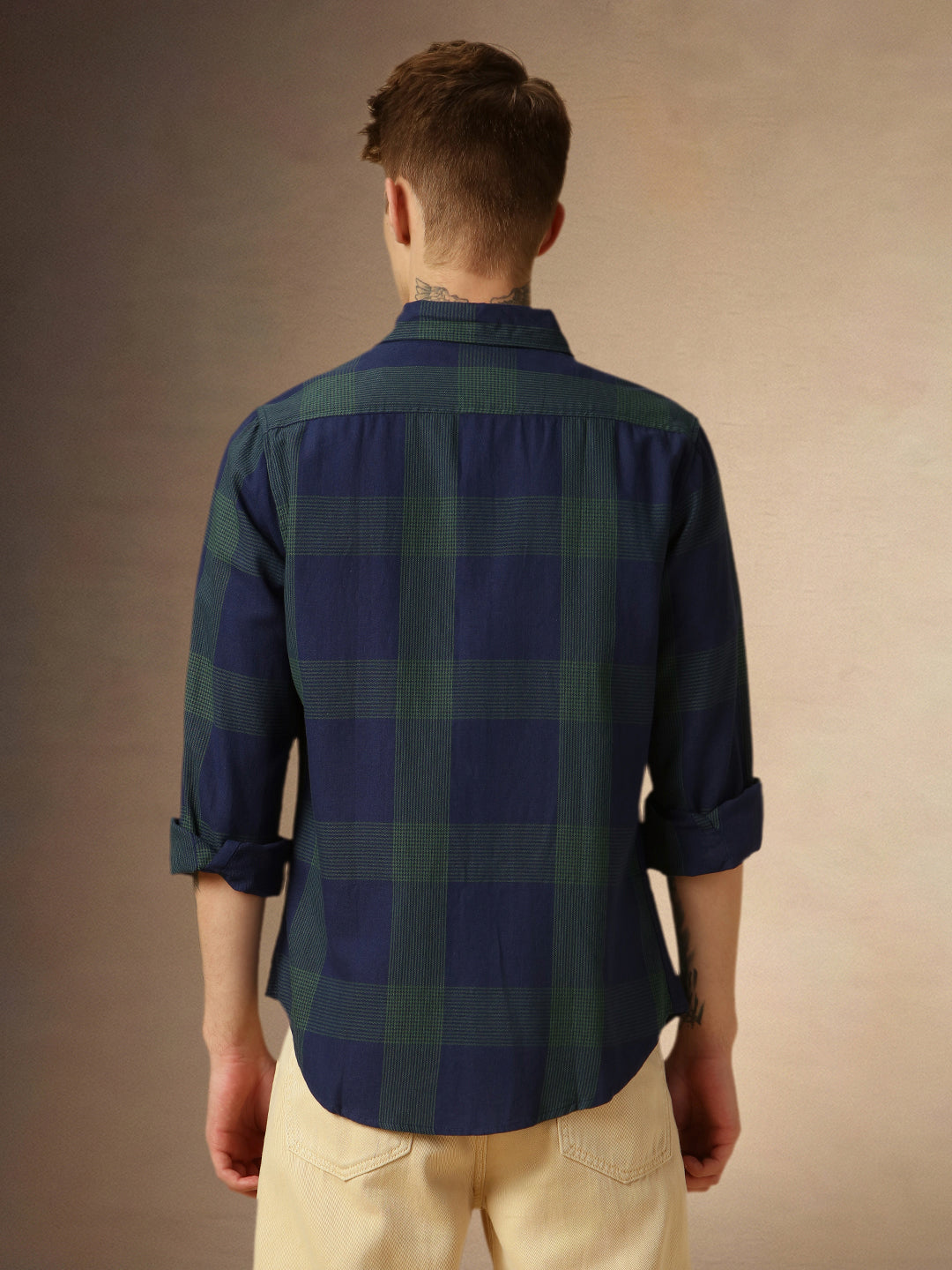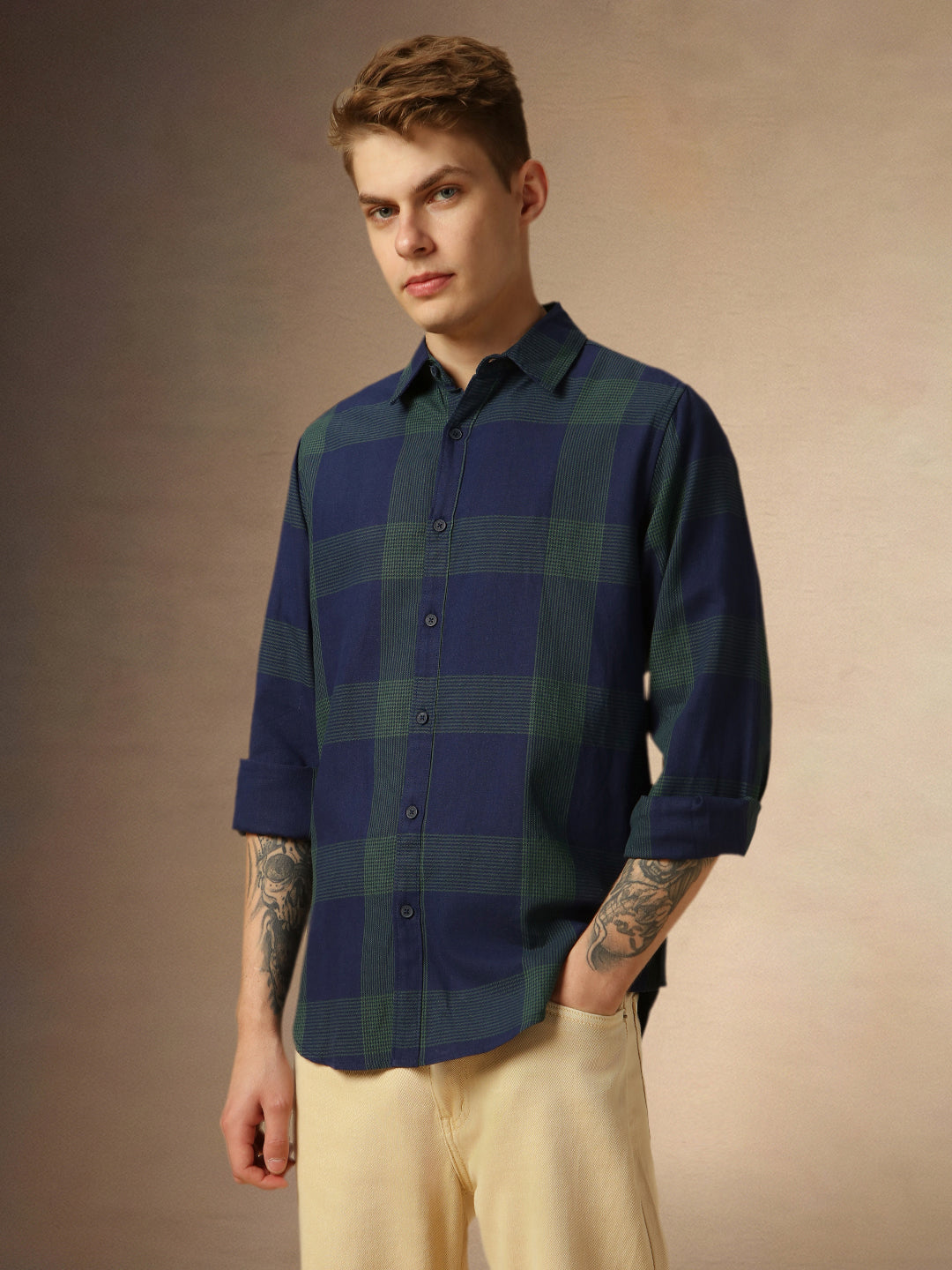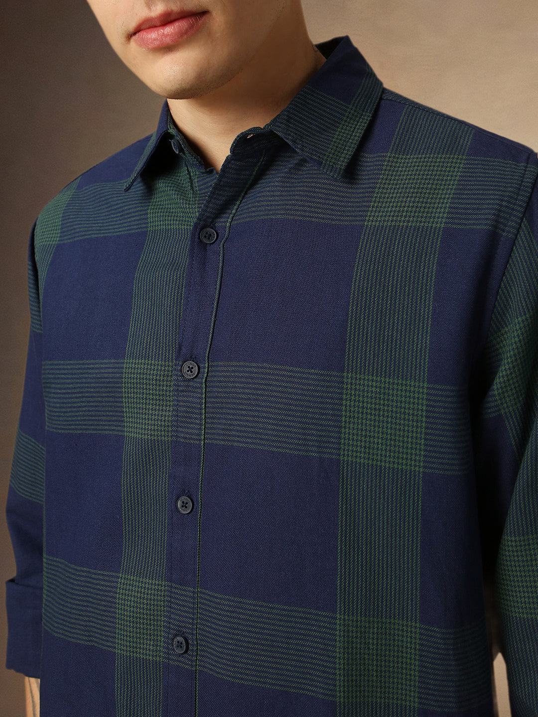 Men's Navy Blue Checks Spread Collar Full Sleeves Regular Fit Shirt