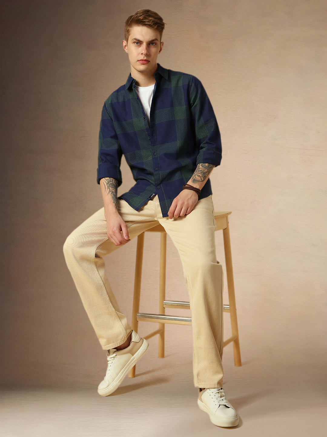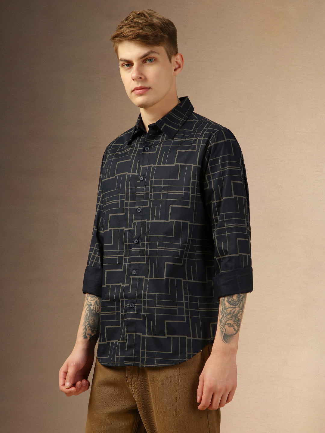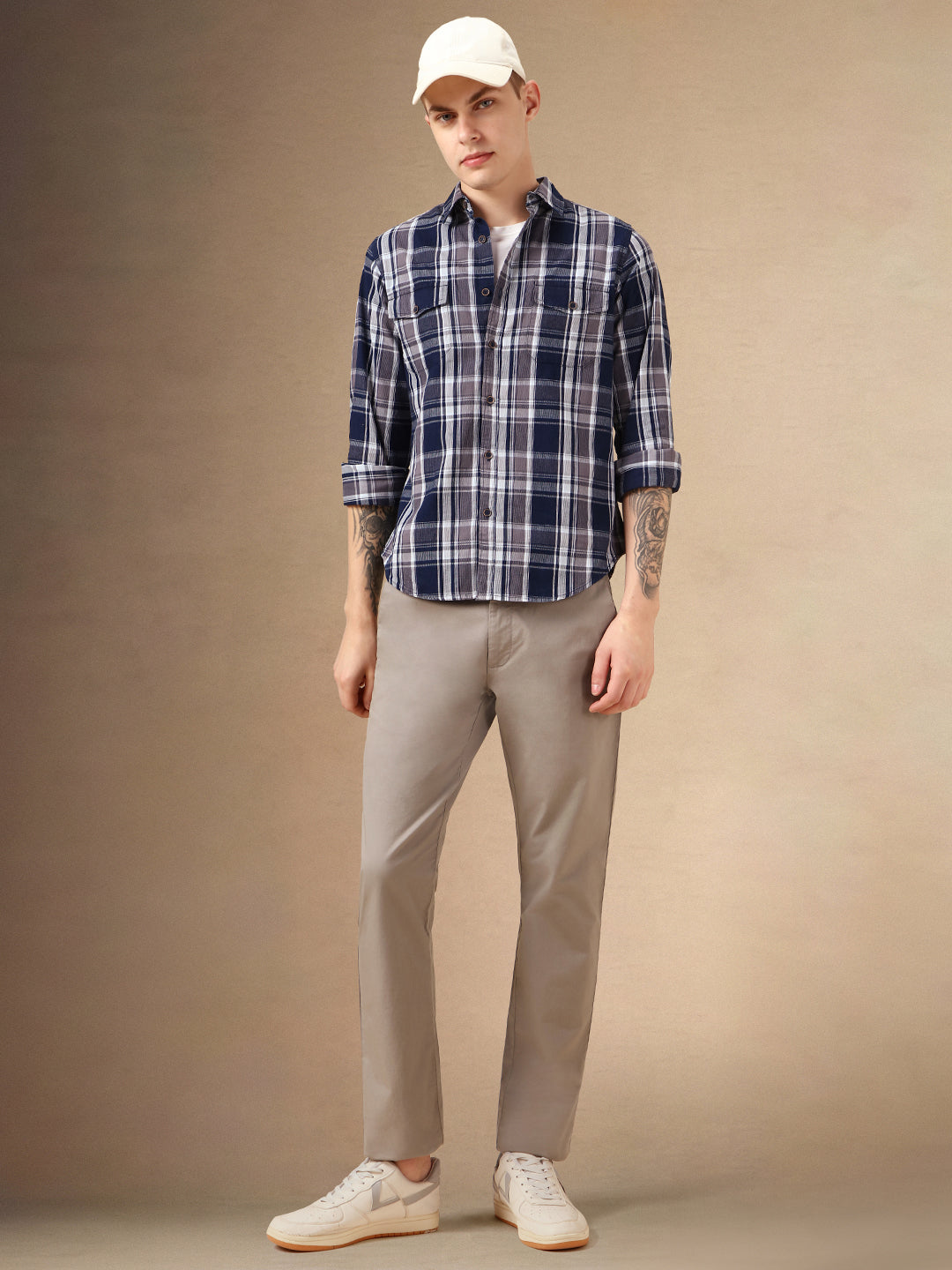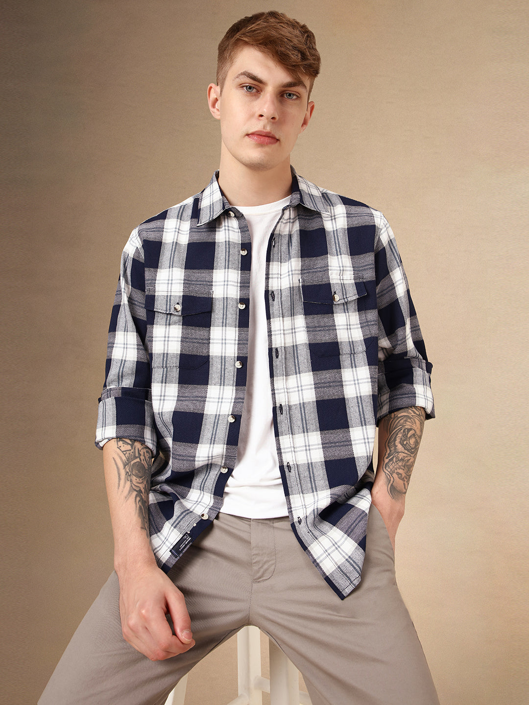 Men's Navy Blue Checks Spread Collar Full Sleeves Regular Fit Shirt