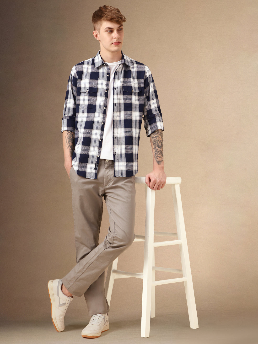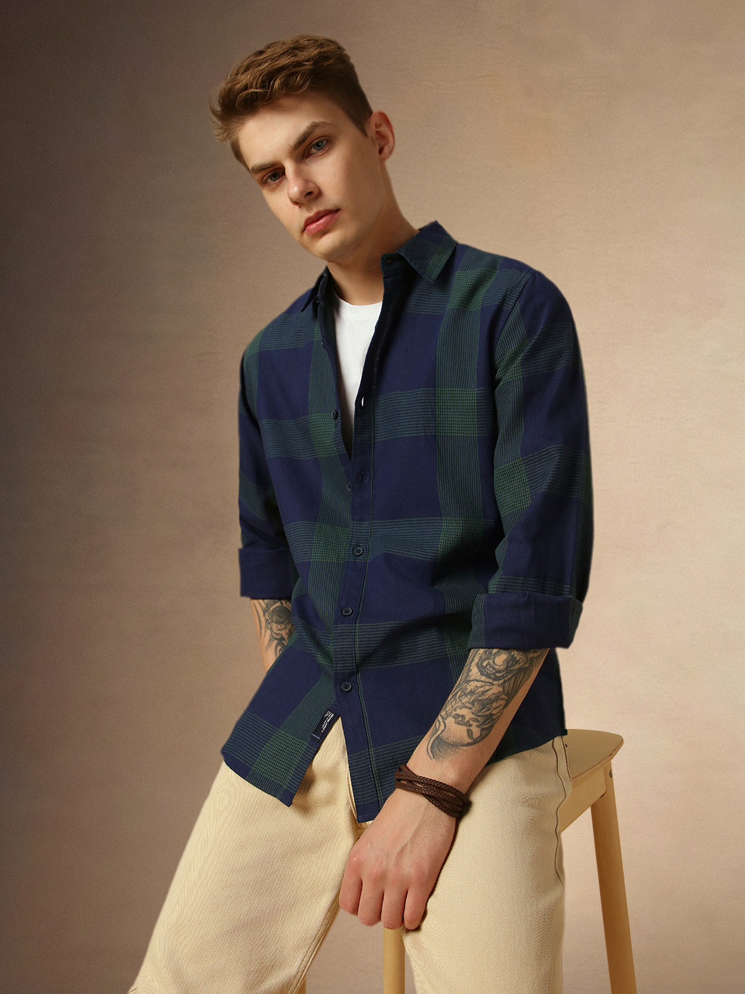 Men's Navy Checks Spread Collar Full Sleeves 100% Cotton Casual Shirt