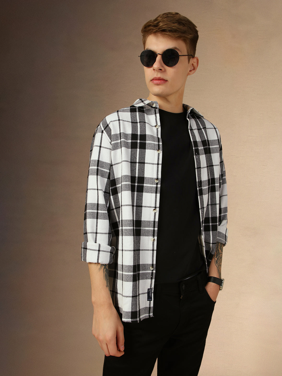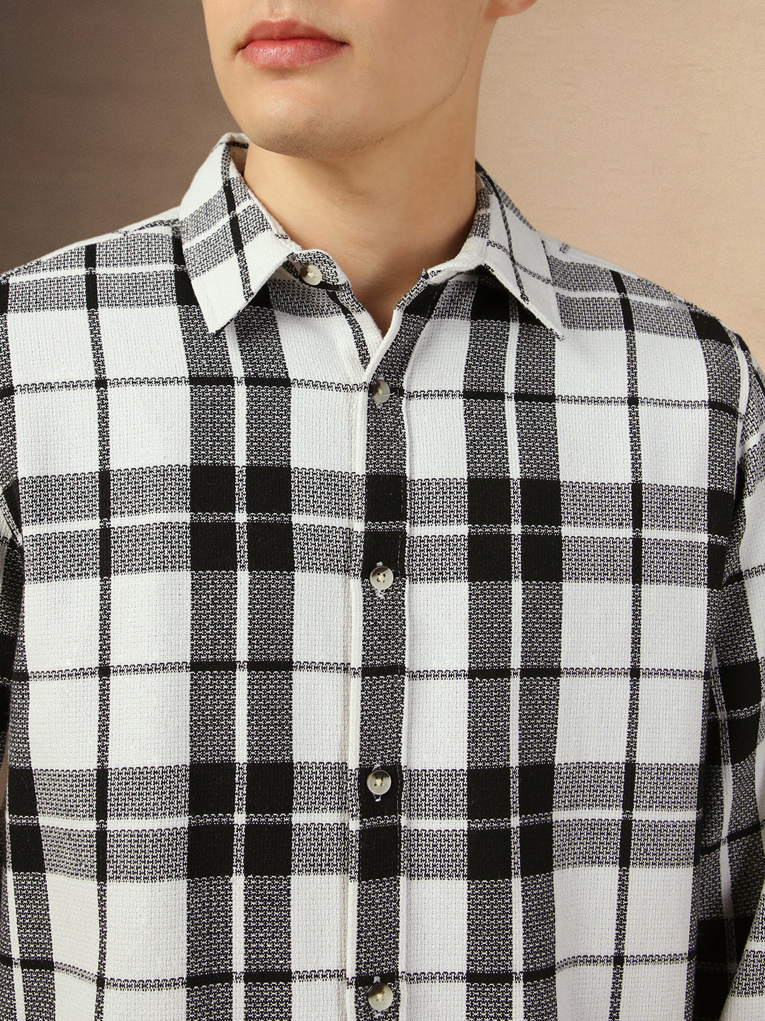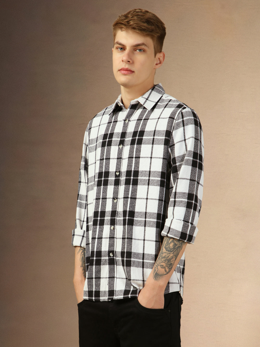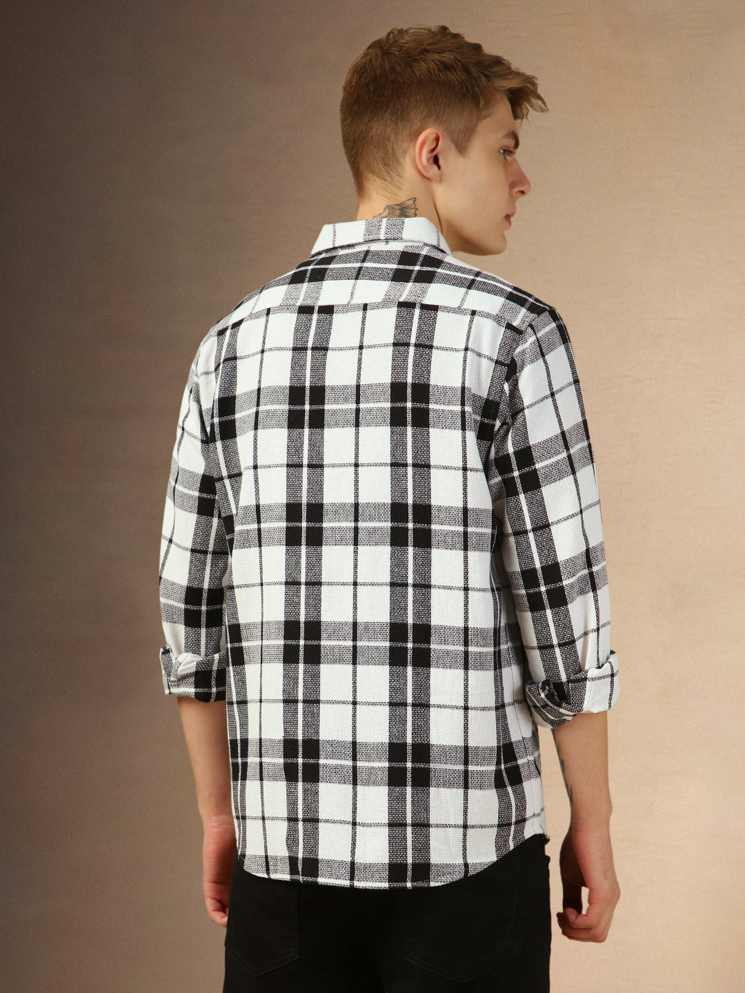 Men's White Checks Spread Collar Full Sleeves 100% Cotton Casual Shirt