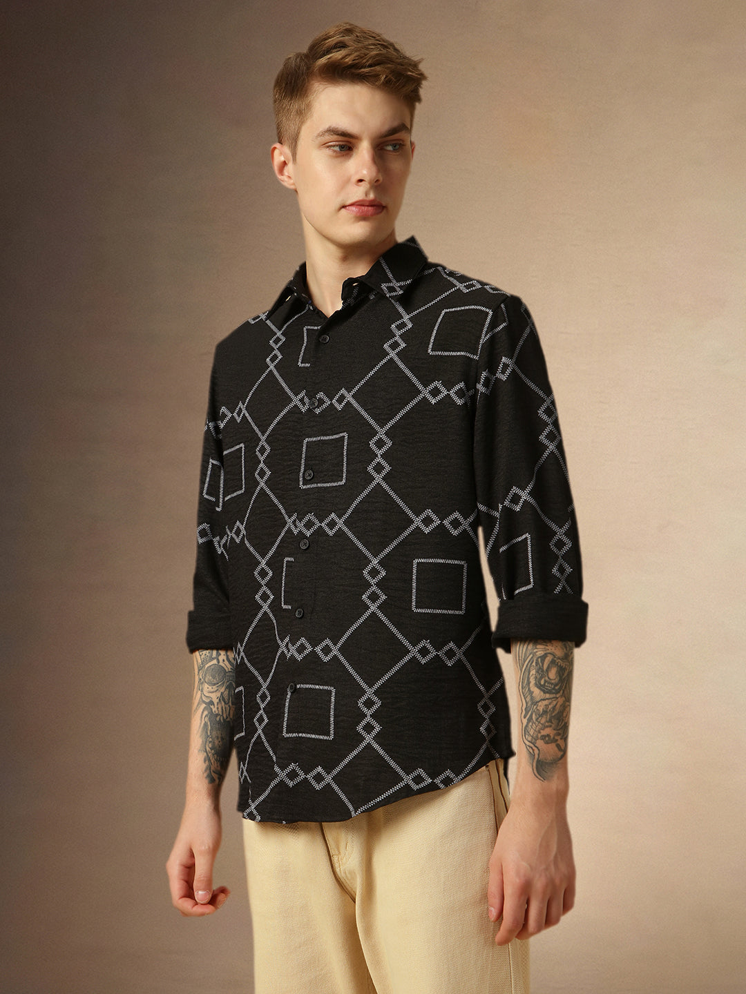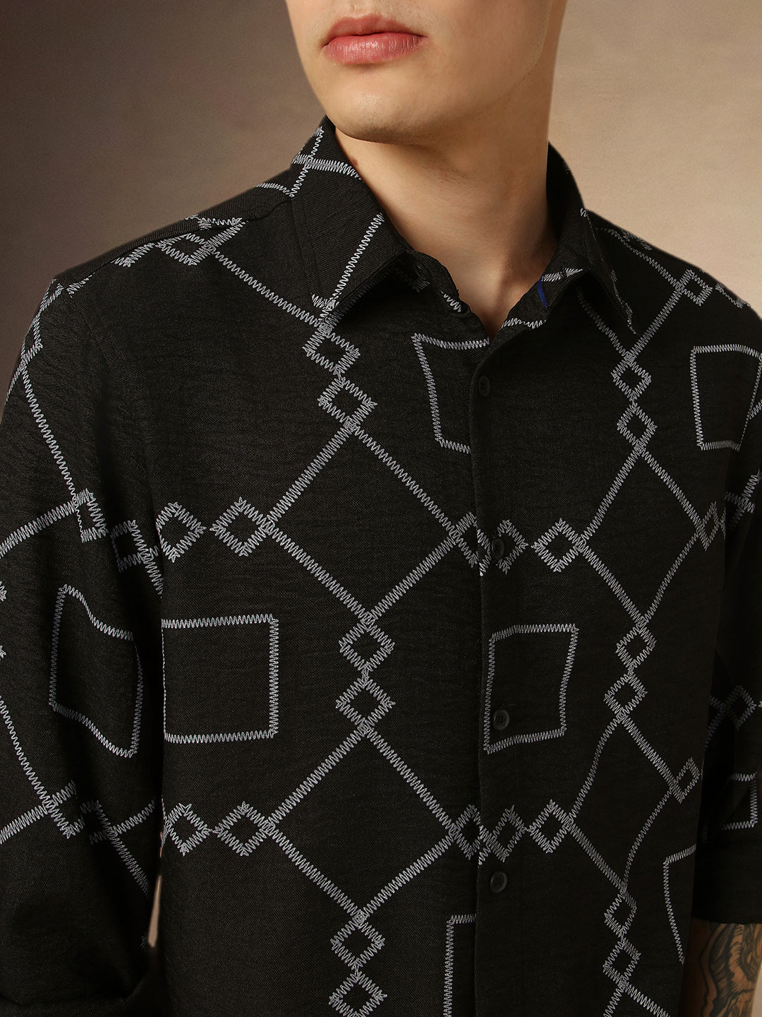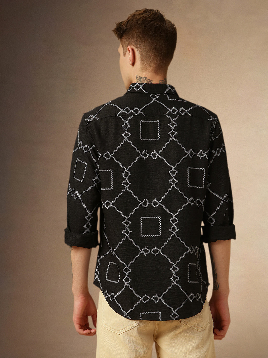 Men's Black Printed Spread Collar Full Sleeves Relaxed Fit Shirt