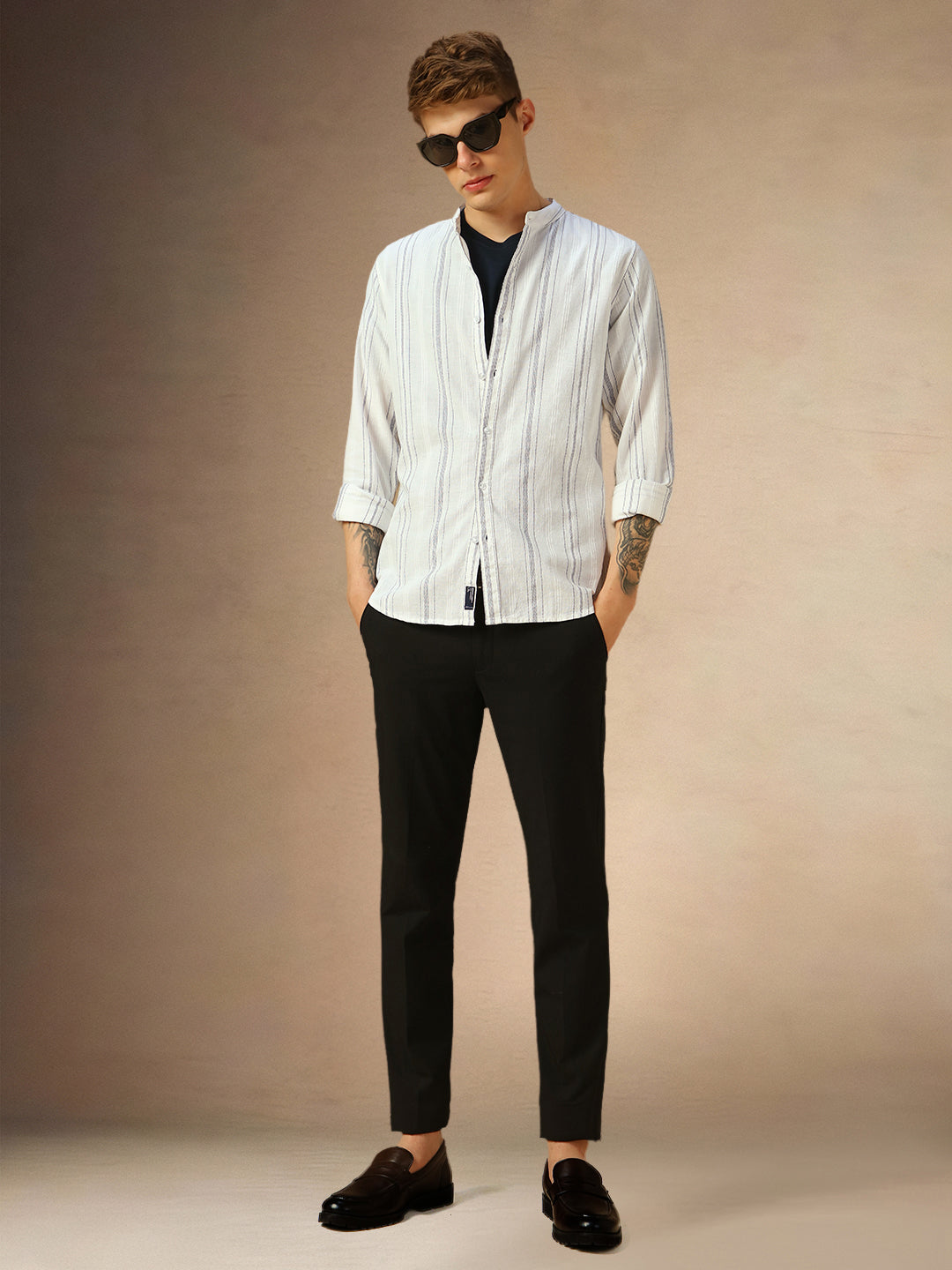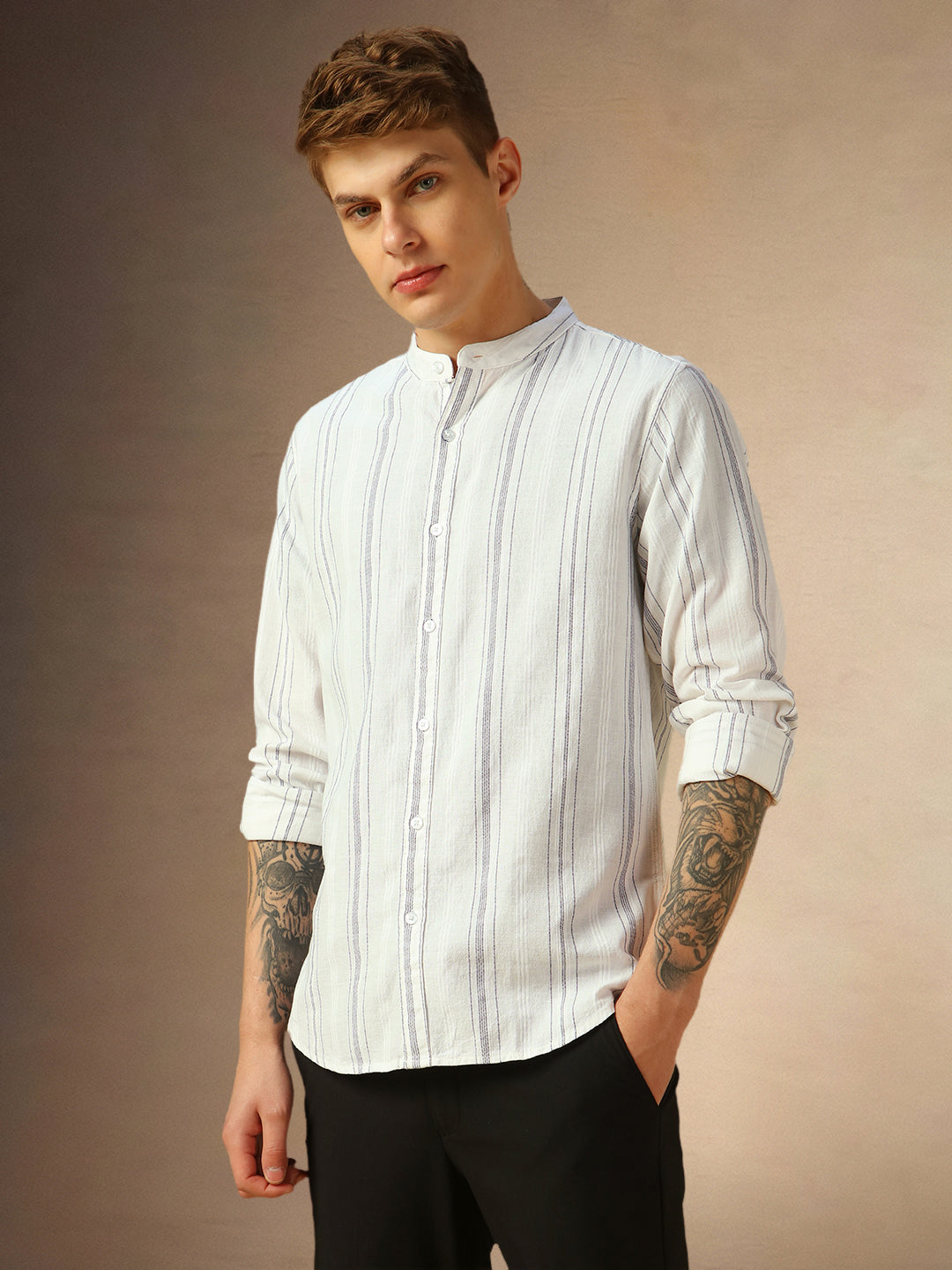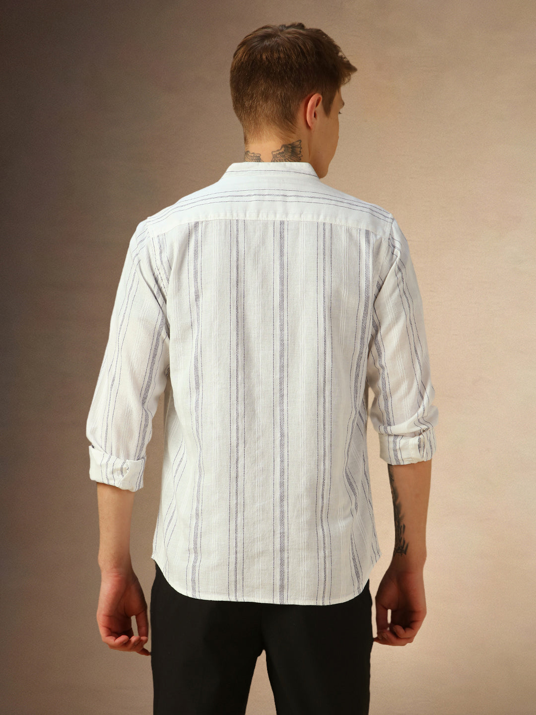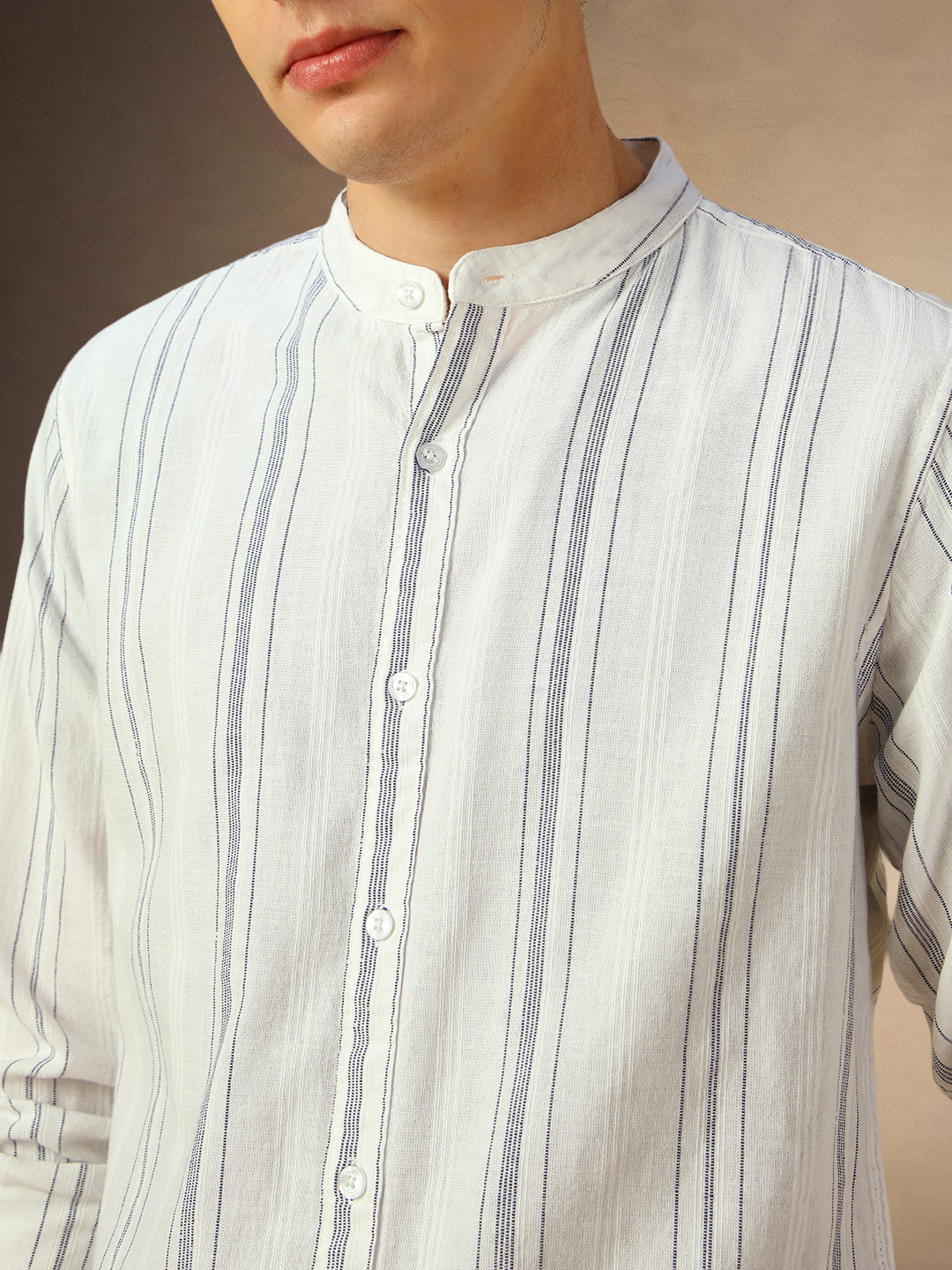 Men's White Striped Mandarin Collar Full Sleeves Shirt