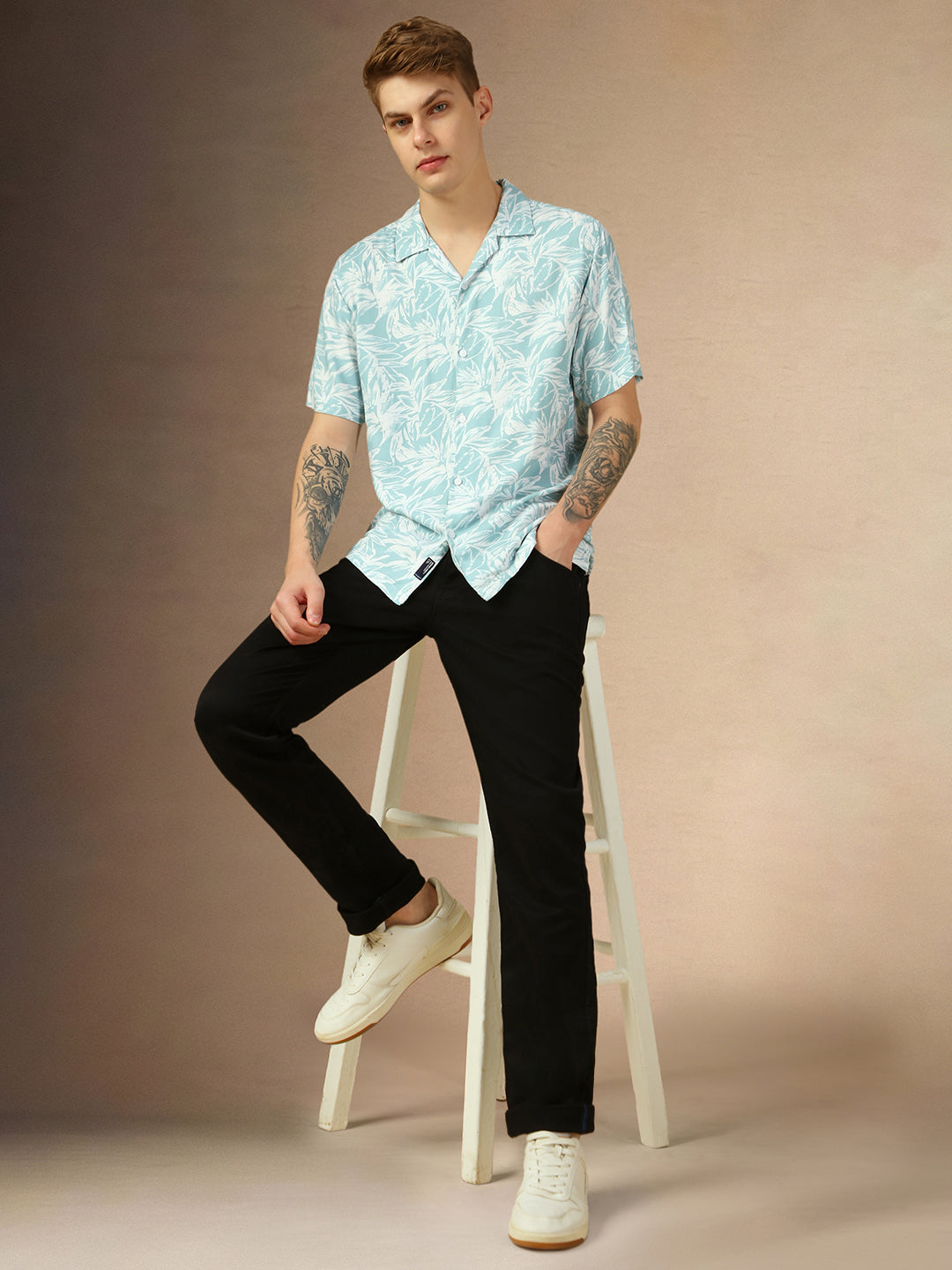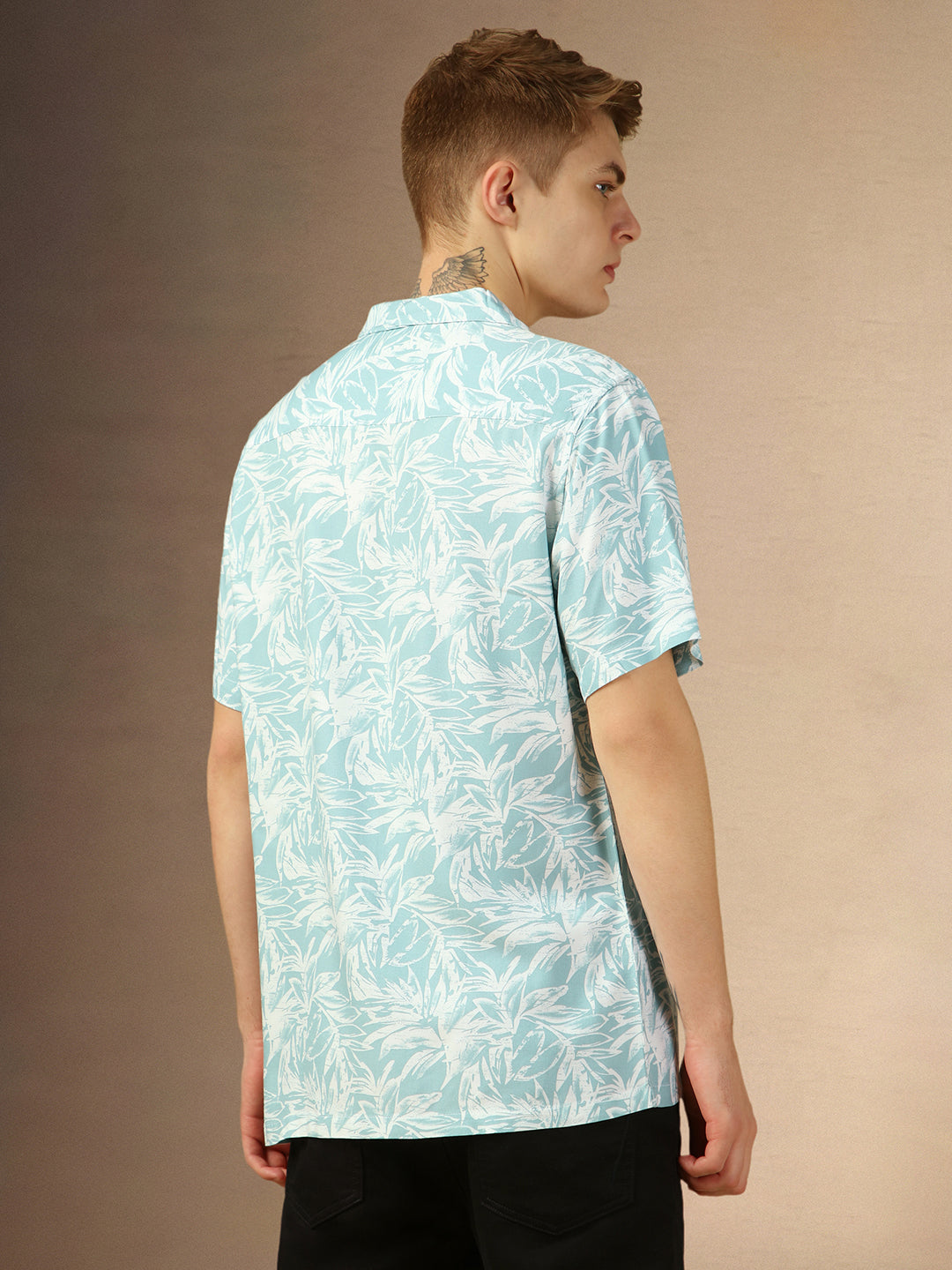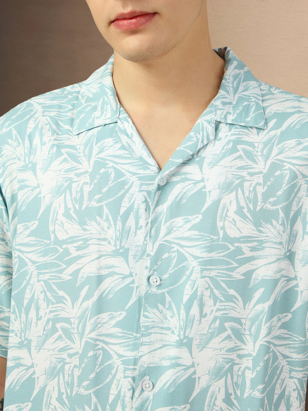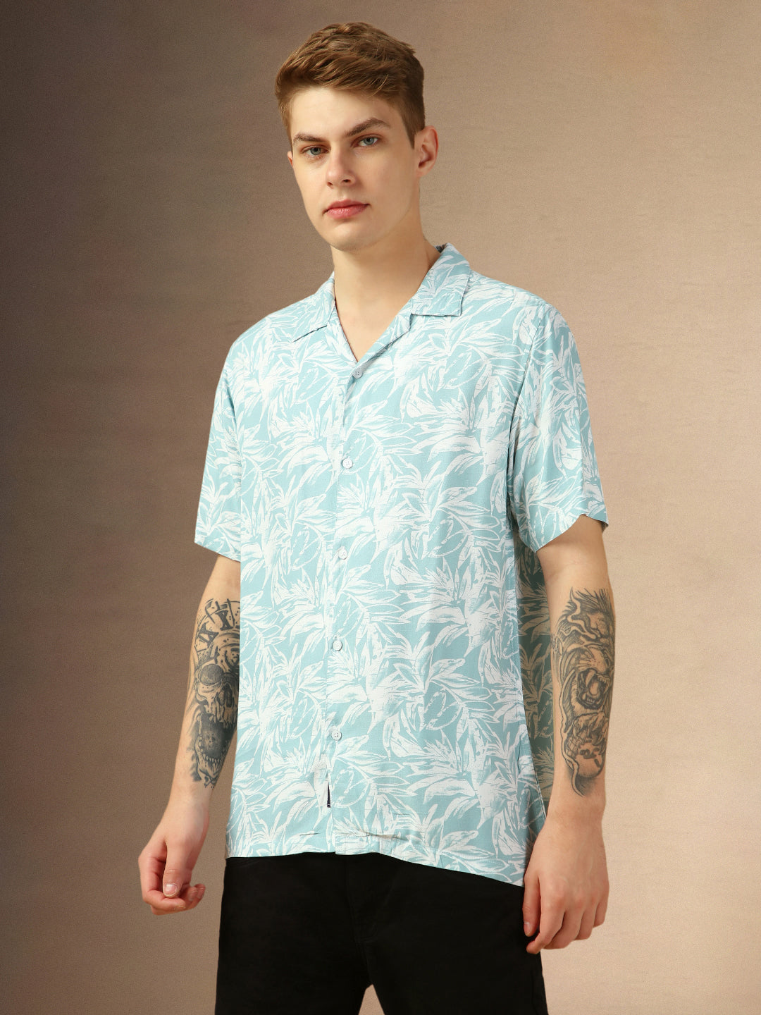 Men's Blue Printed Cuban Collar Half Sleeves Relaxed Fit Shirt