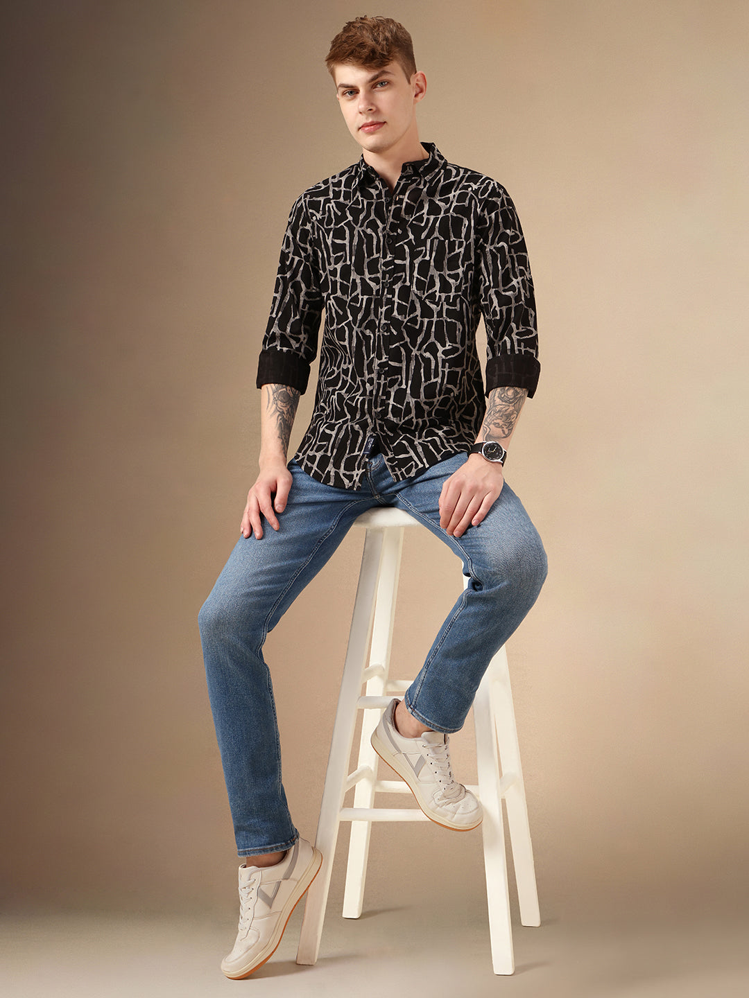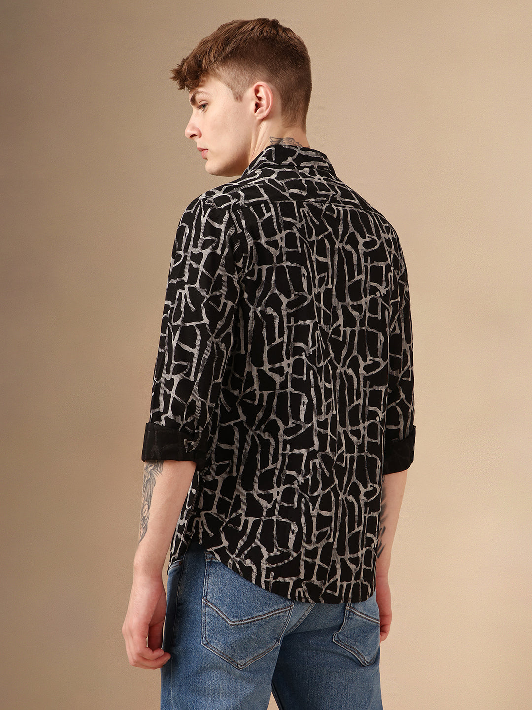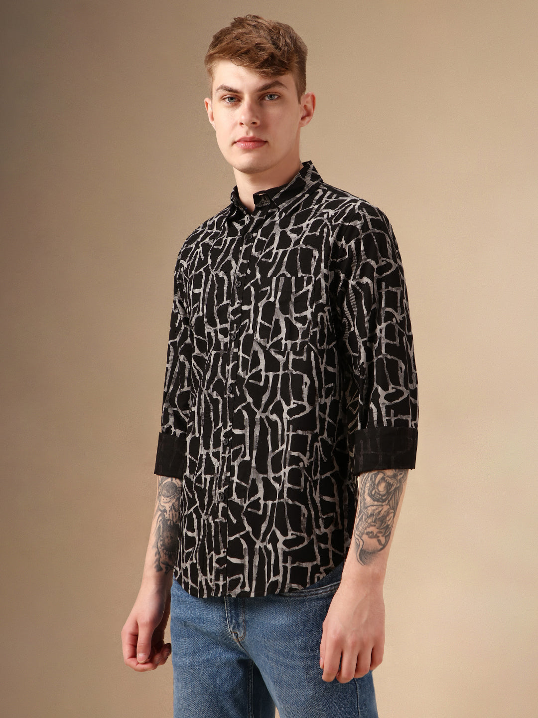 Men's Black Printed Spread Collar Full Sleeves Cotton Casual Shirt