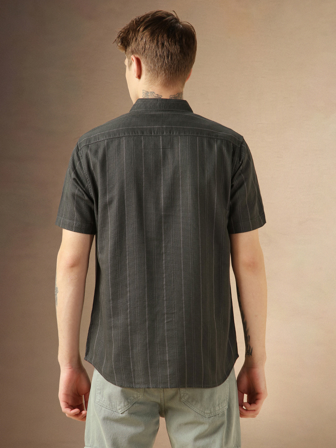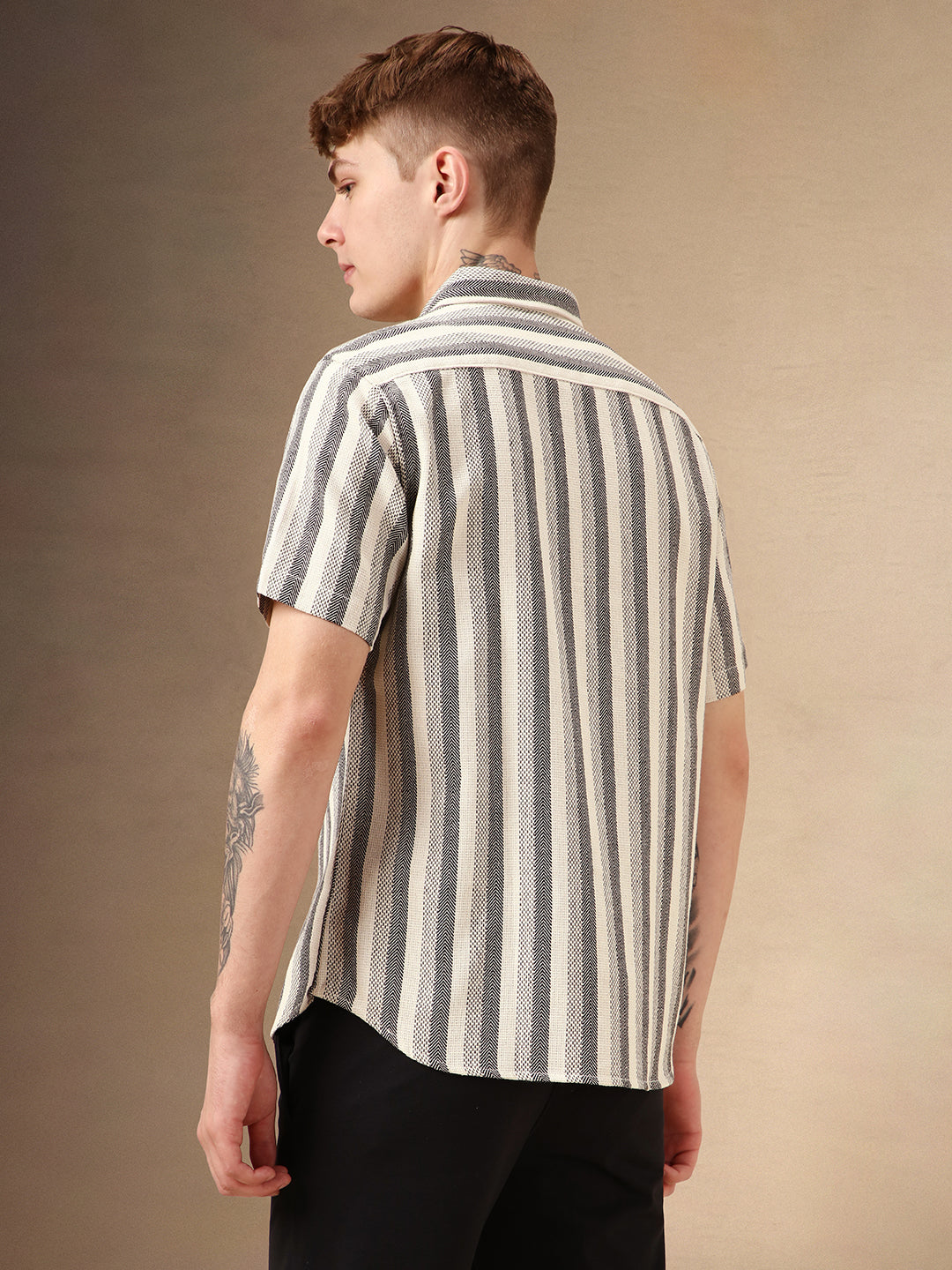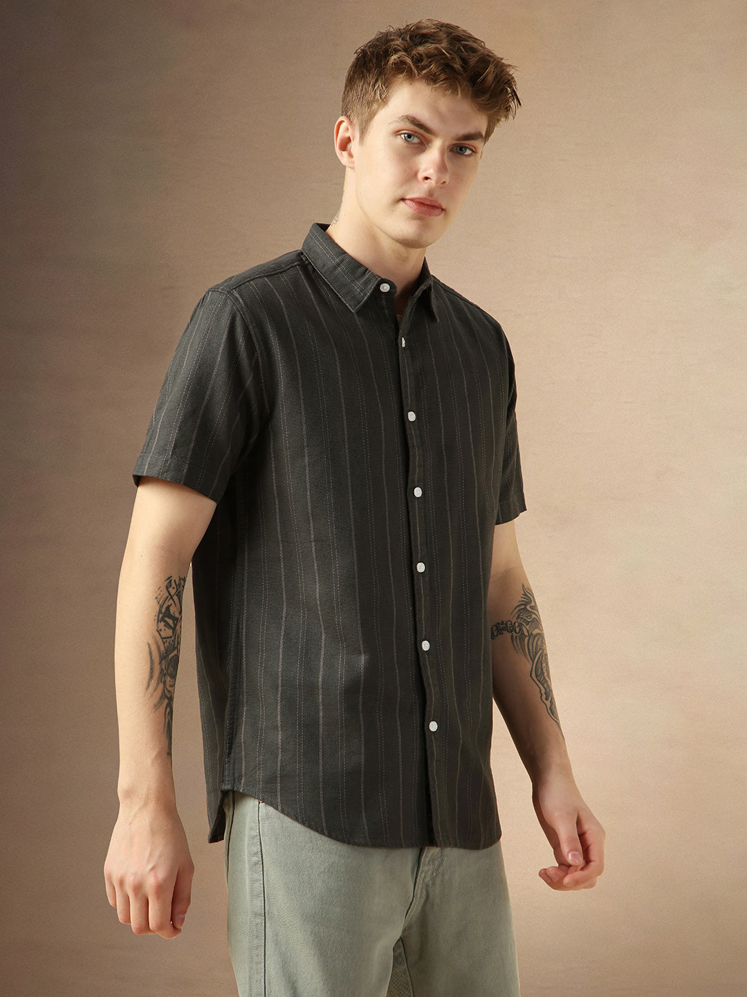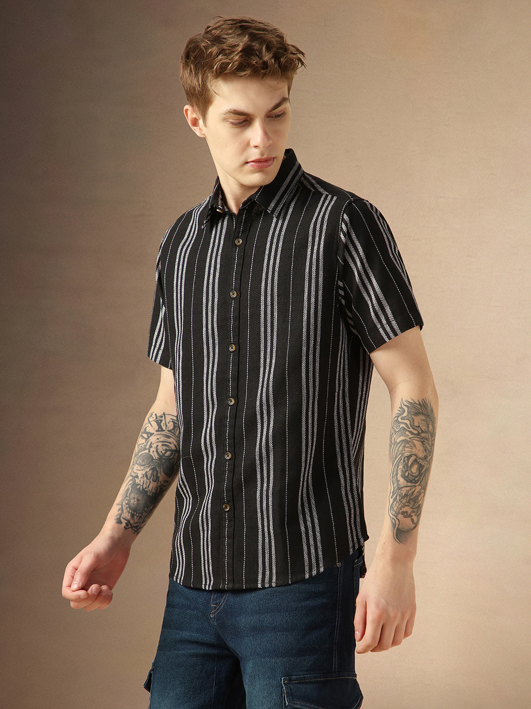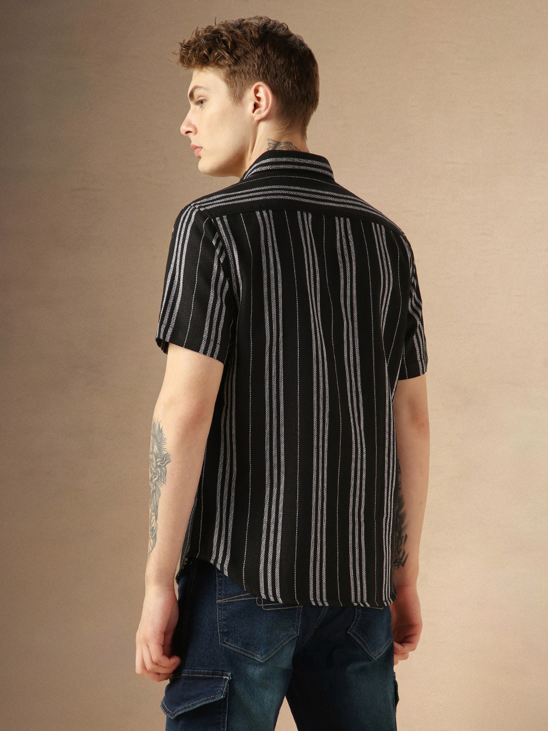 Men's Black Spread Collar Half Sleeves Striped Shirt