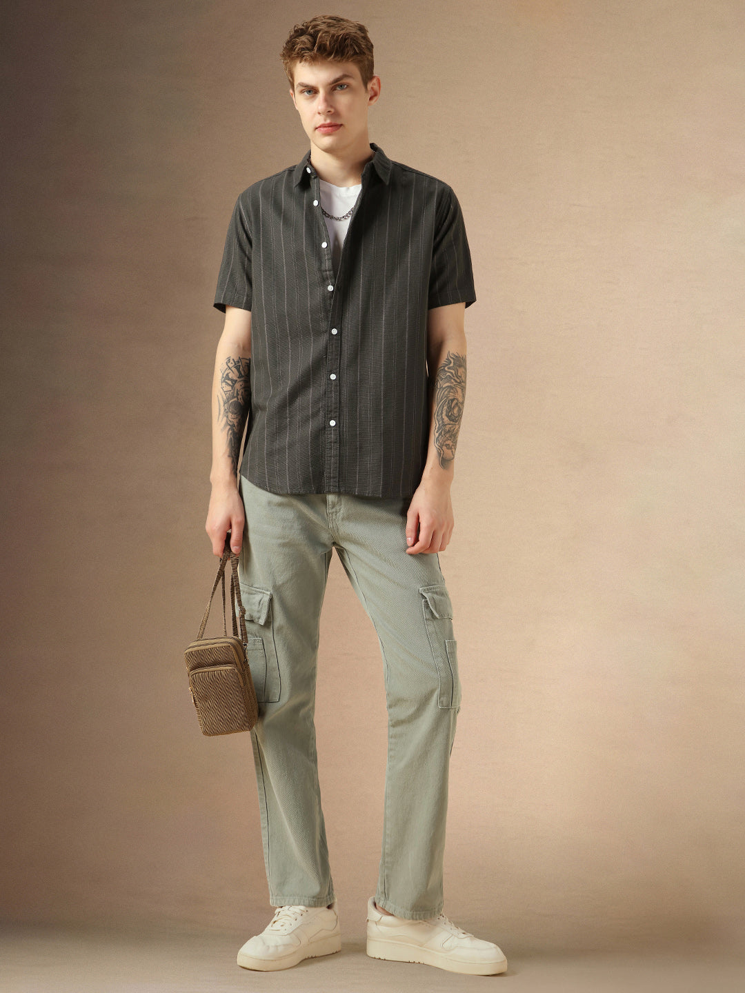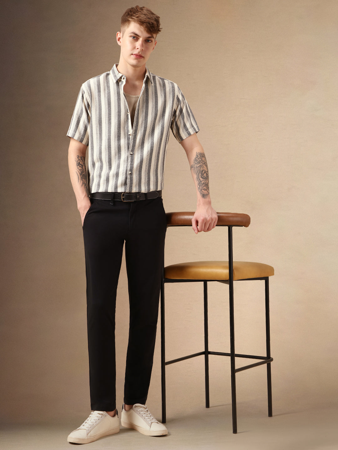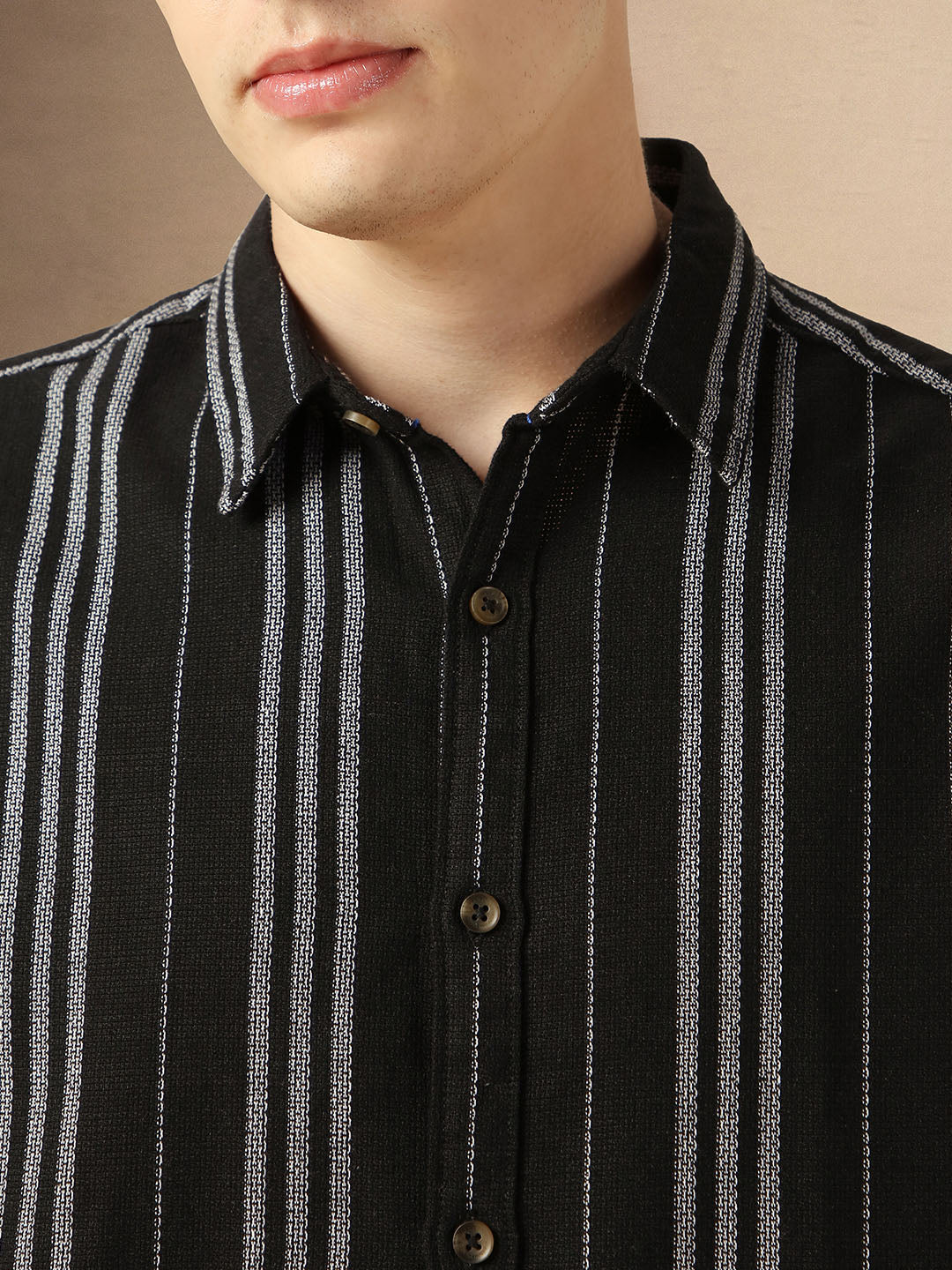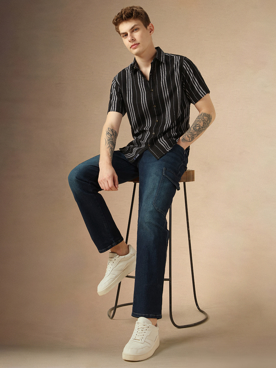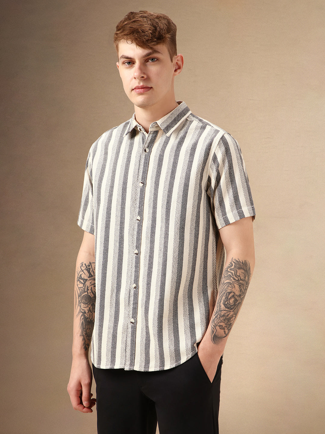 Men's Black Spread Collar Half Sleeves Striped Shirt