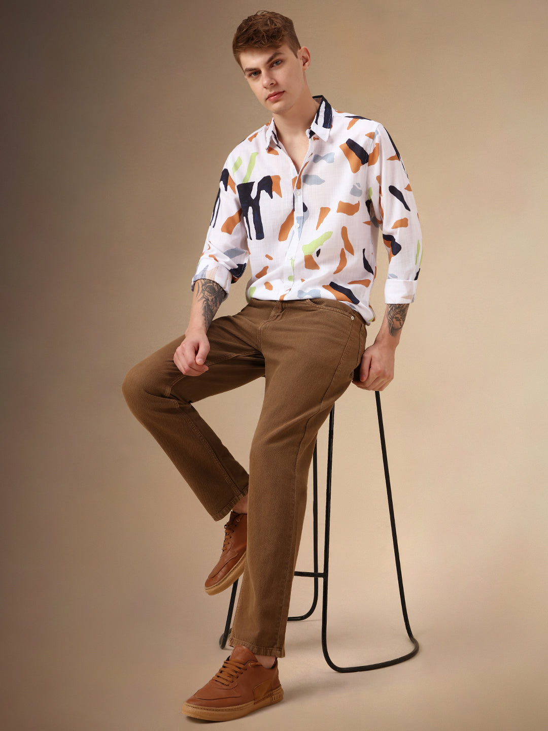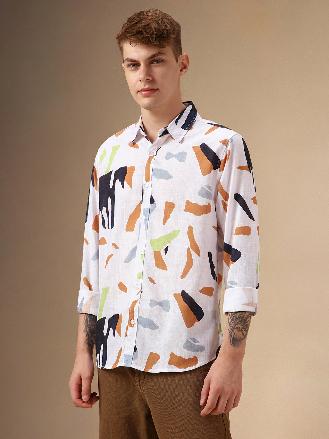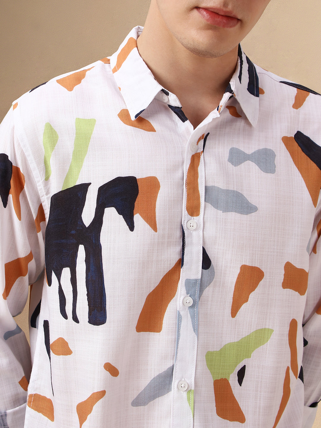 Men's White Printed Spread Collar Full Sleeves Cotton Slub Casual Shirt