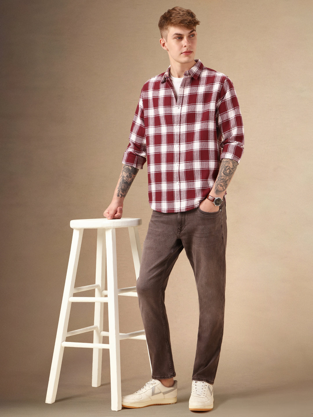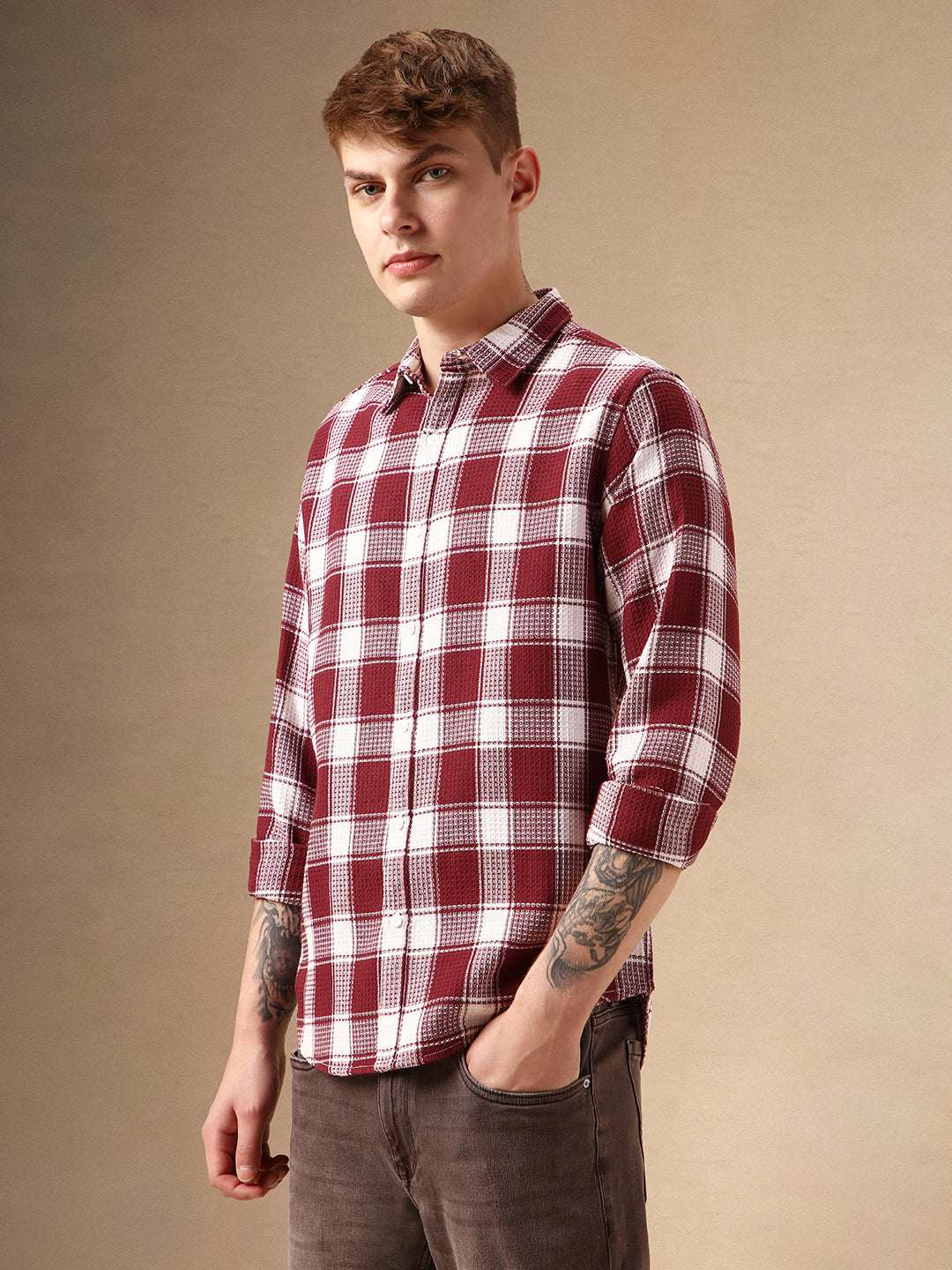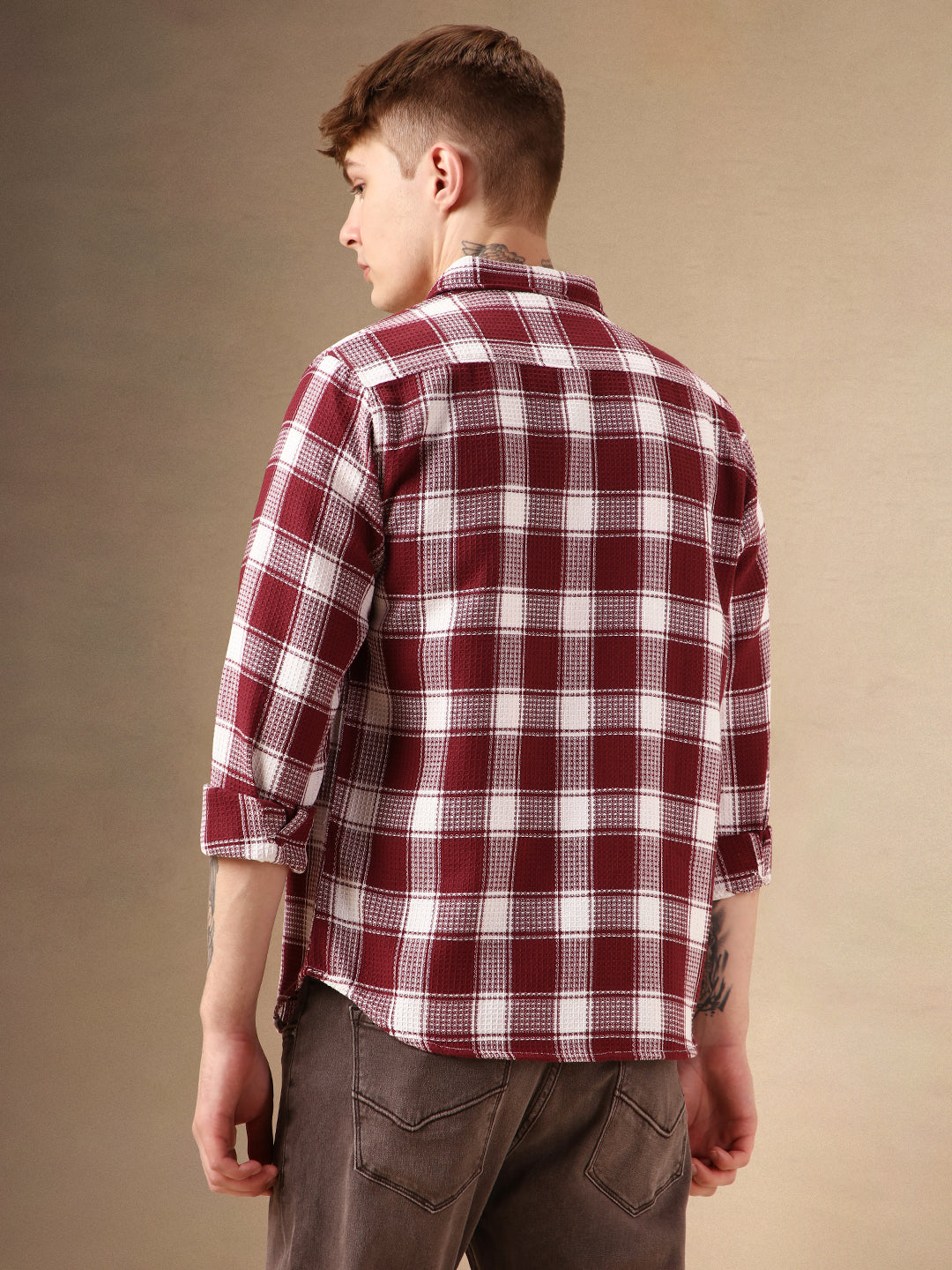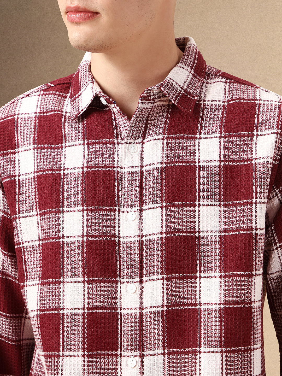Men's Red Checks Spread Collar Full Sleeves Cotton Poly Waffle Casual Shirt
