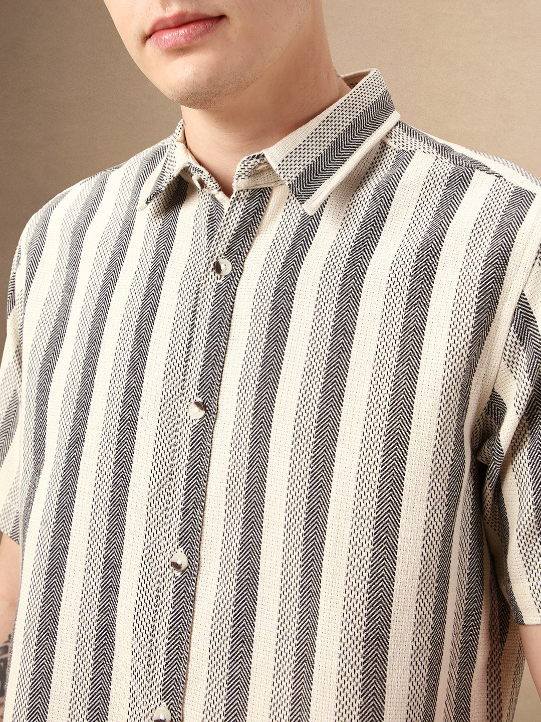 Men's Cream Striped Spread Collar Half Sleeves Cotton Poly Waffle Casual Shirt