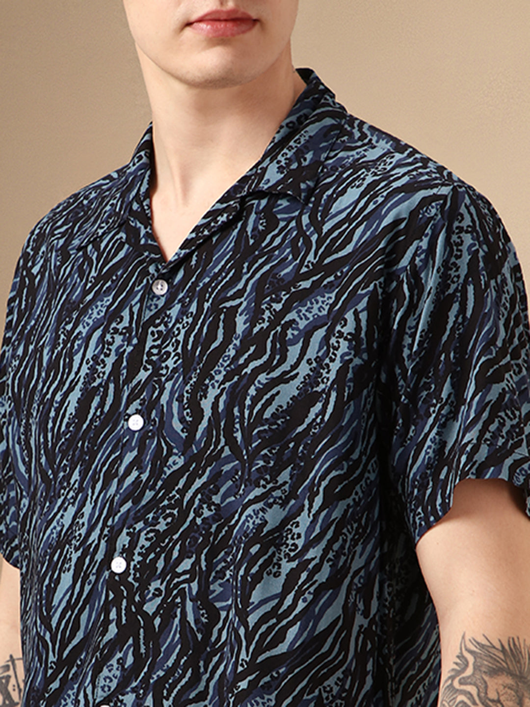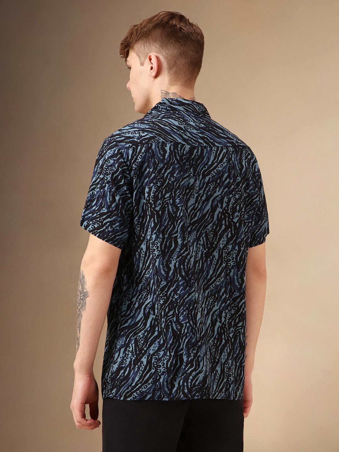 Men's Navy Printed Cuban Collar Half Sleeves Rayon Casual Shirt