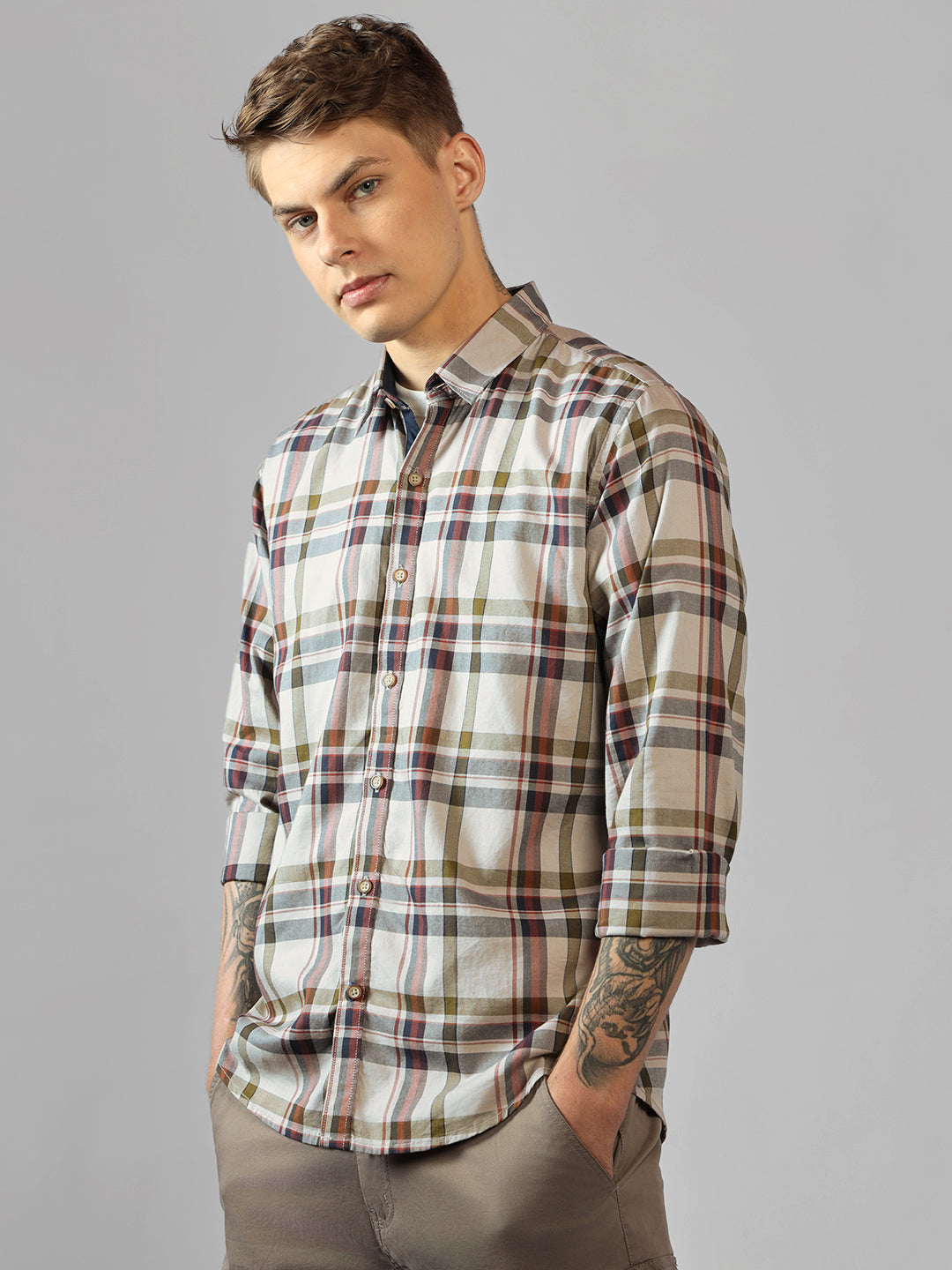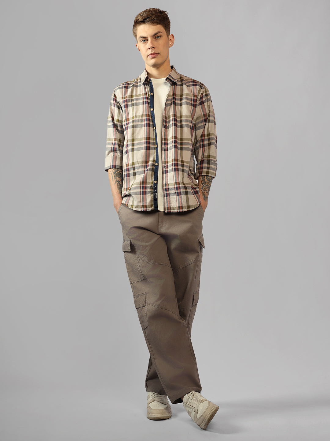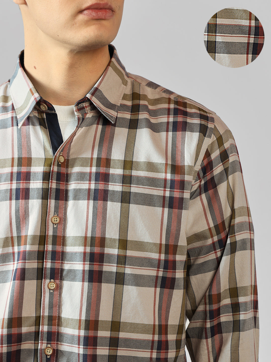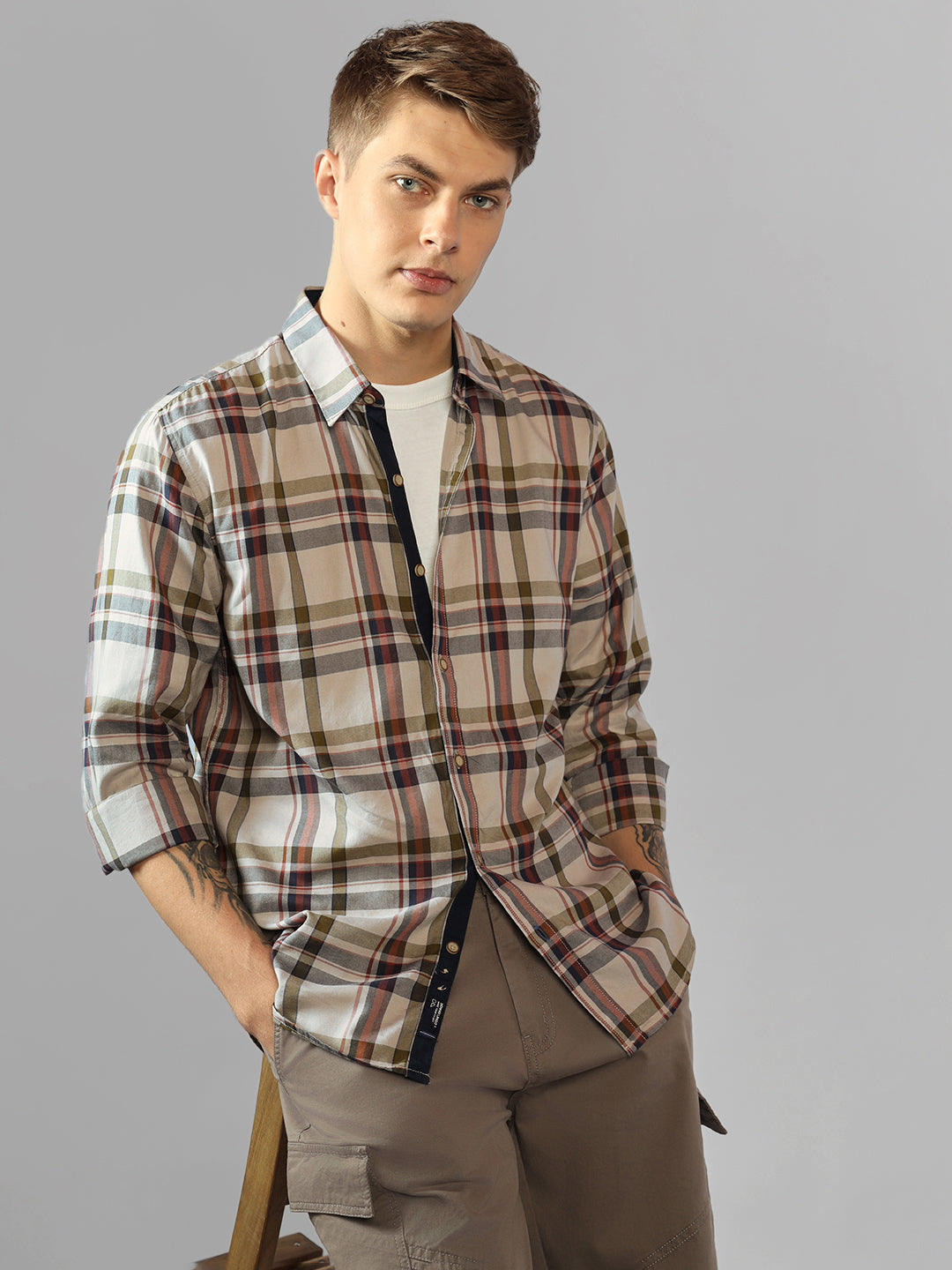 Men's Khaki Checks Spread Collar Full Sleeve Regular Fit Shirt