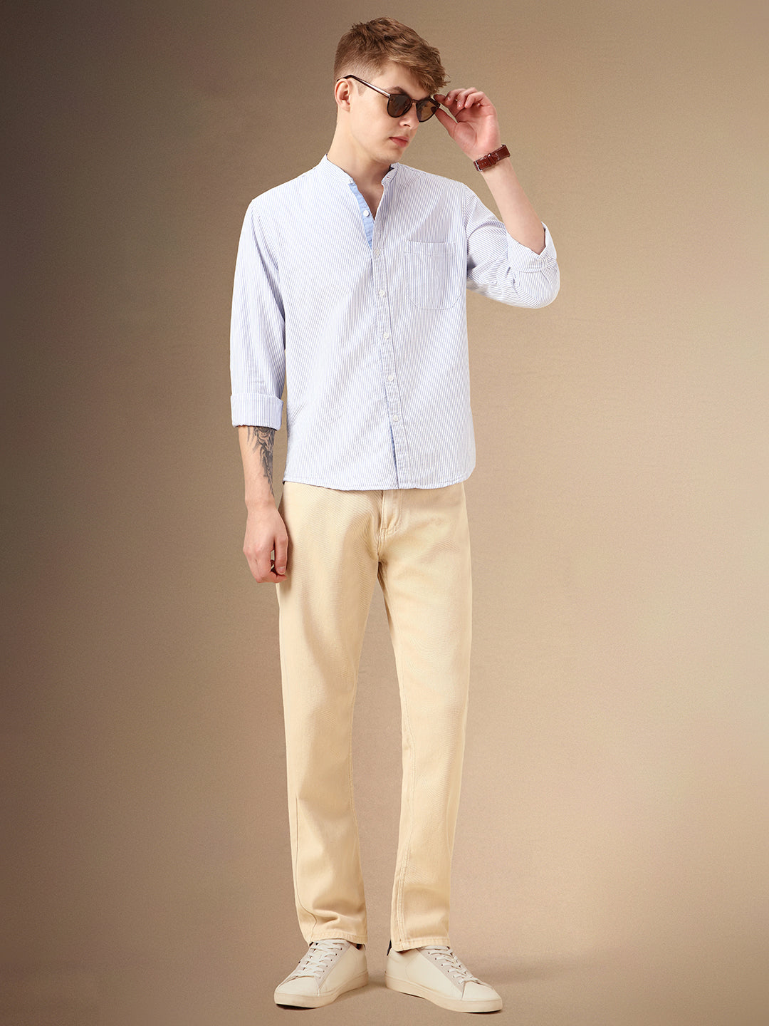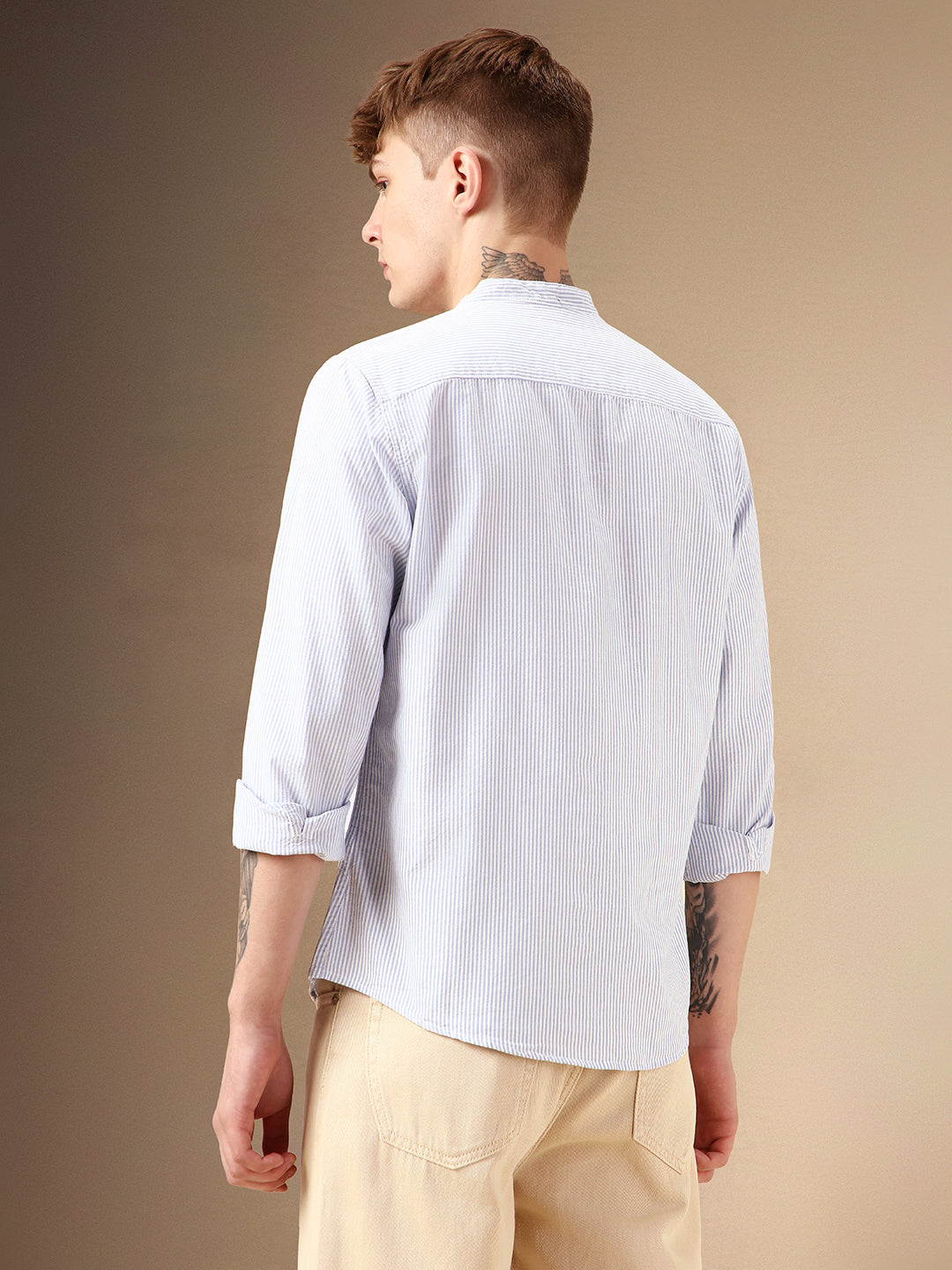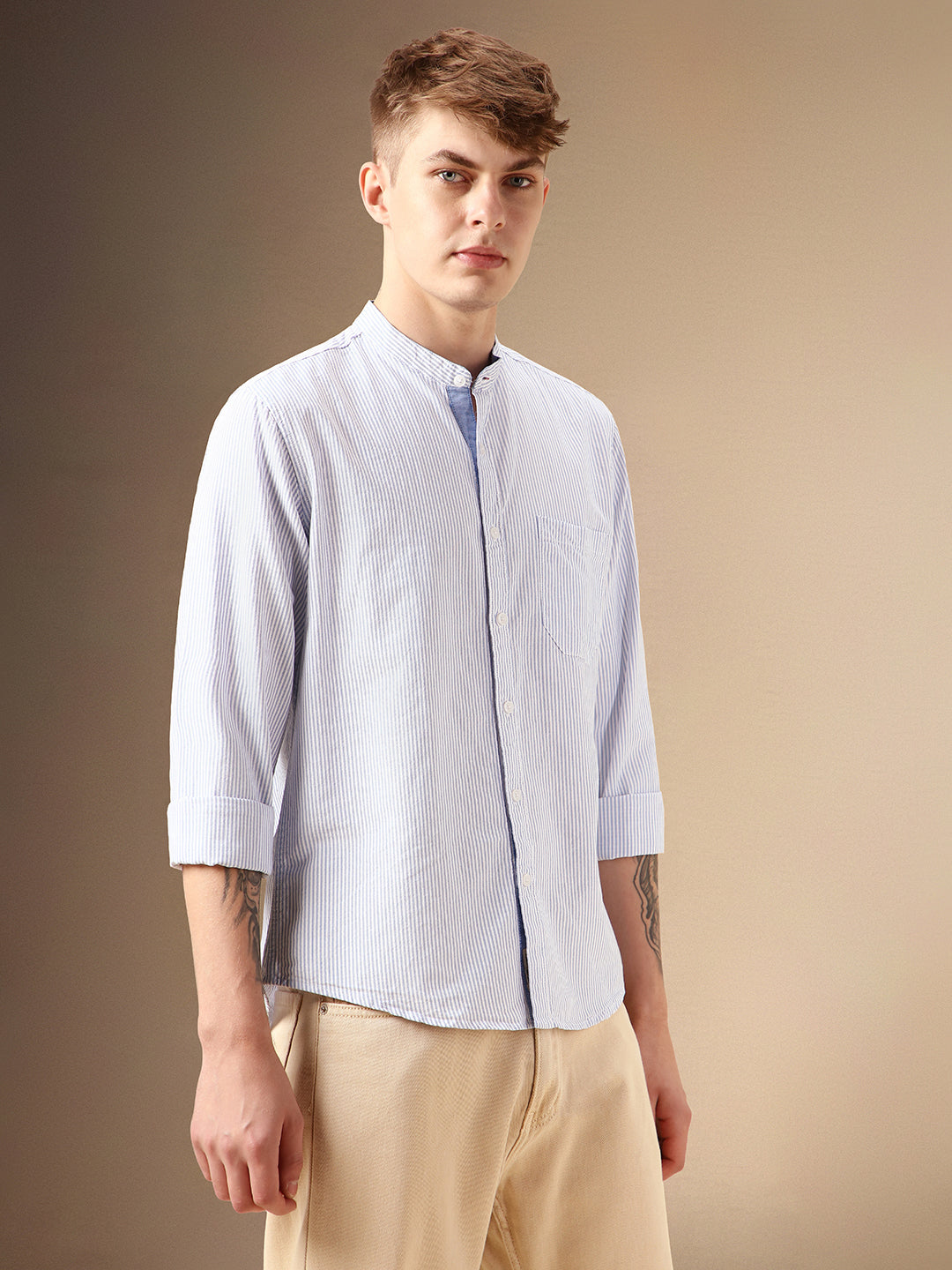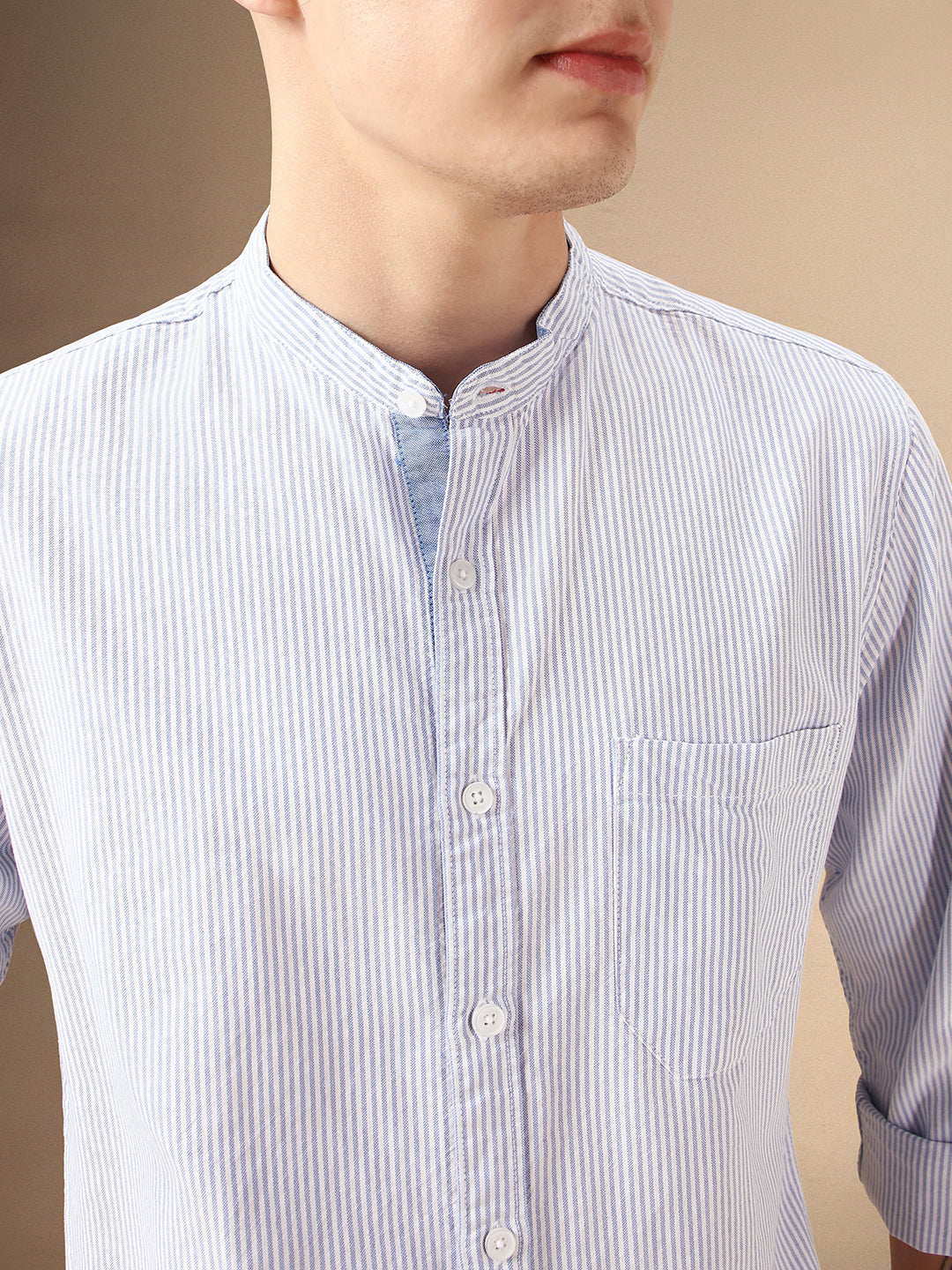Men's Blue Striped Mandarin Collar Full sleeve Regular Fit Shirt