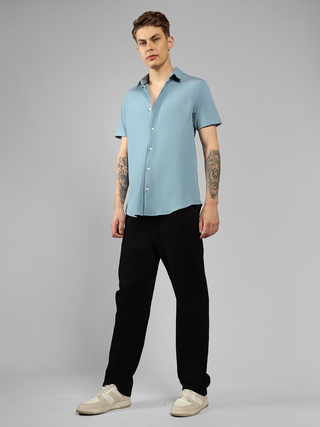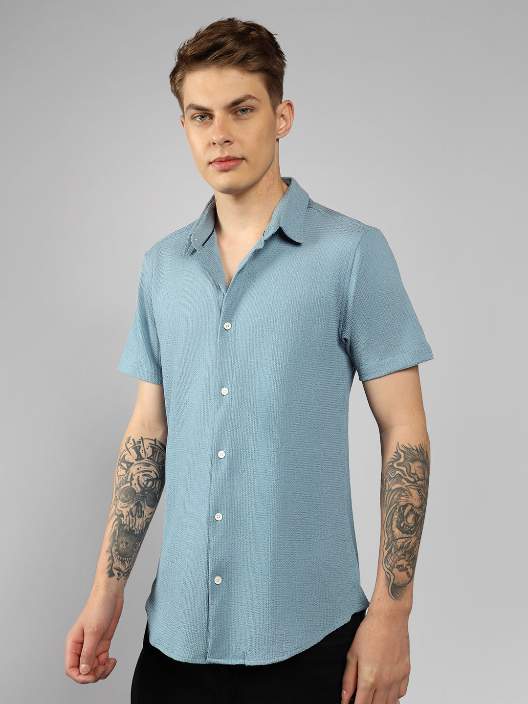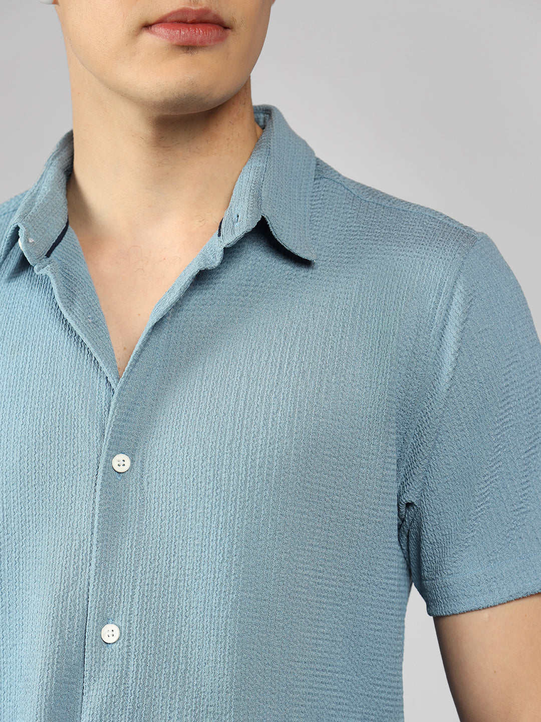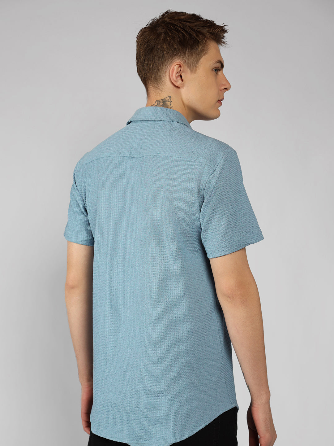 Men's Blue Textured Spread Collar Half sleeve Regular Fit Shirt