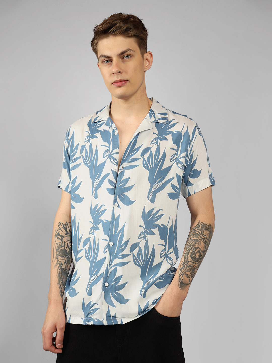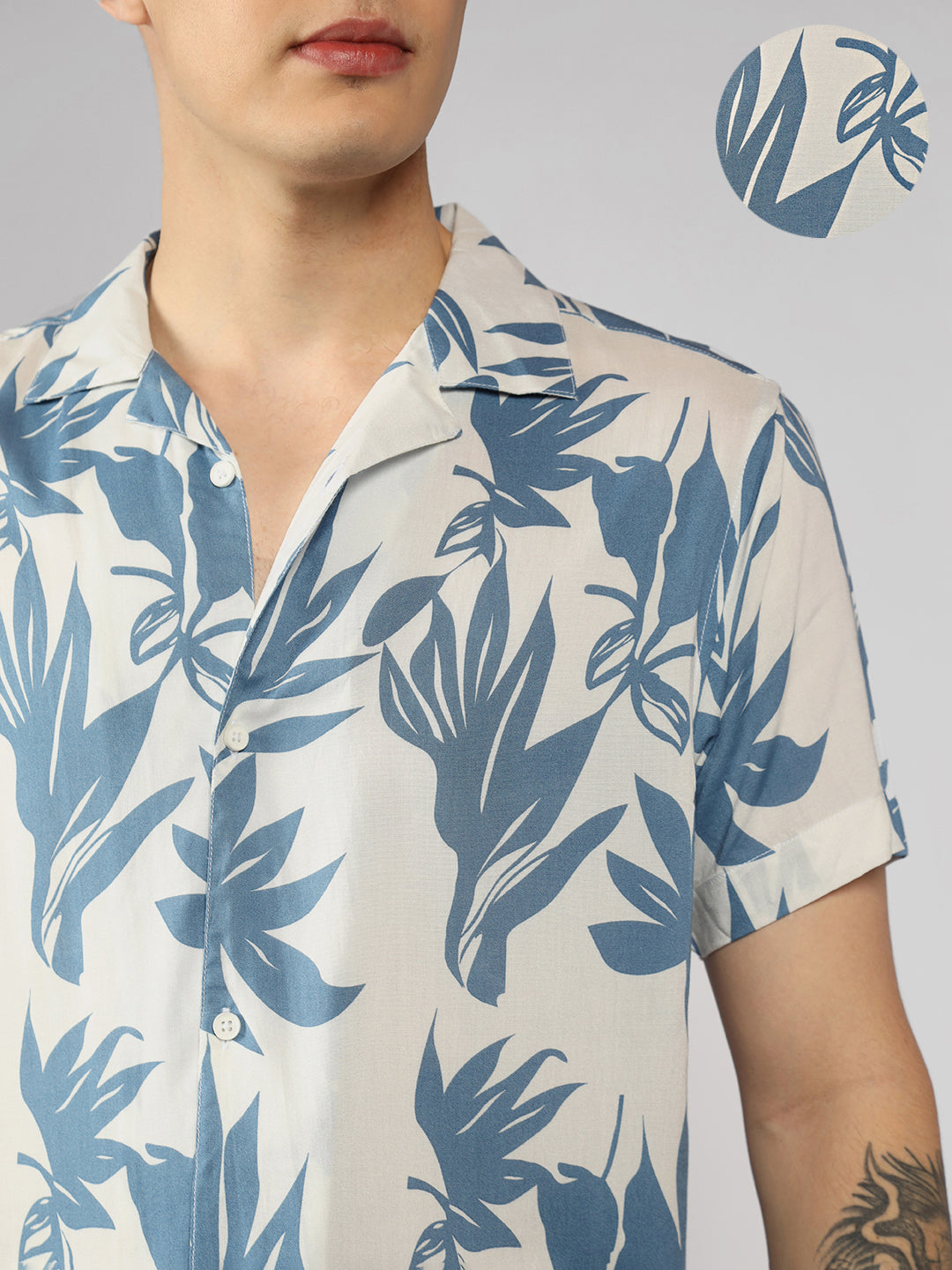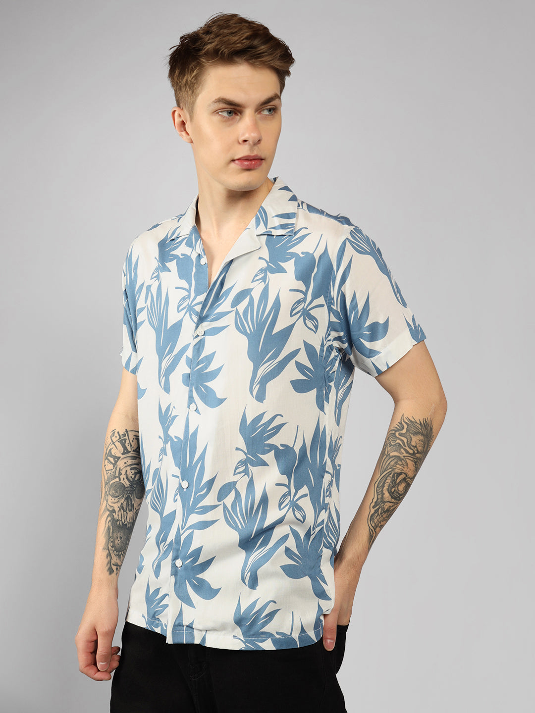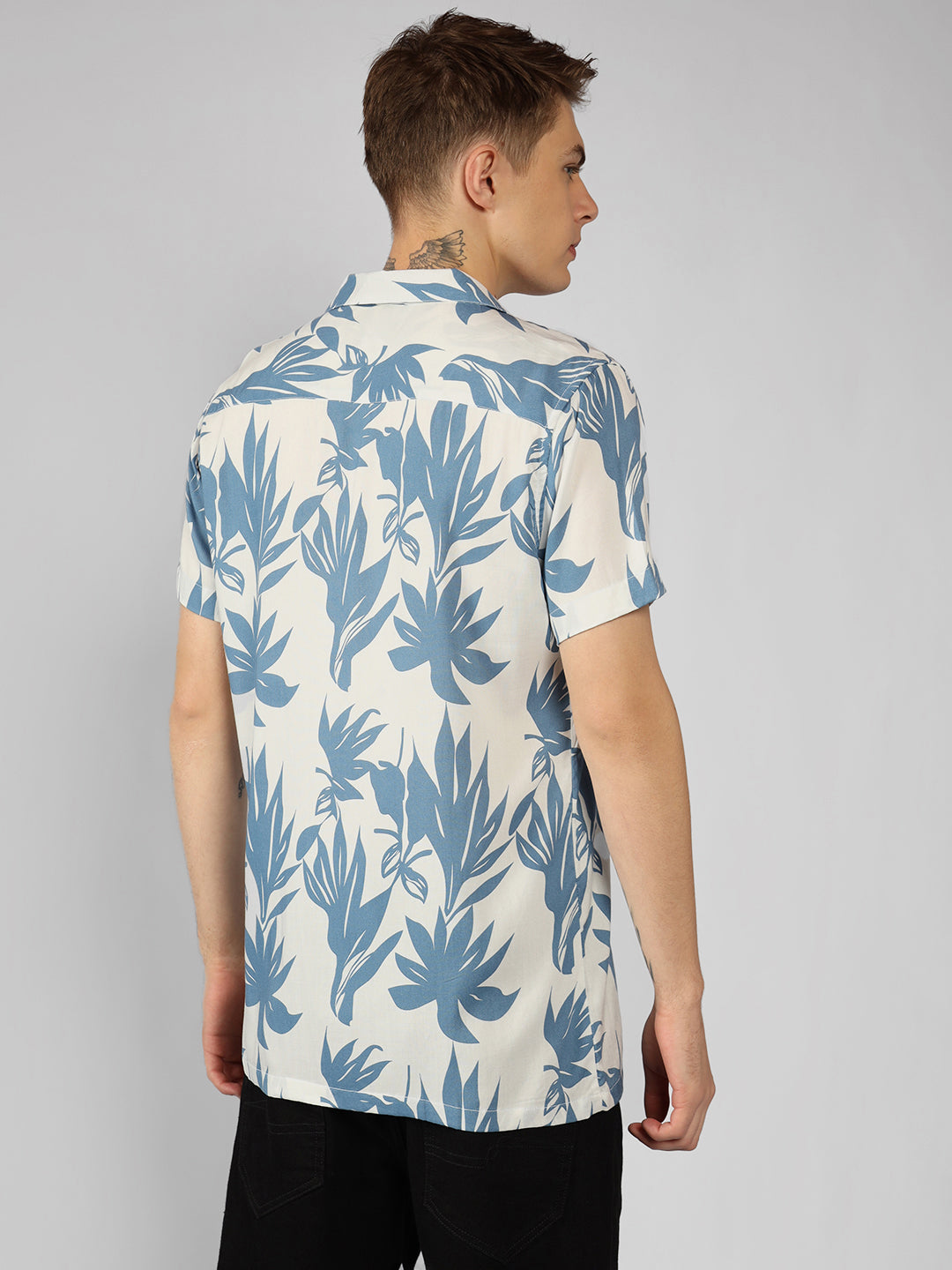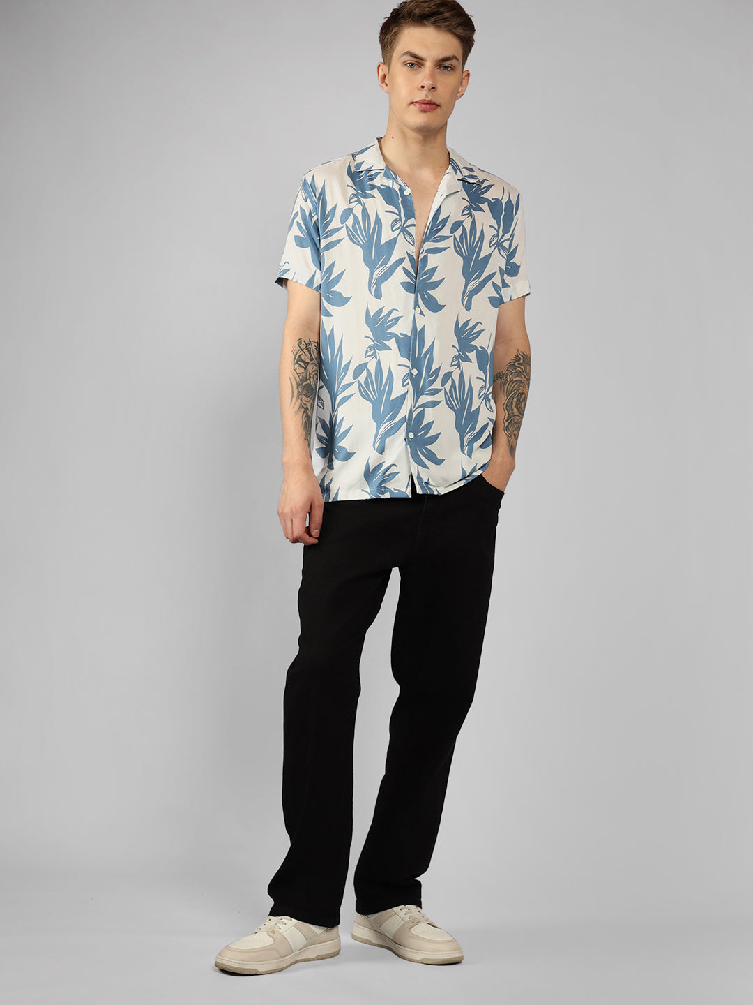 Men's White Printed Cuban Collar Half sleeve Relaxed Fit Shirt