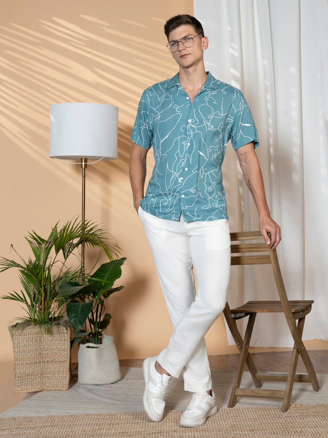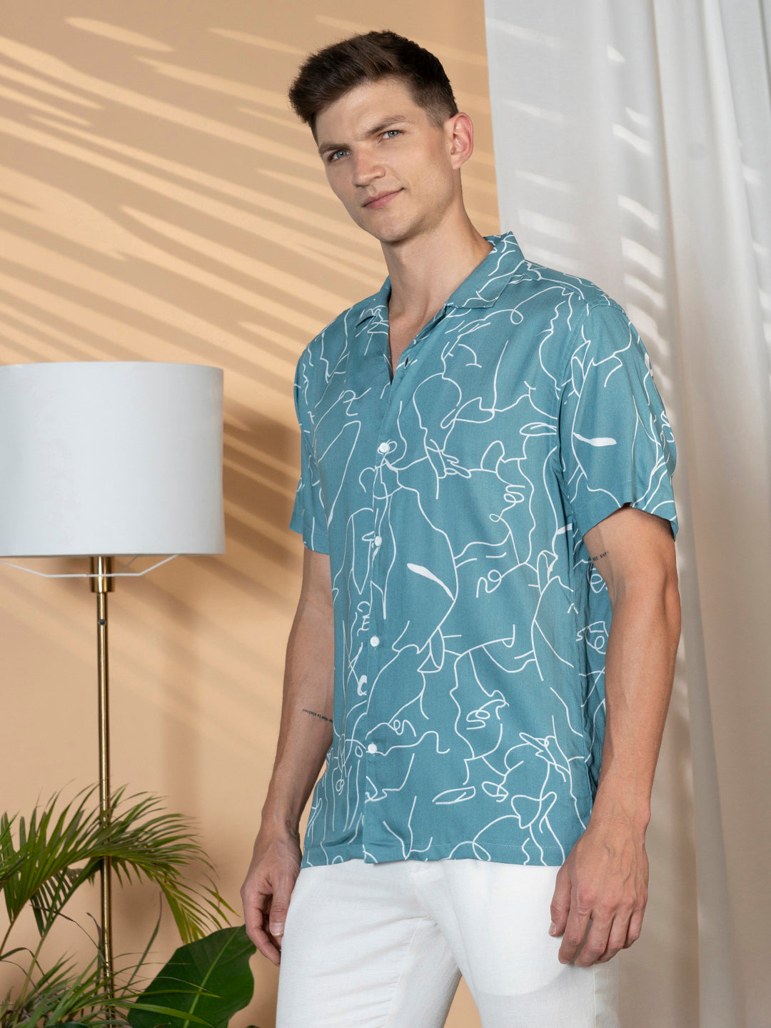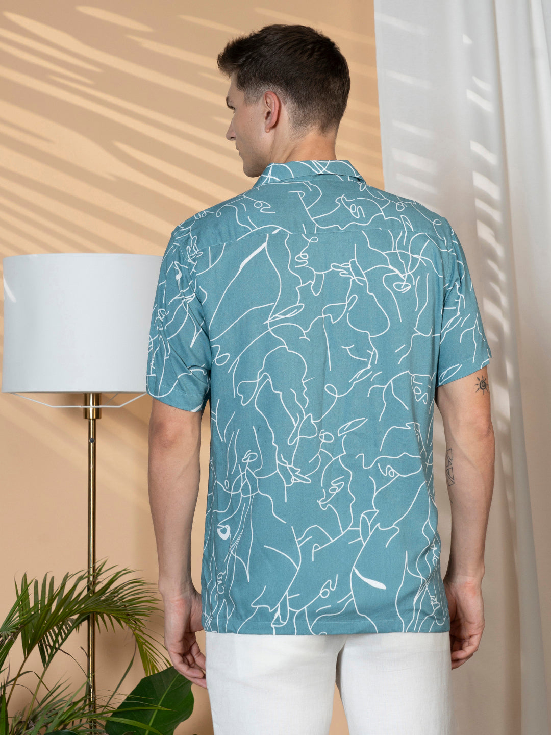 Men's Sage Green Printed Cuban Collar Half sleeve Relaxed Fit Shirt