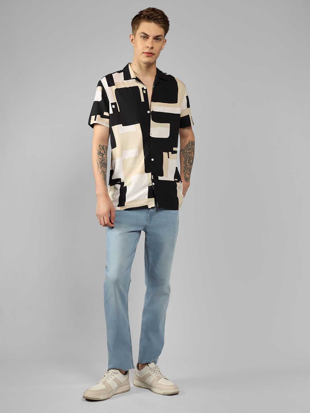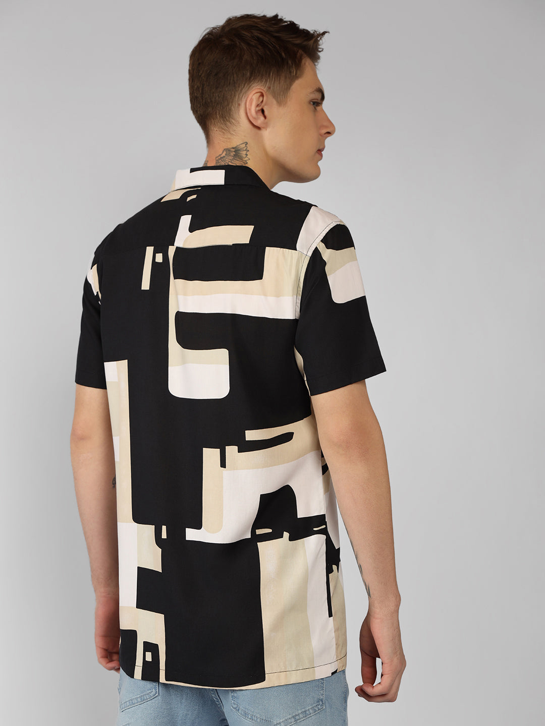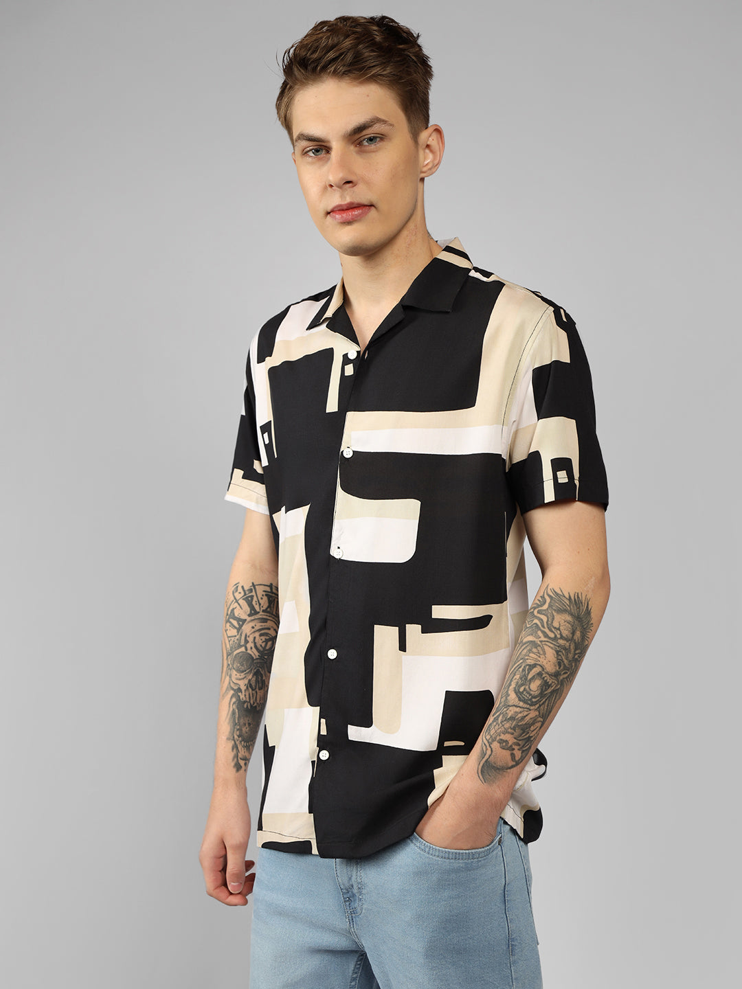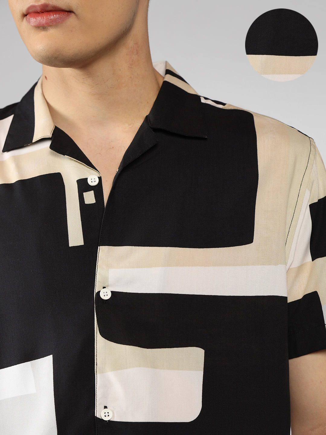 Men's Black Printed Cuban Collar Half sleeve Relaxed Fit Shirt