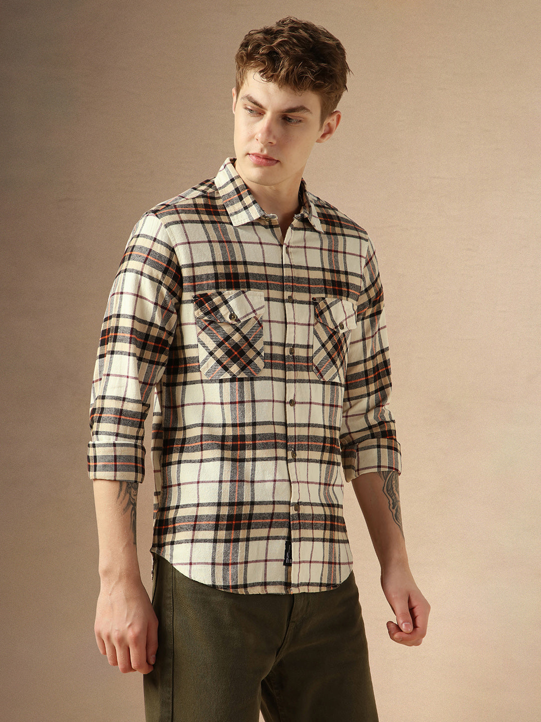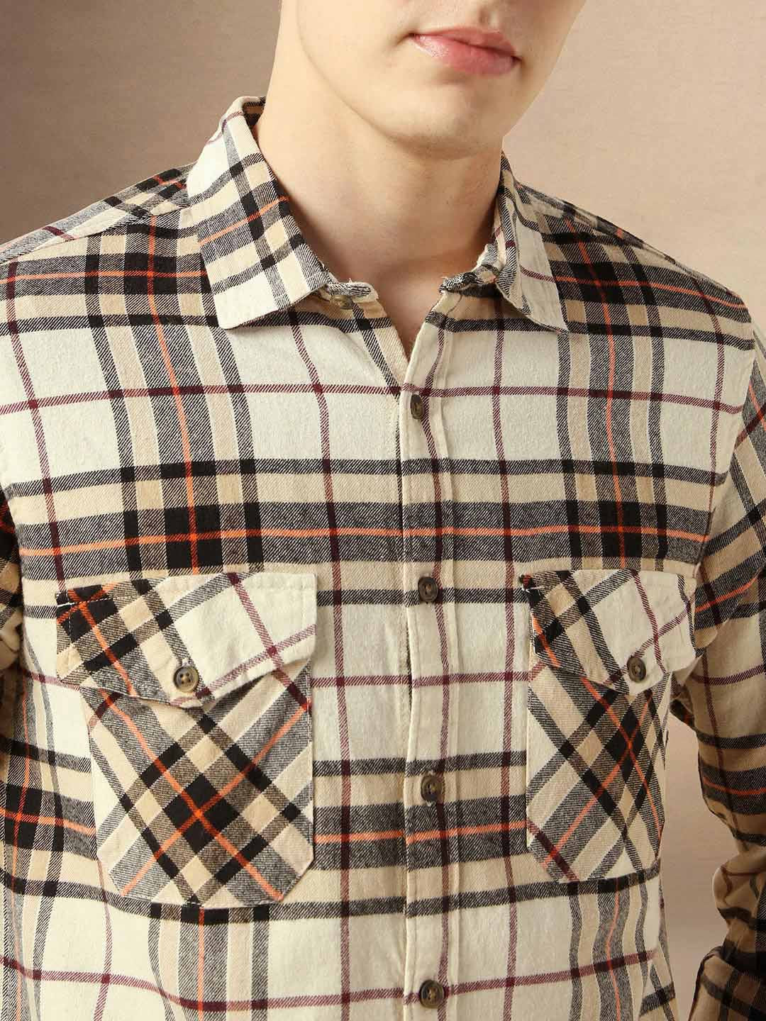 Men's Beige Flannel Checks Spread Collar Full Sleeve Relaxed Fit Shirt