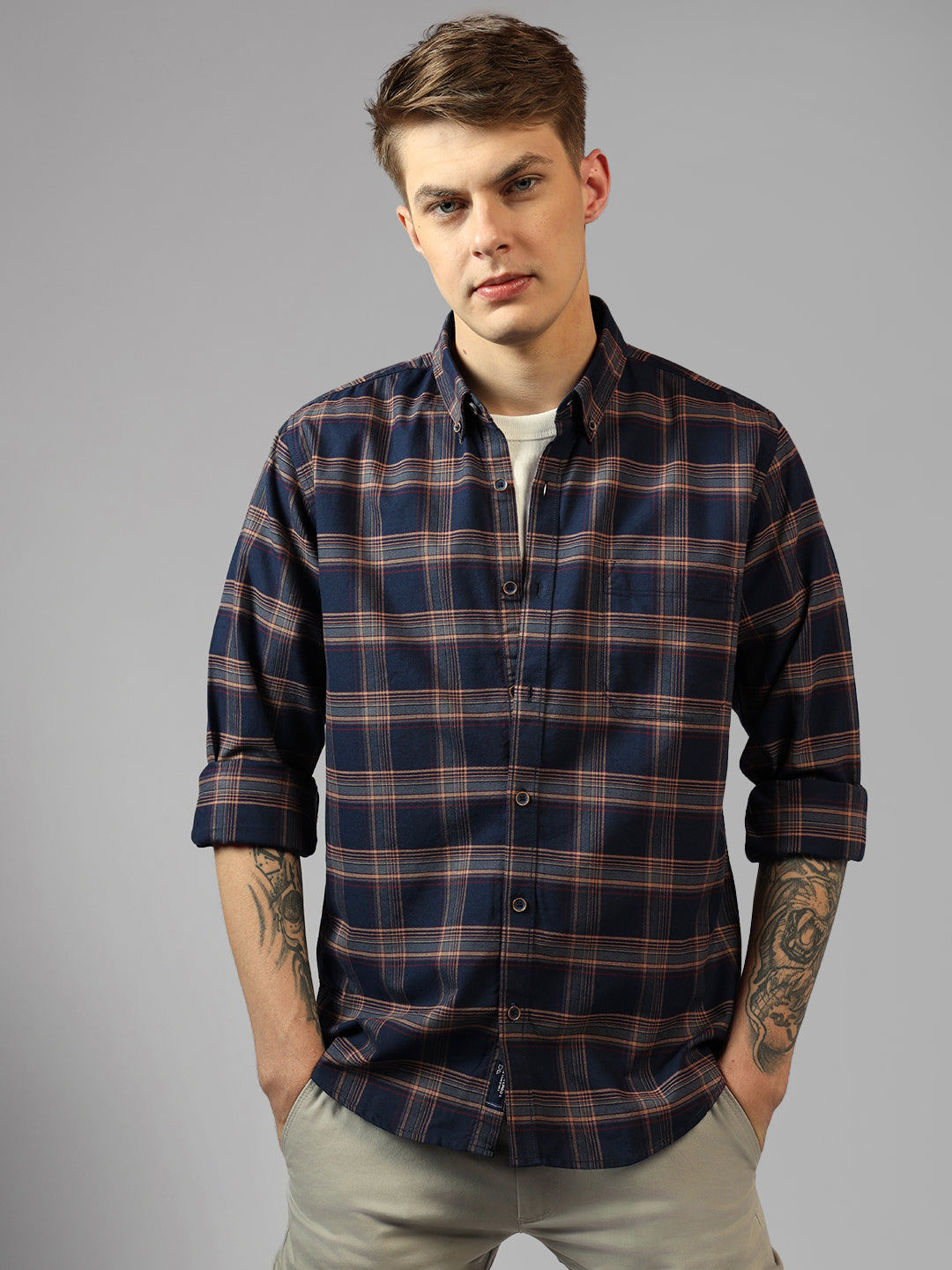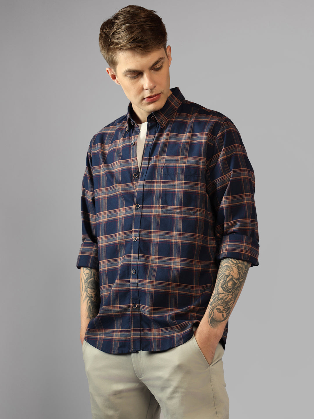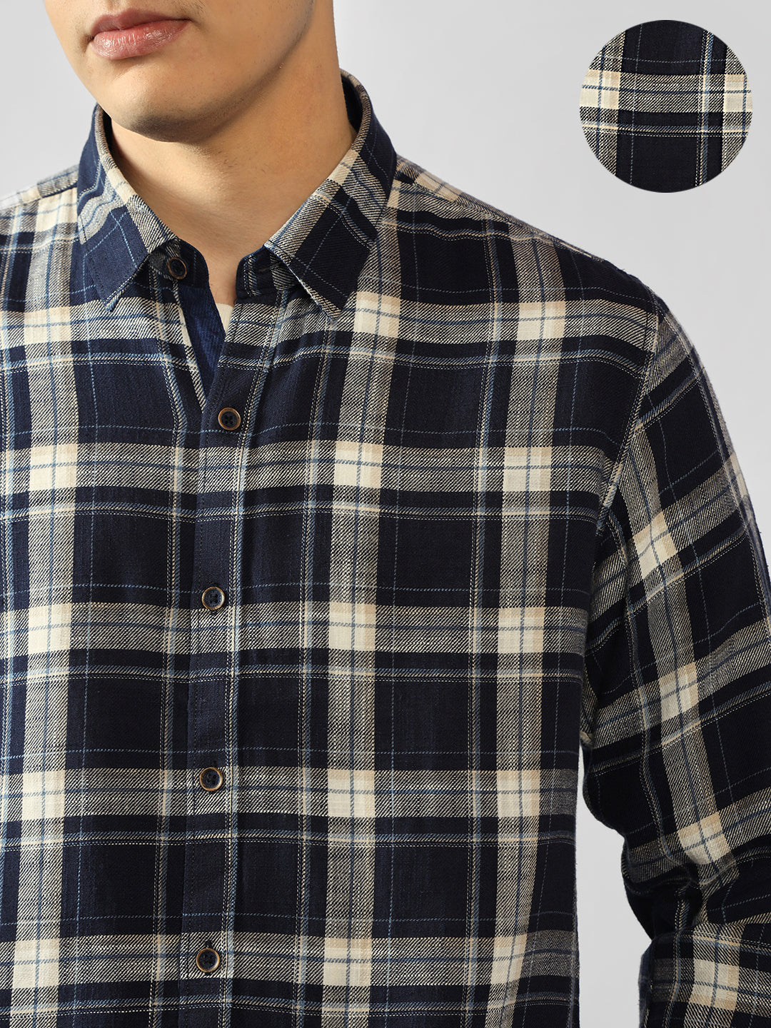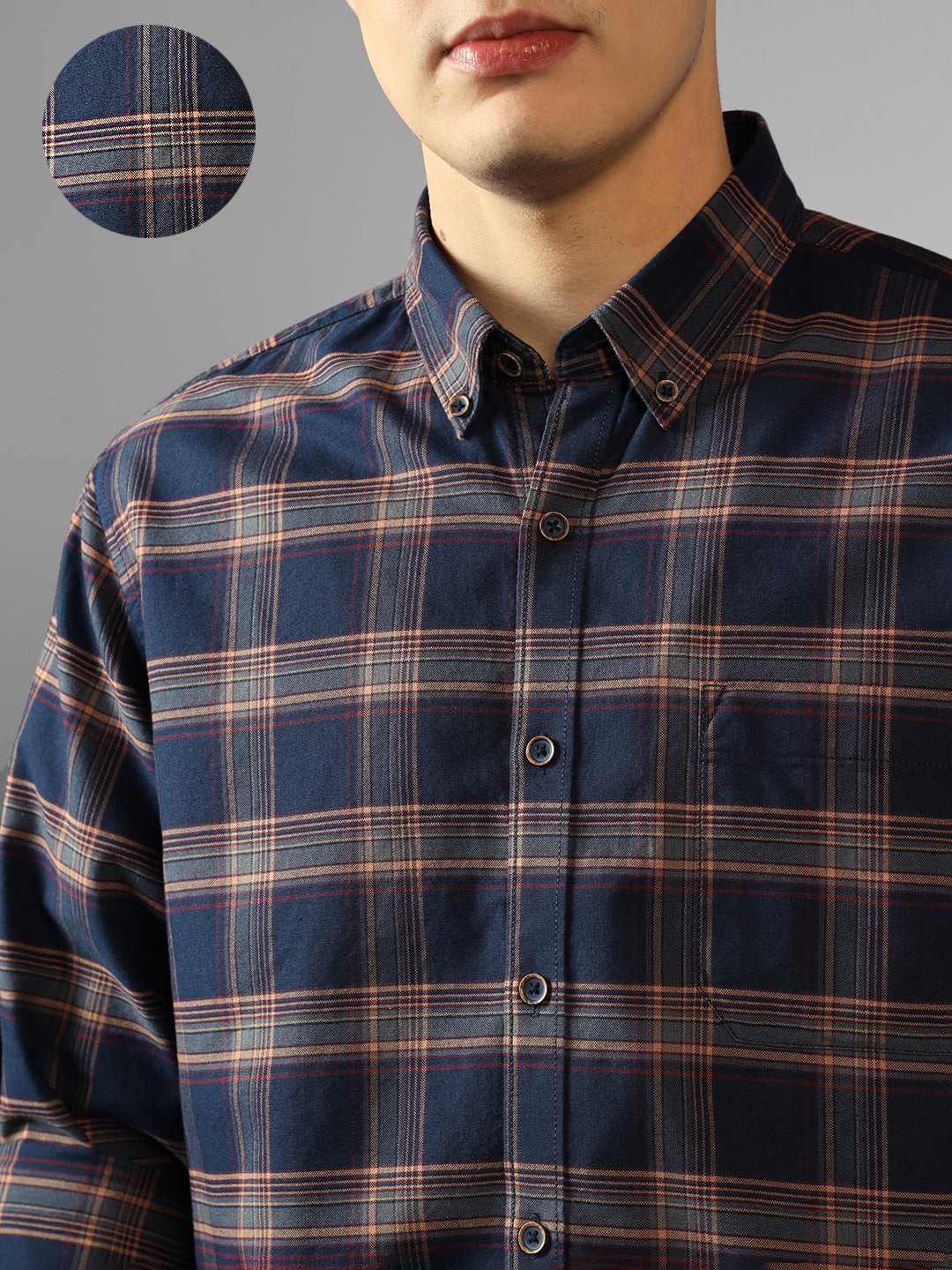 Men's Navy Flannel Checks Spread Collar Full Sleeve Relaxed Fit Shirt