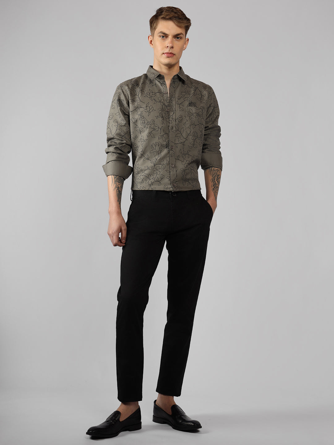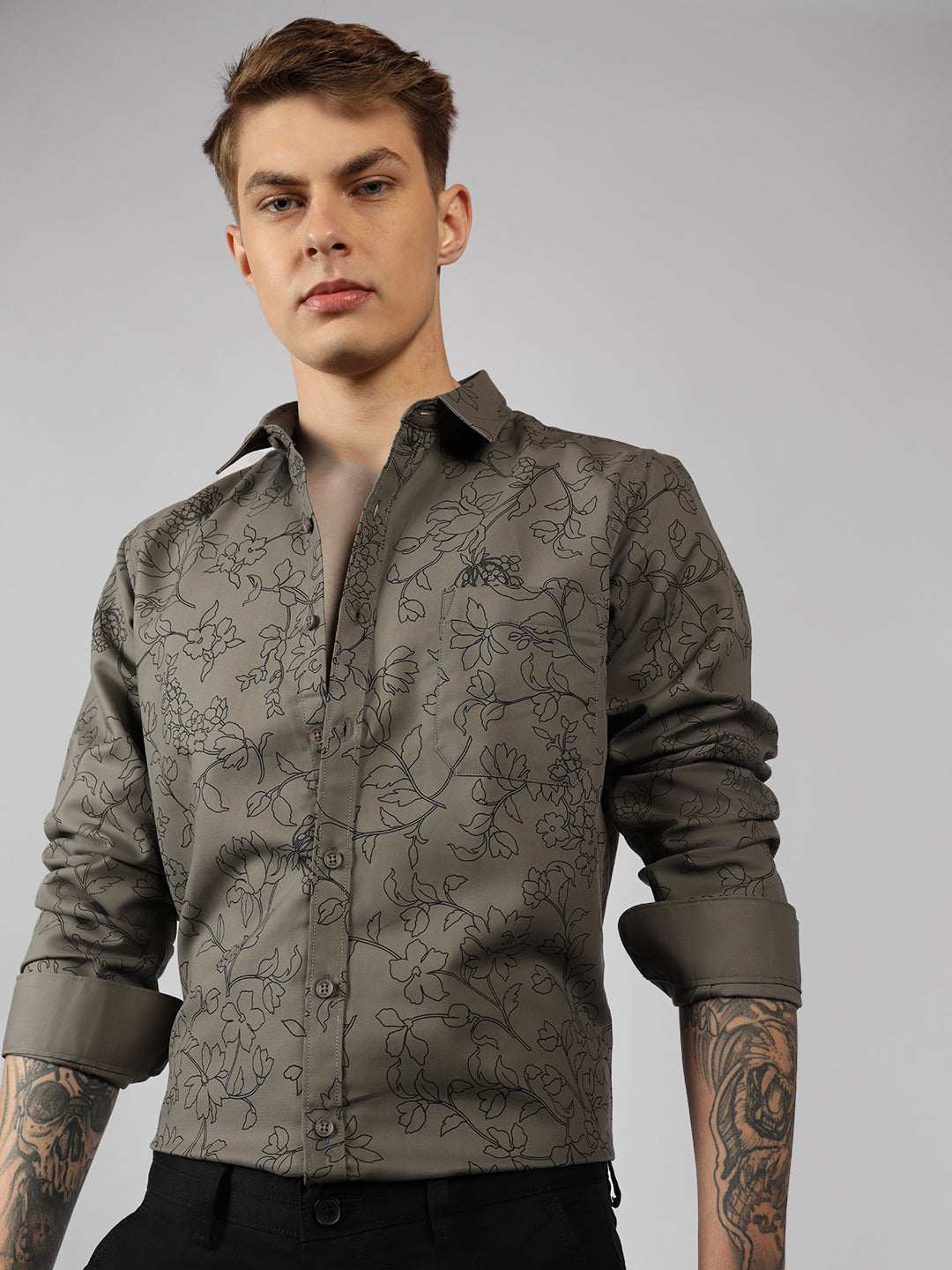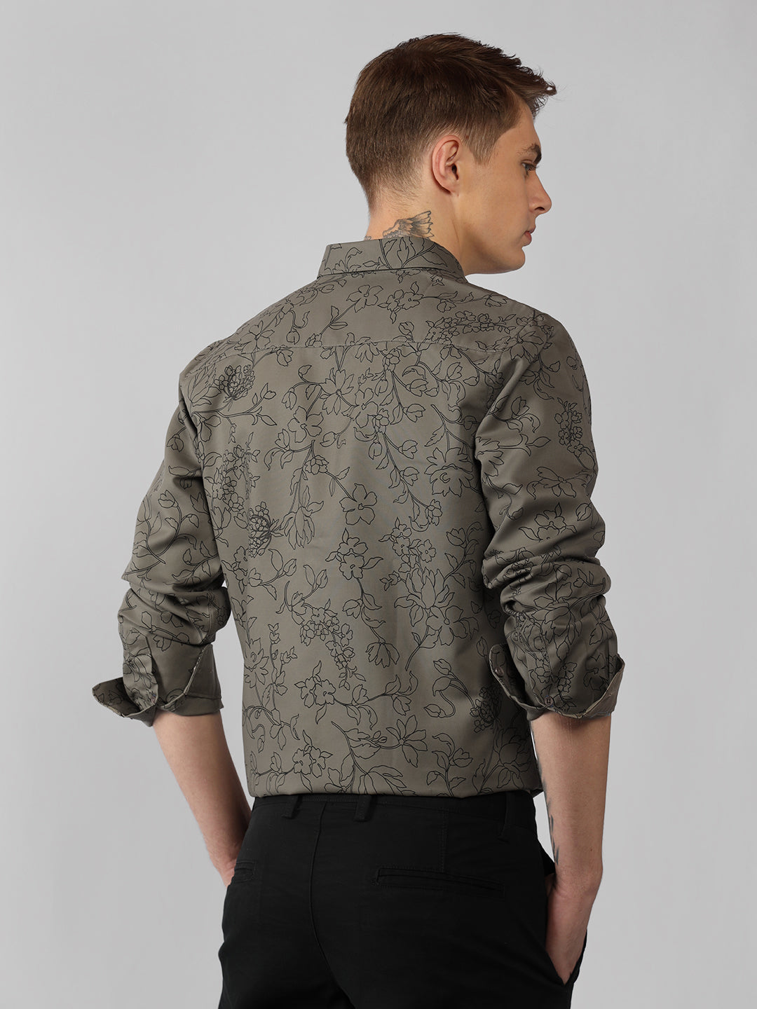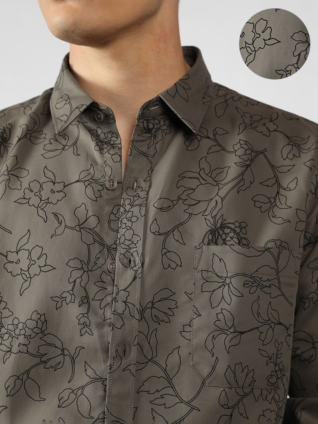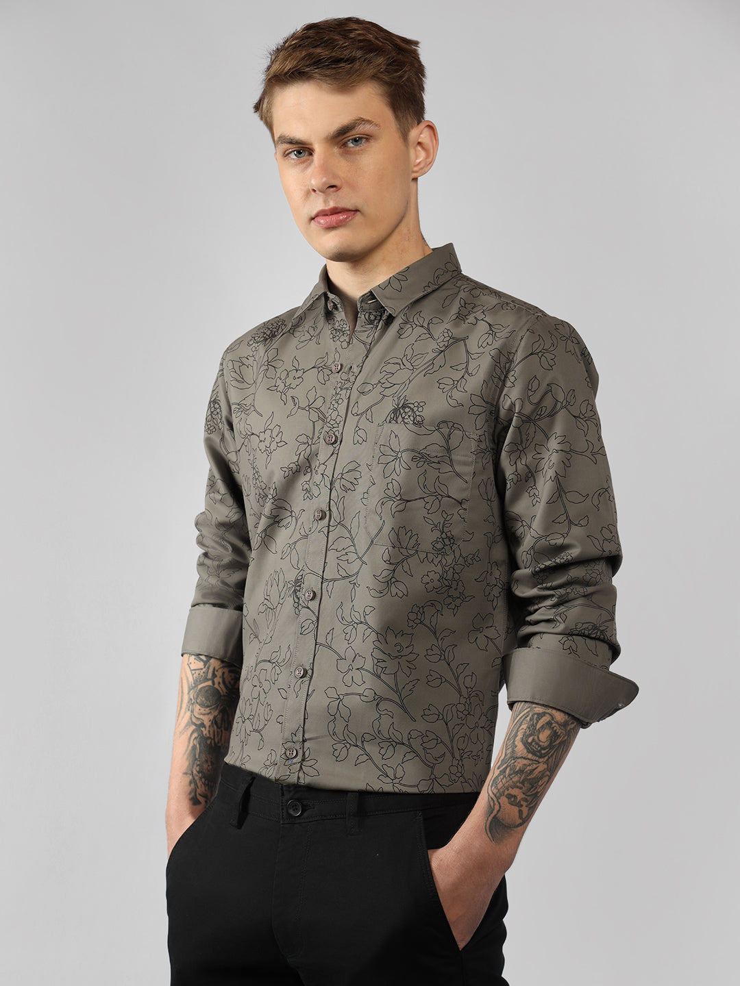 Men's Olive Printed Spread Collar Full Sleeve Regular Fit Shirt