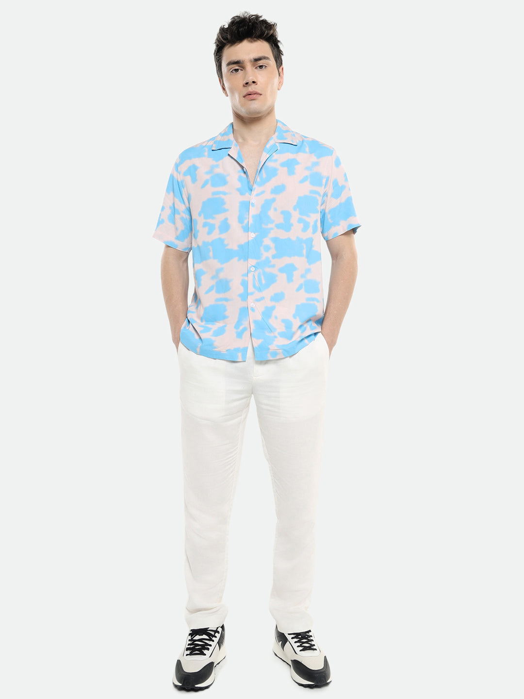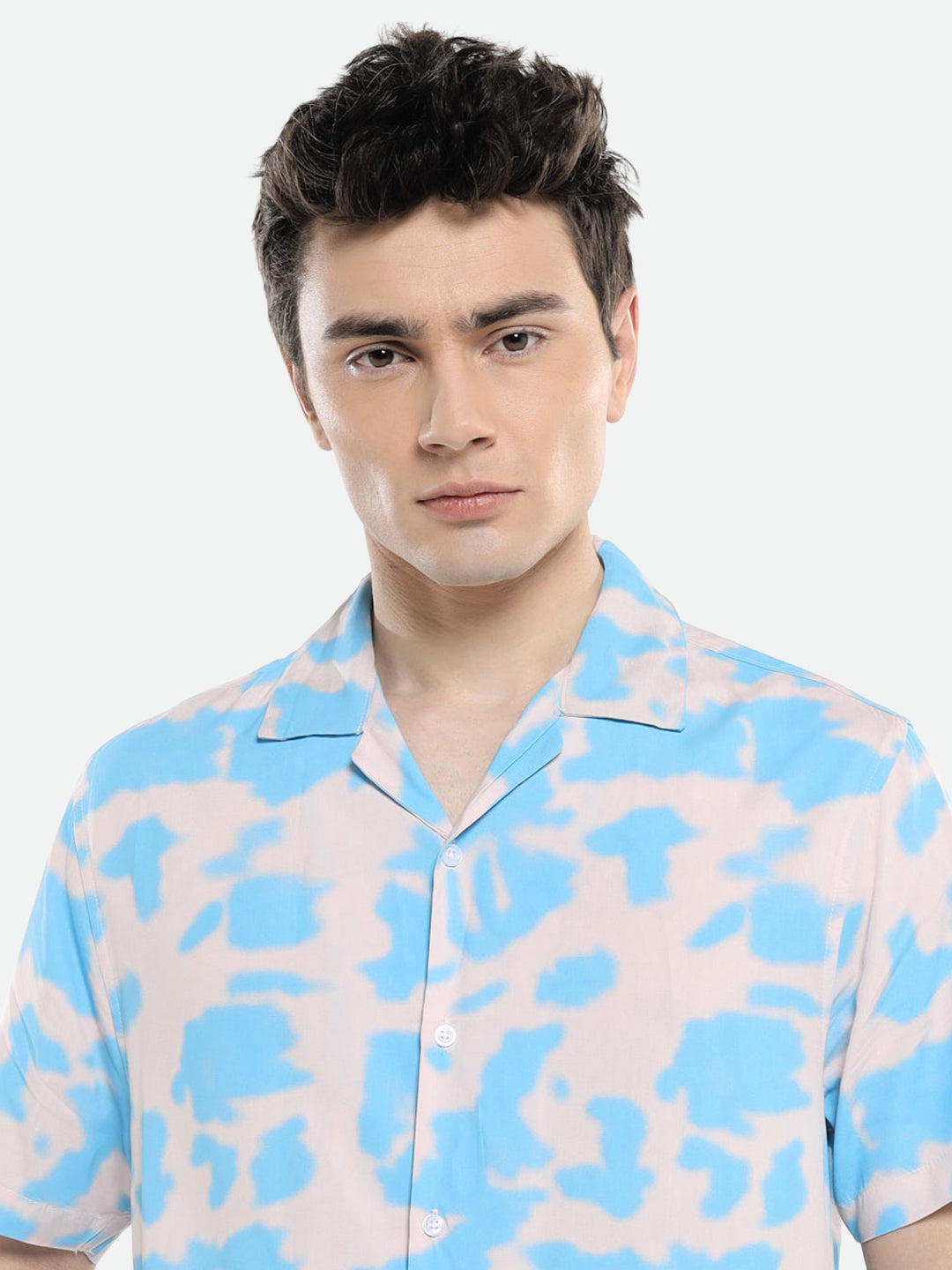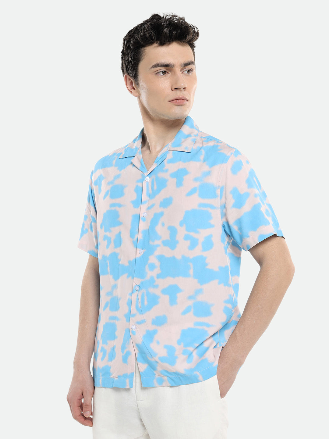 Men's Cuban Collar Regular Fit Printed Blue Casual Shirt