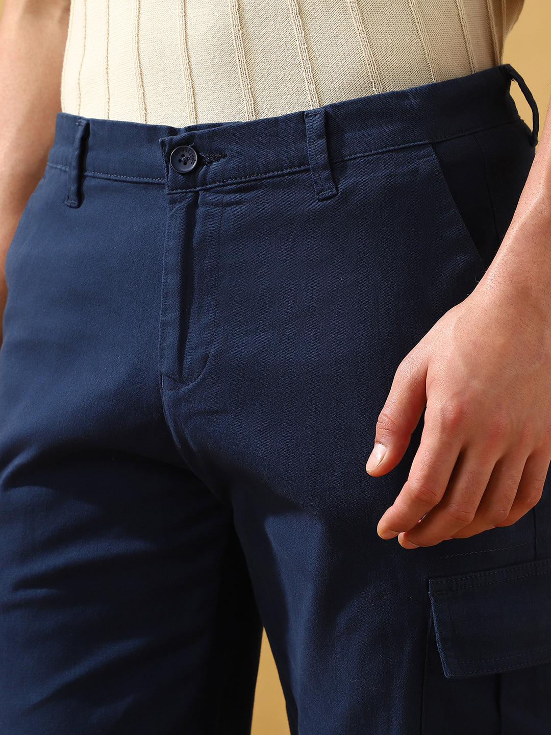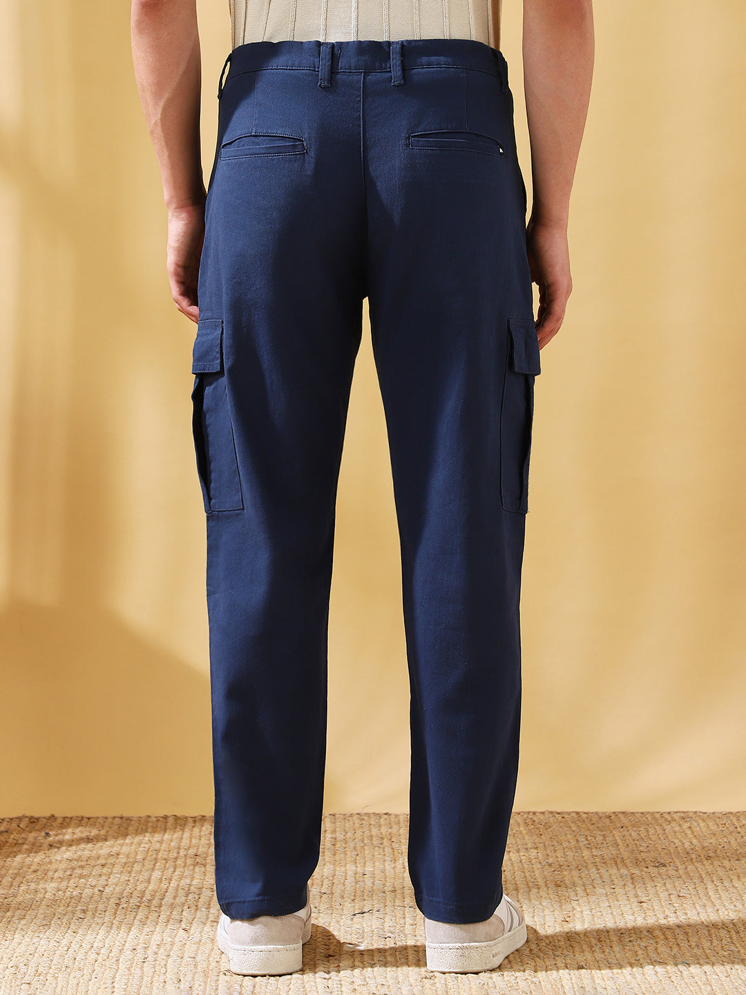 Men Dark Blue Solid Straight Fit Cargo Trousers