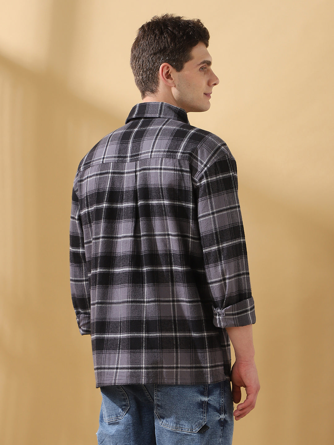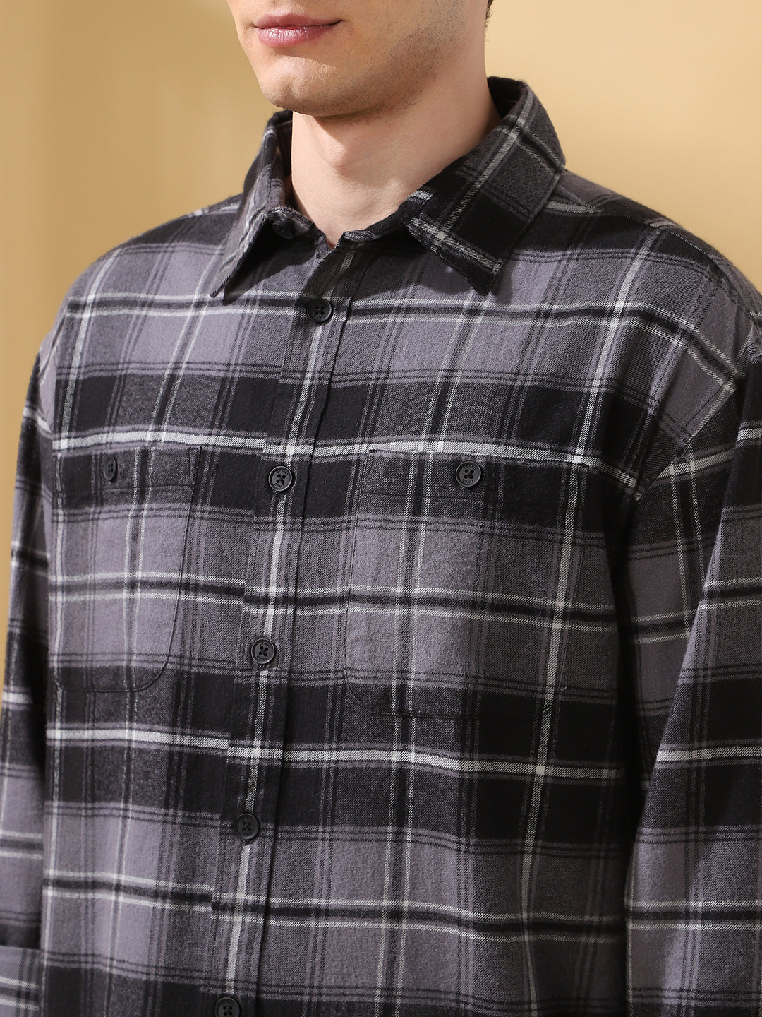 Men Black Relaxed Fit Flannel Checks Spread Collar Casual Shirt