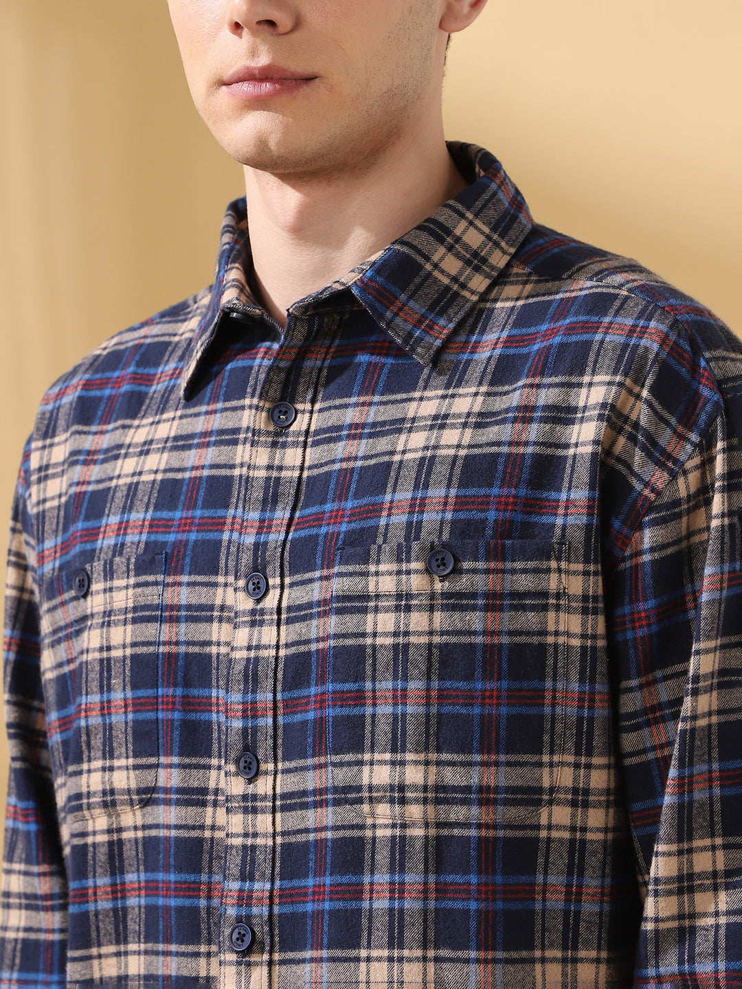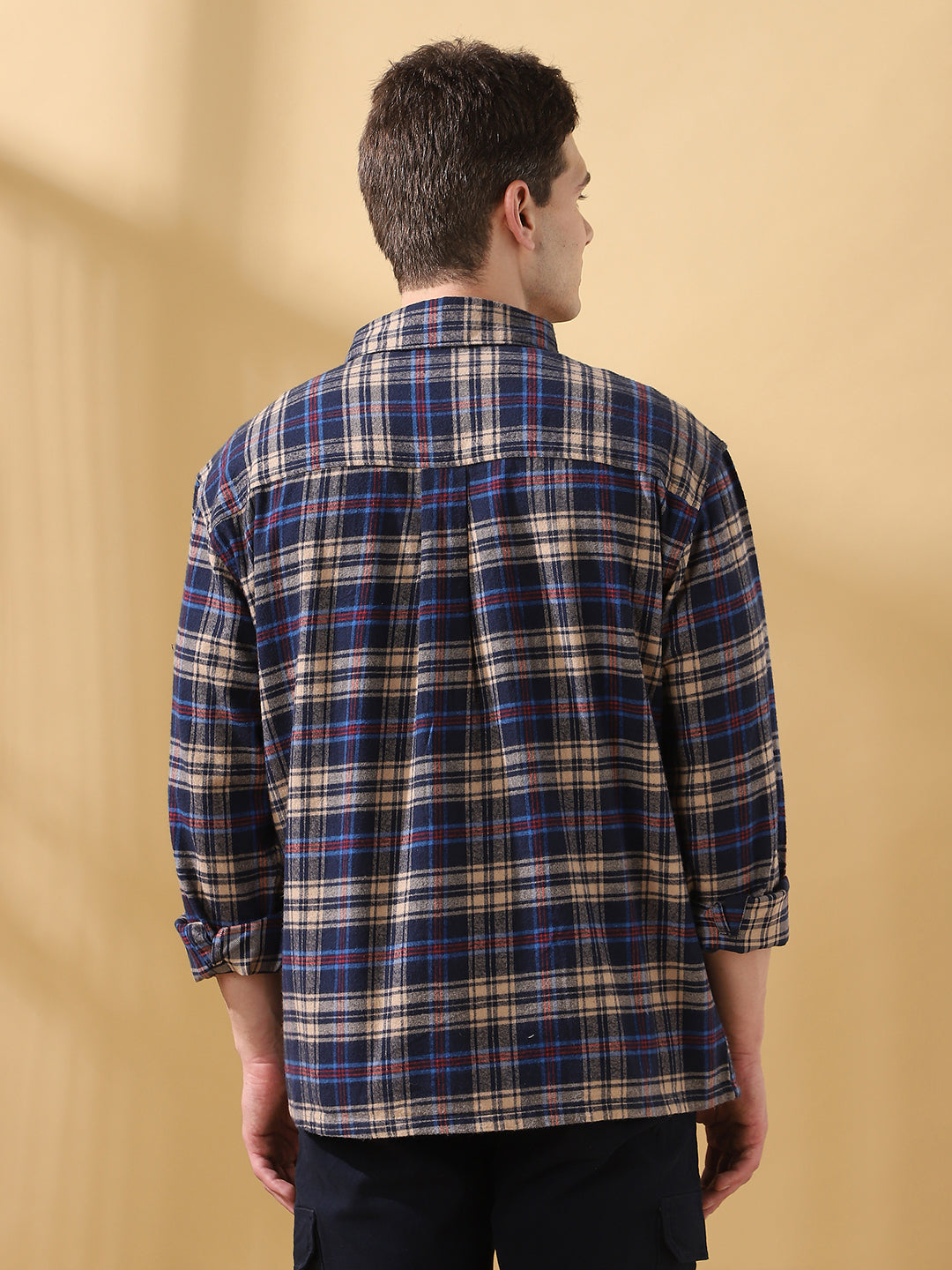Men Navy Relaxed Fit Flannel Checks Spread Collar Casual Shirt