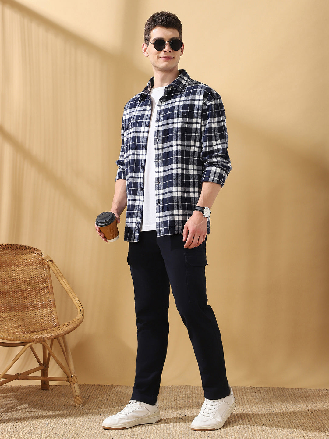 Men White & Navy Solid Spread Collar Full Sleeves Regular Fit Casual Shirt