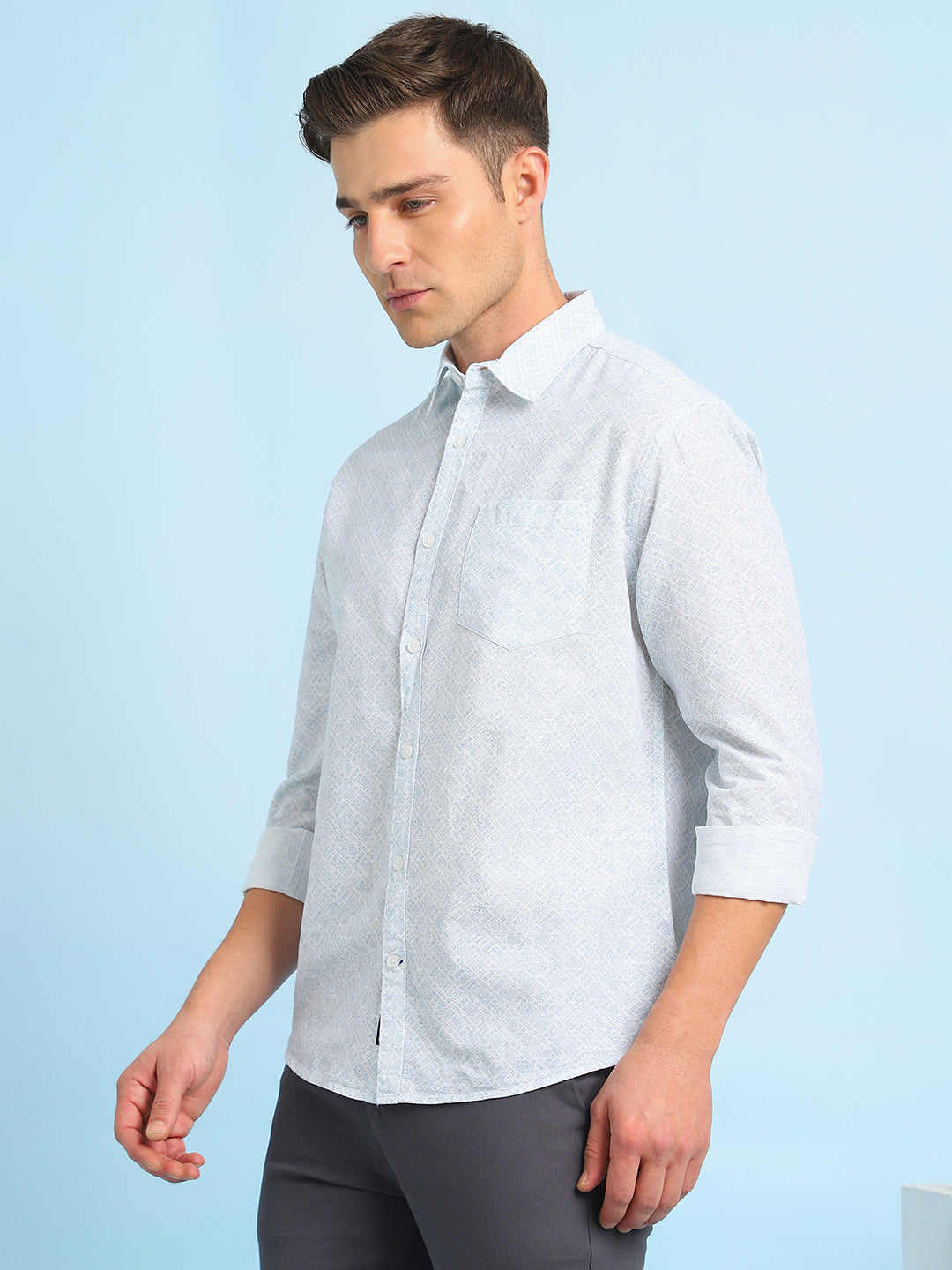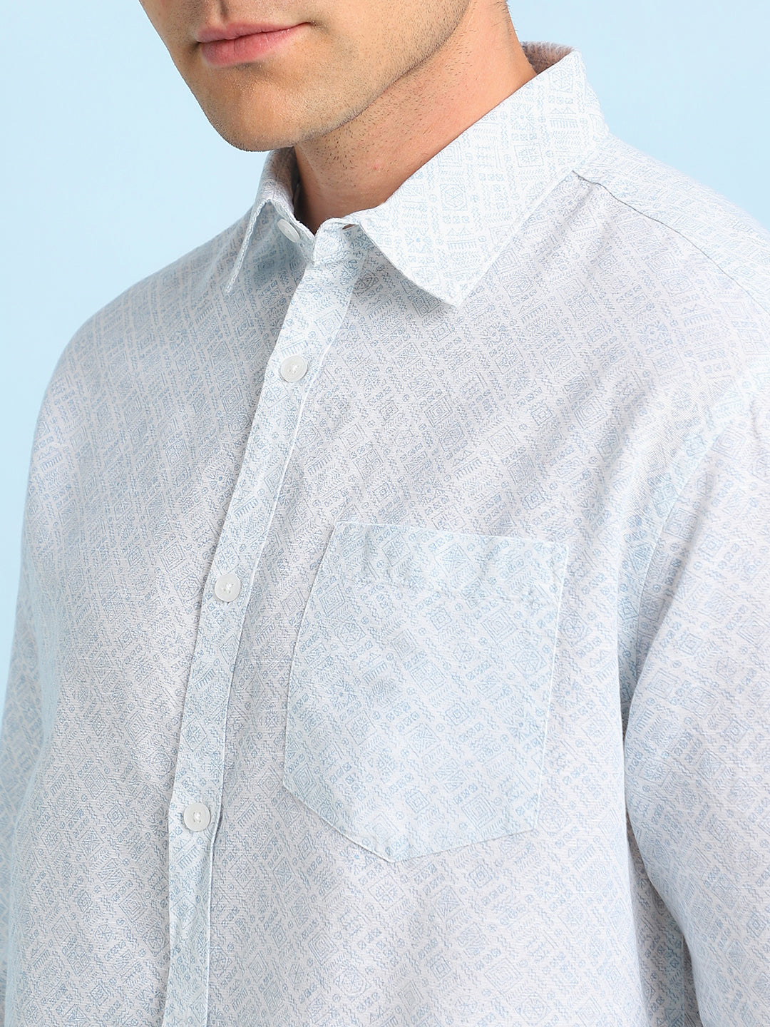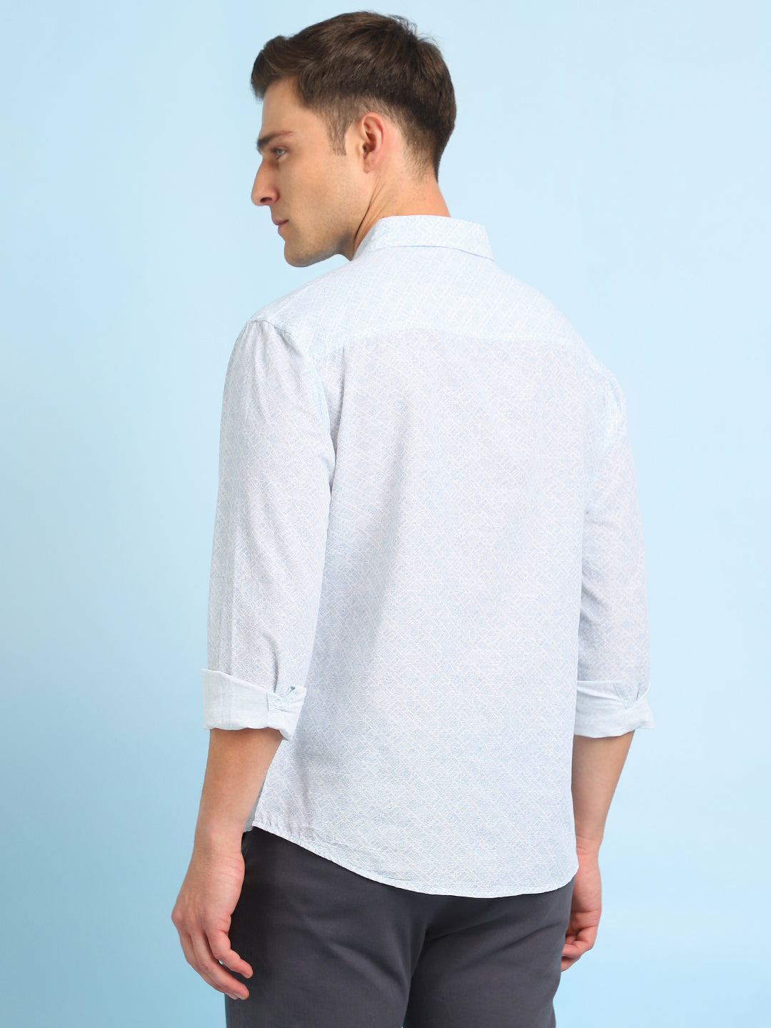 Men Blue Printed Spread Collar Full Sleeves Casual Shirt