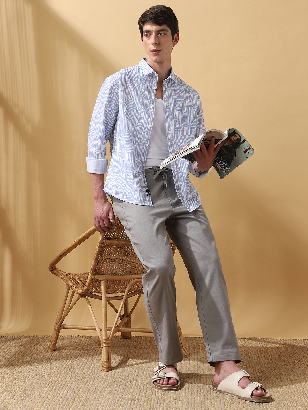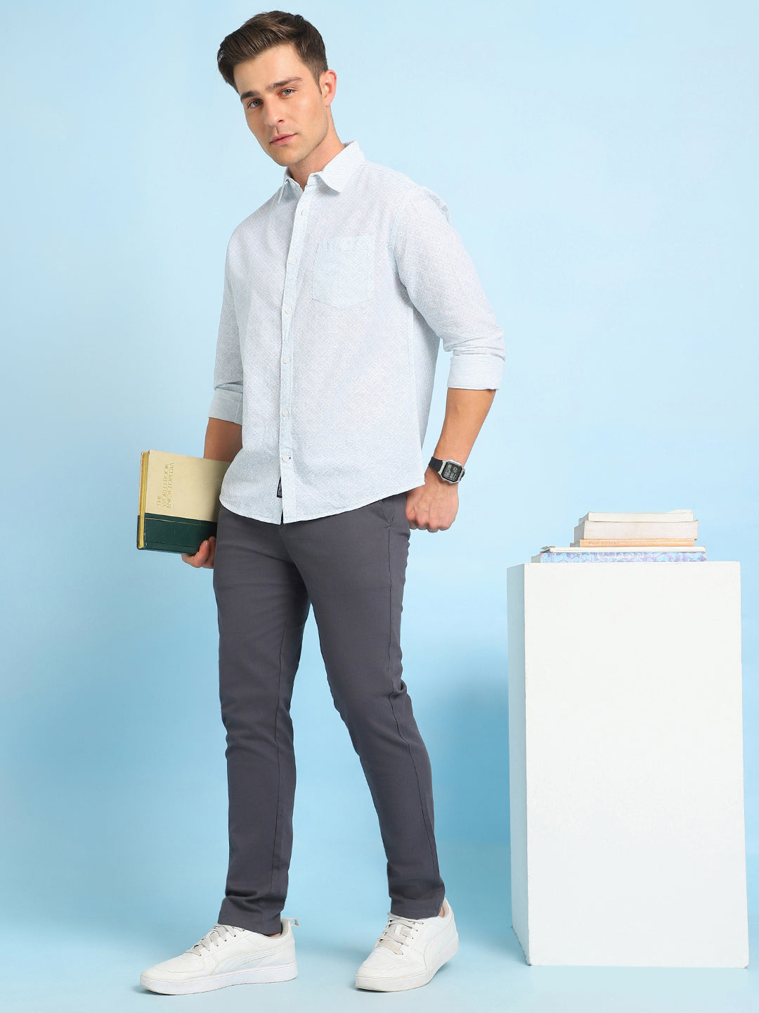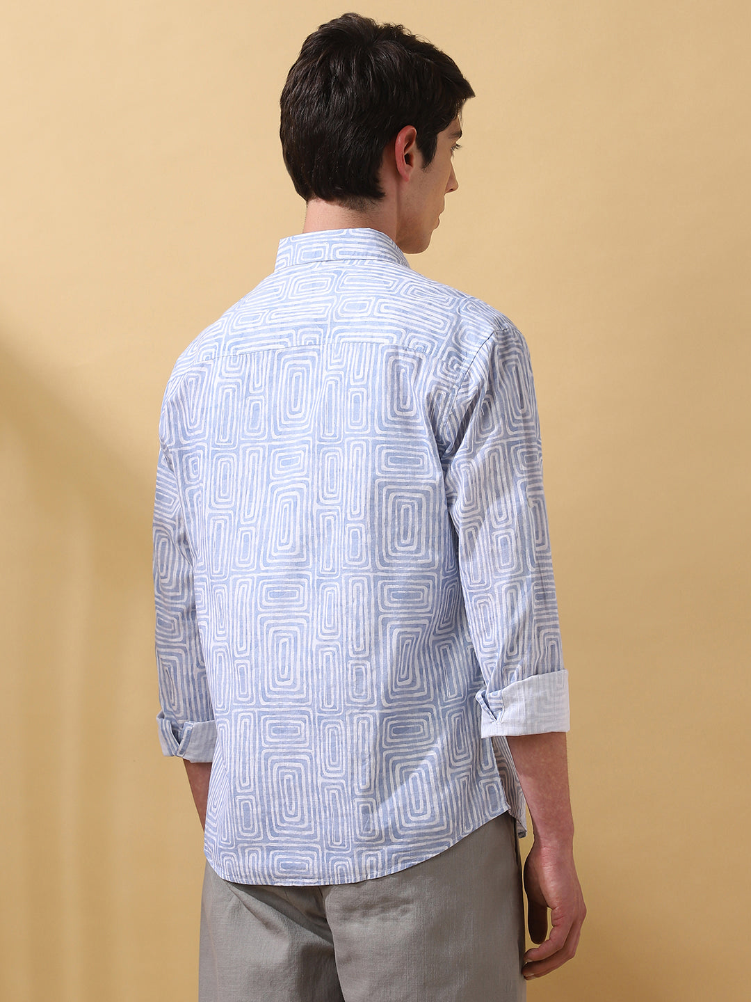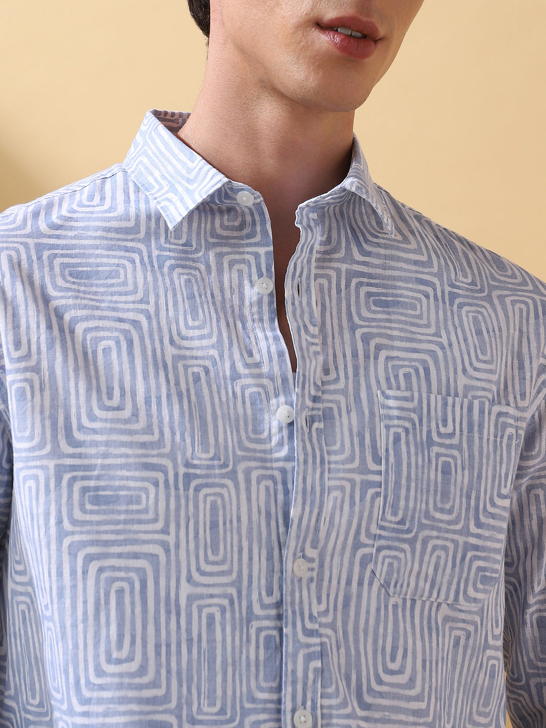 Men Blue Printed Spread Collar Full Sleeves Casual Shirt