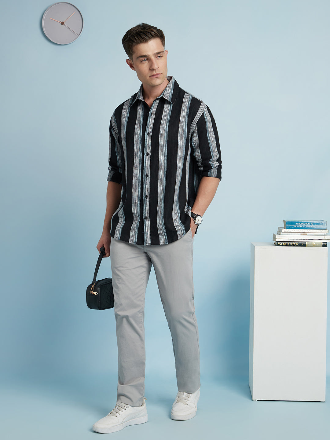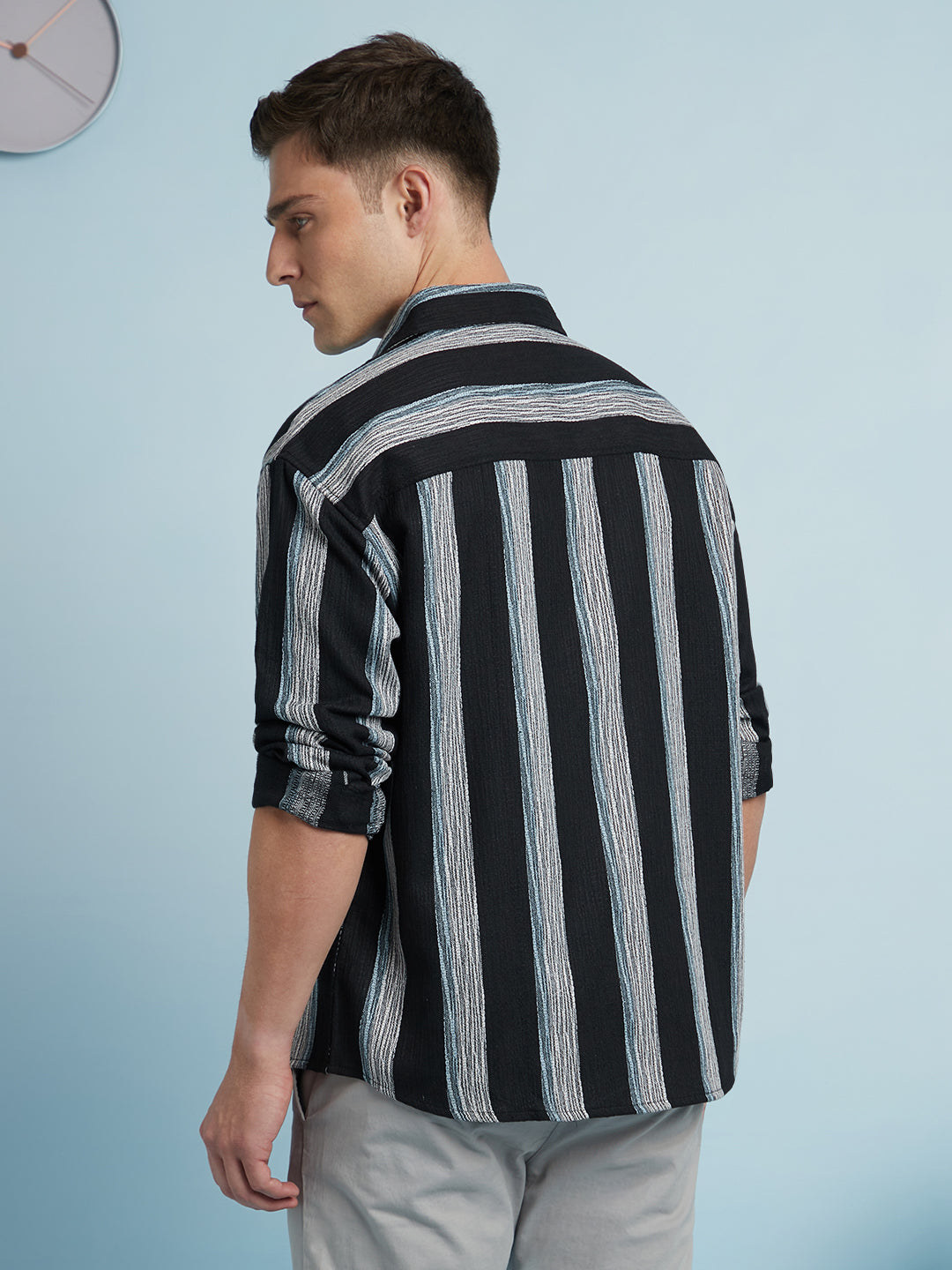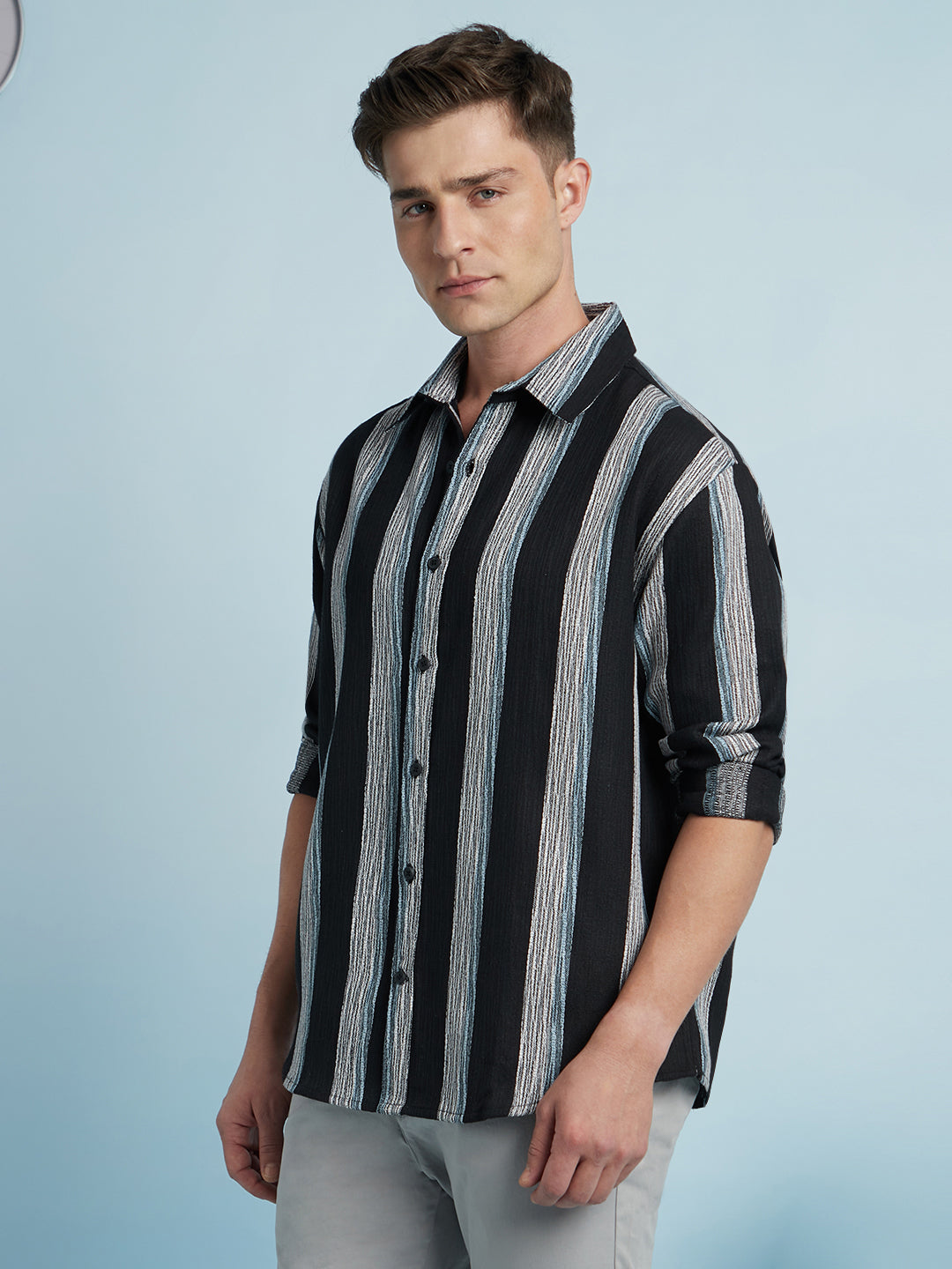 Men Black Vertical Stripes Spread Collar Full Sleeves Relaxed Fit shirt