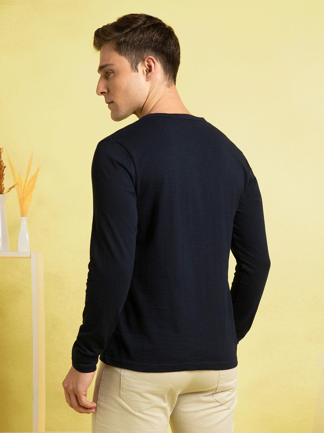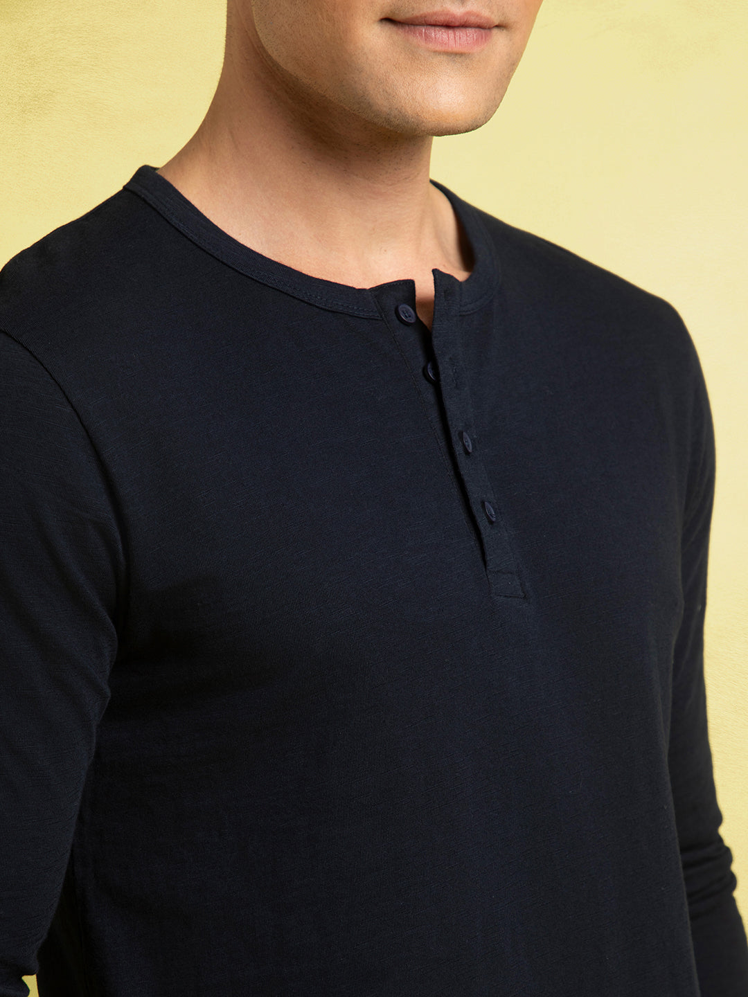 Men's Navy Blue Henley Neck Full Sleeves T-shirt