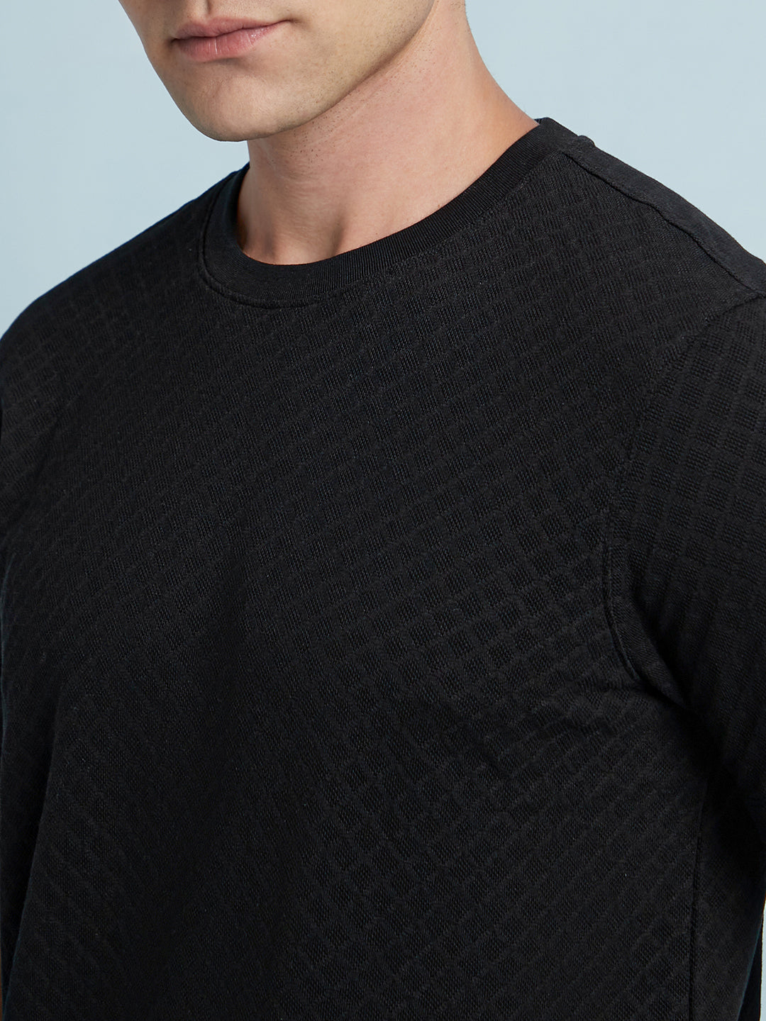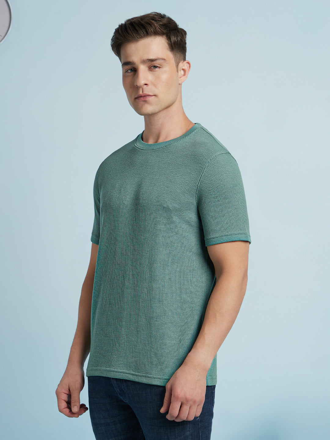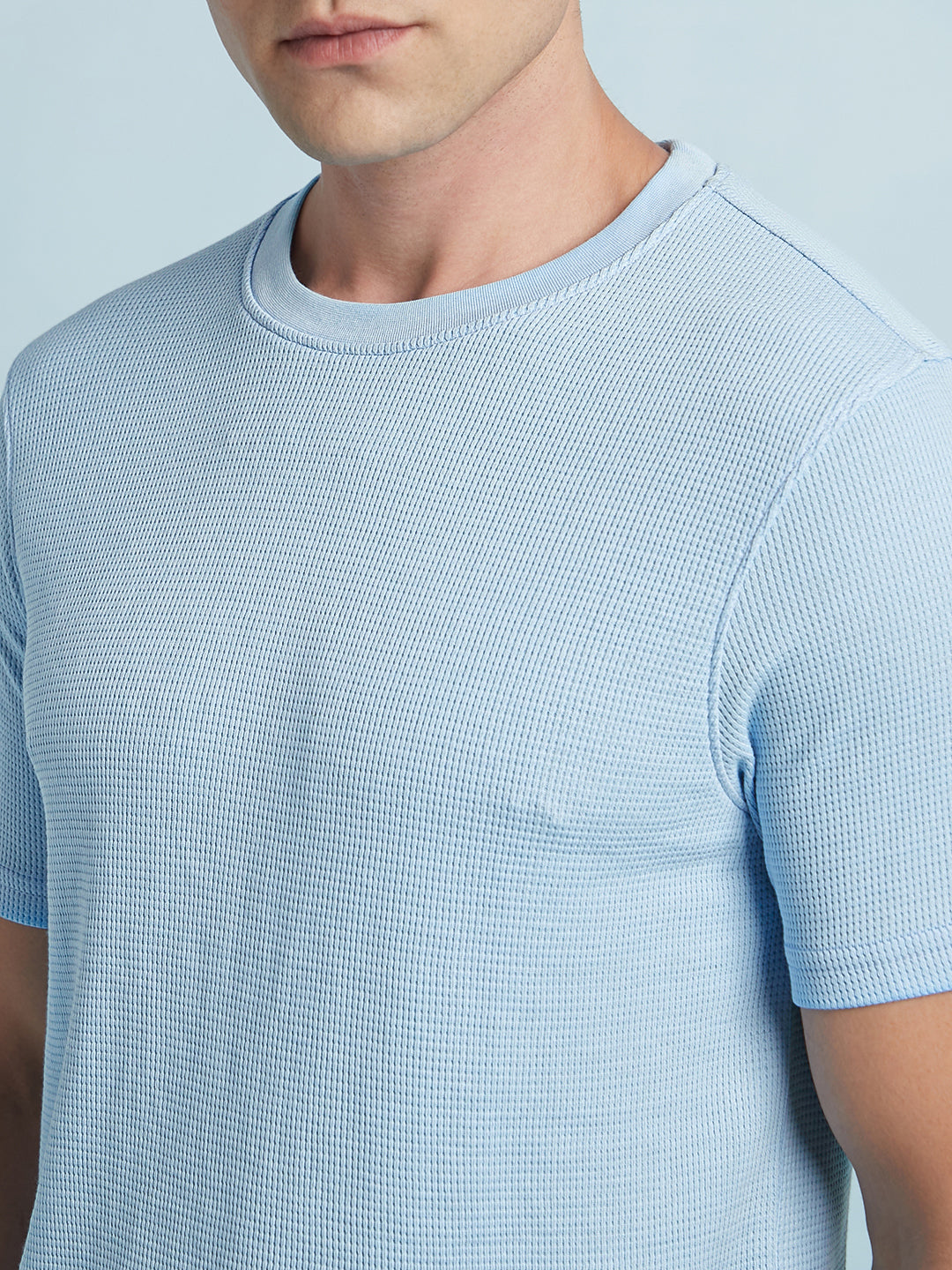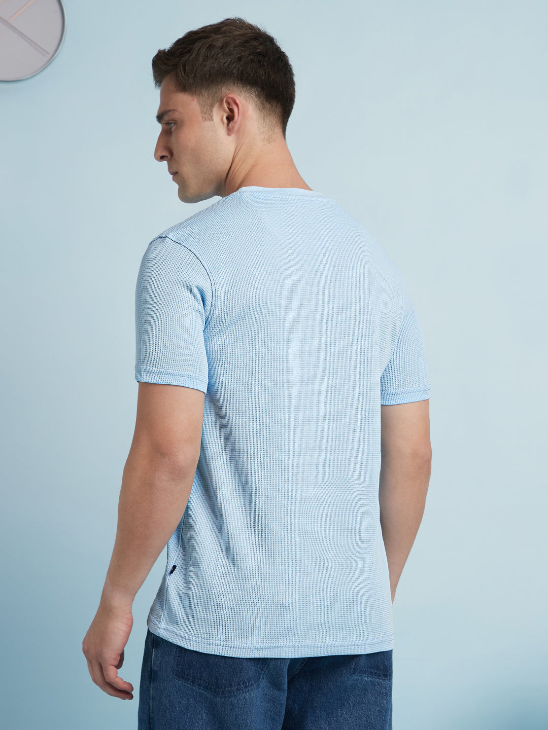Men Sky Blue Solid Textured Round Neck Half Sleeves Regular Fit T-Shirt