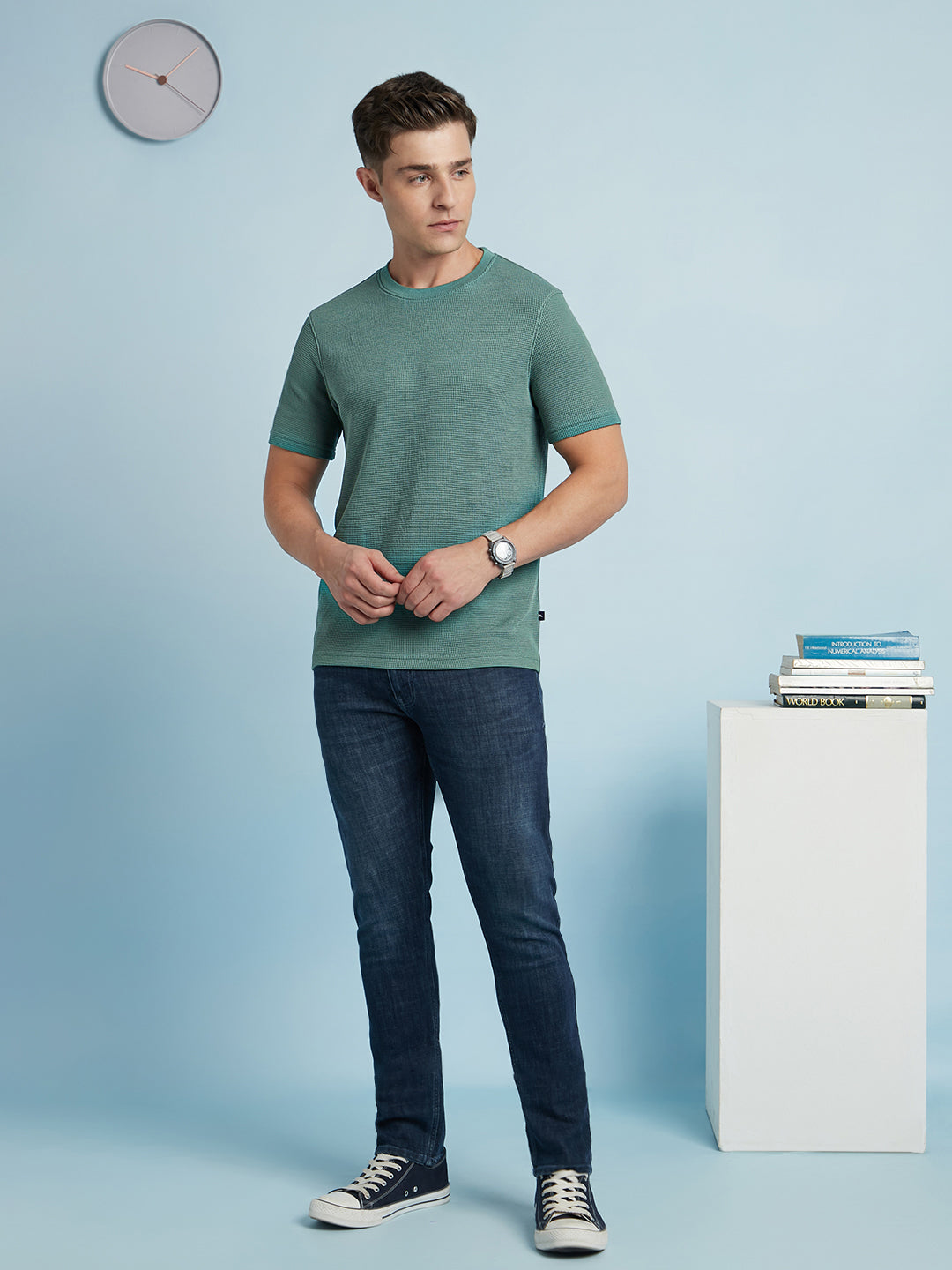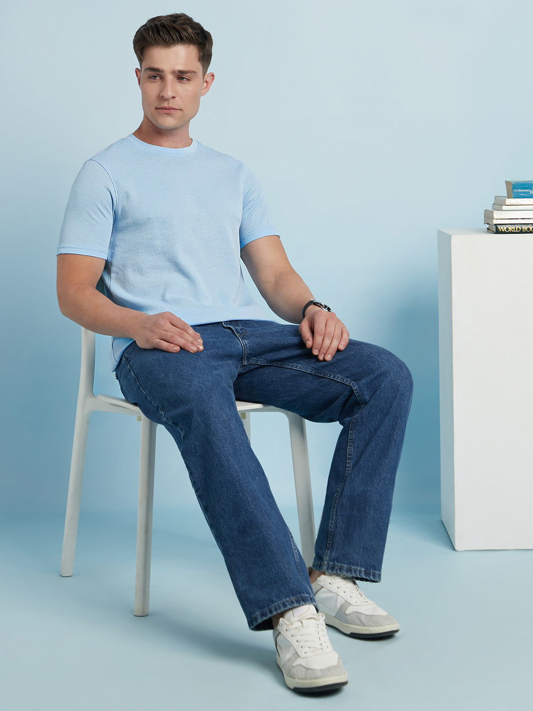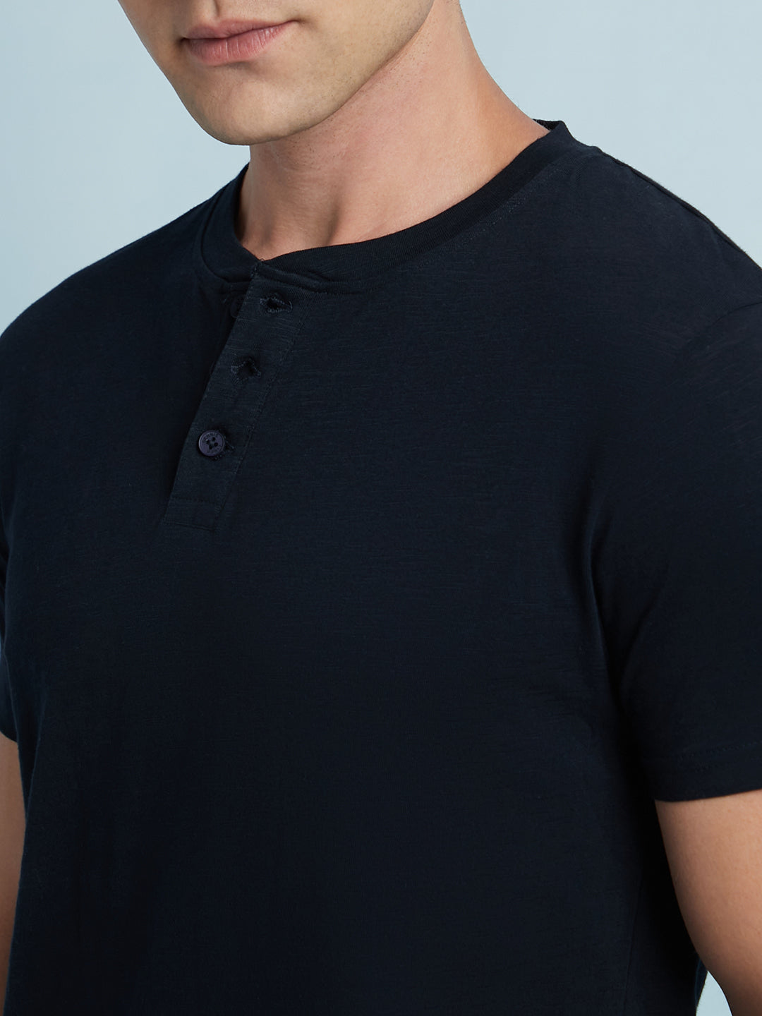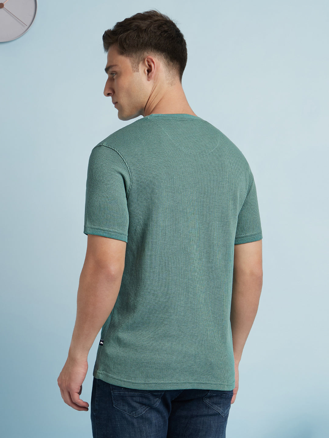 Men Sky Blue Solid Textured Round Neck Half Sleeves Regular Fit T-Shirt