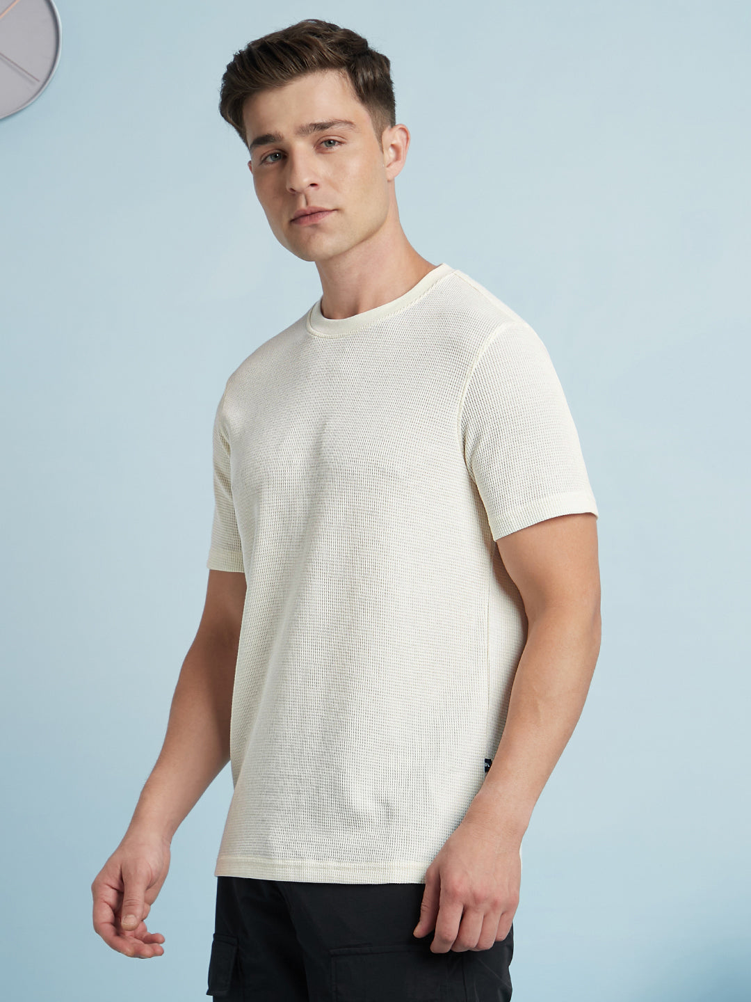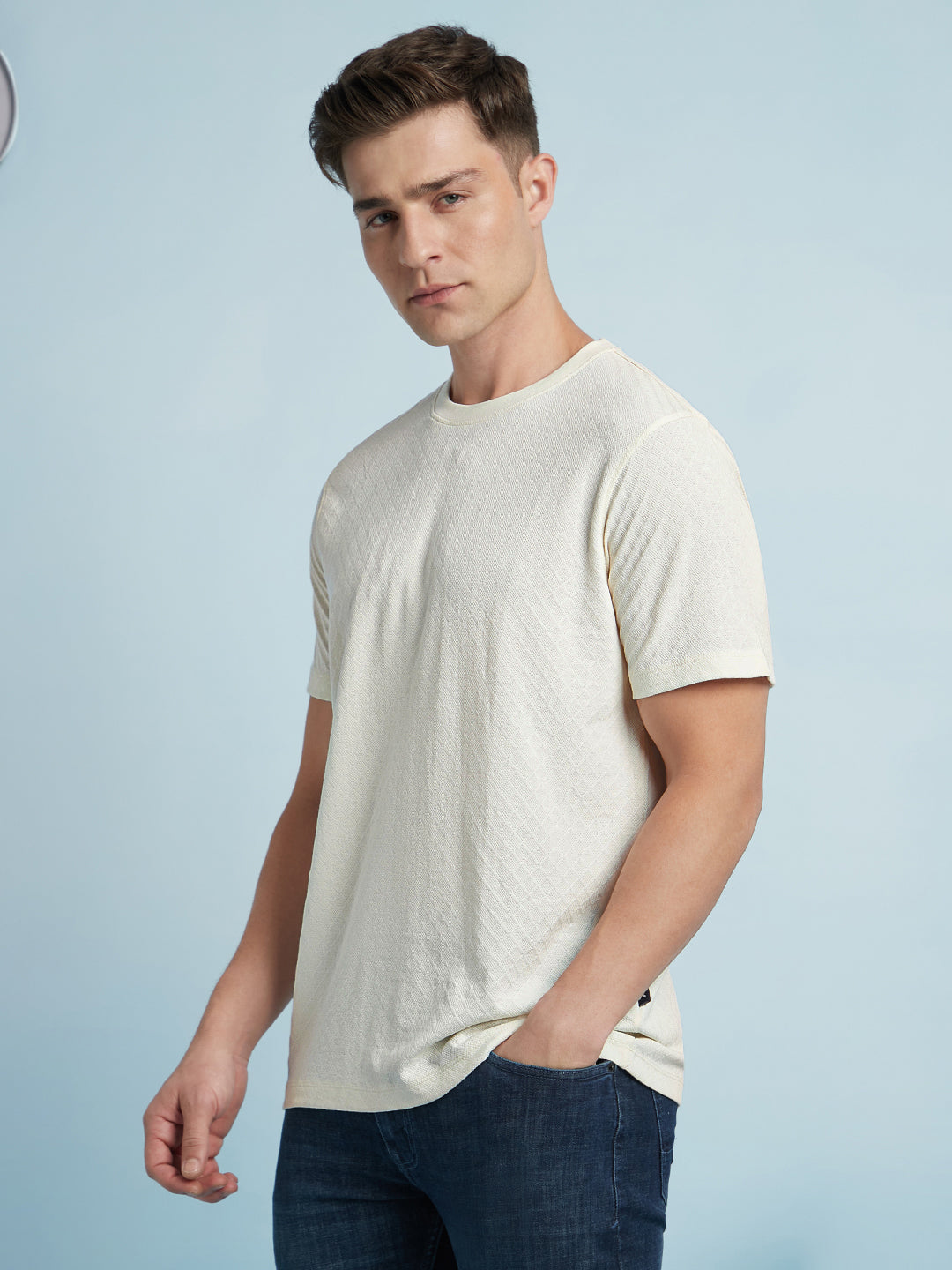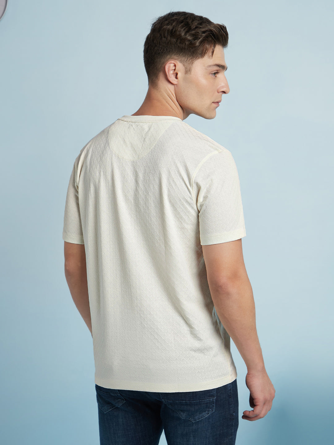 Men Off White Solid Textured Round Neck Half Sleeves Regular Fit T-Shirt