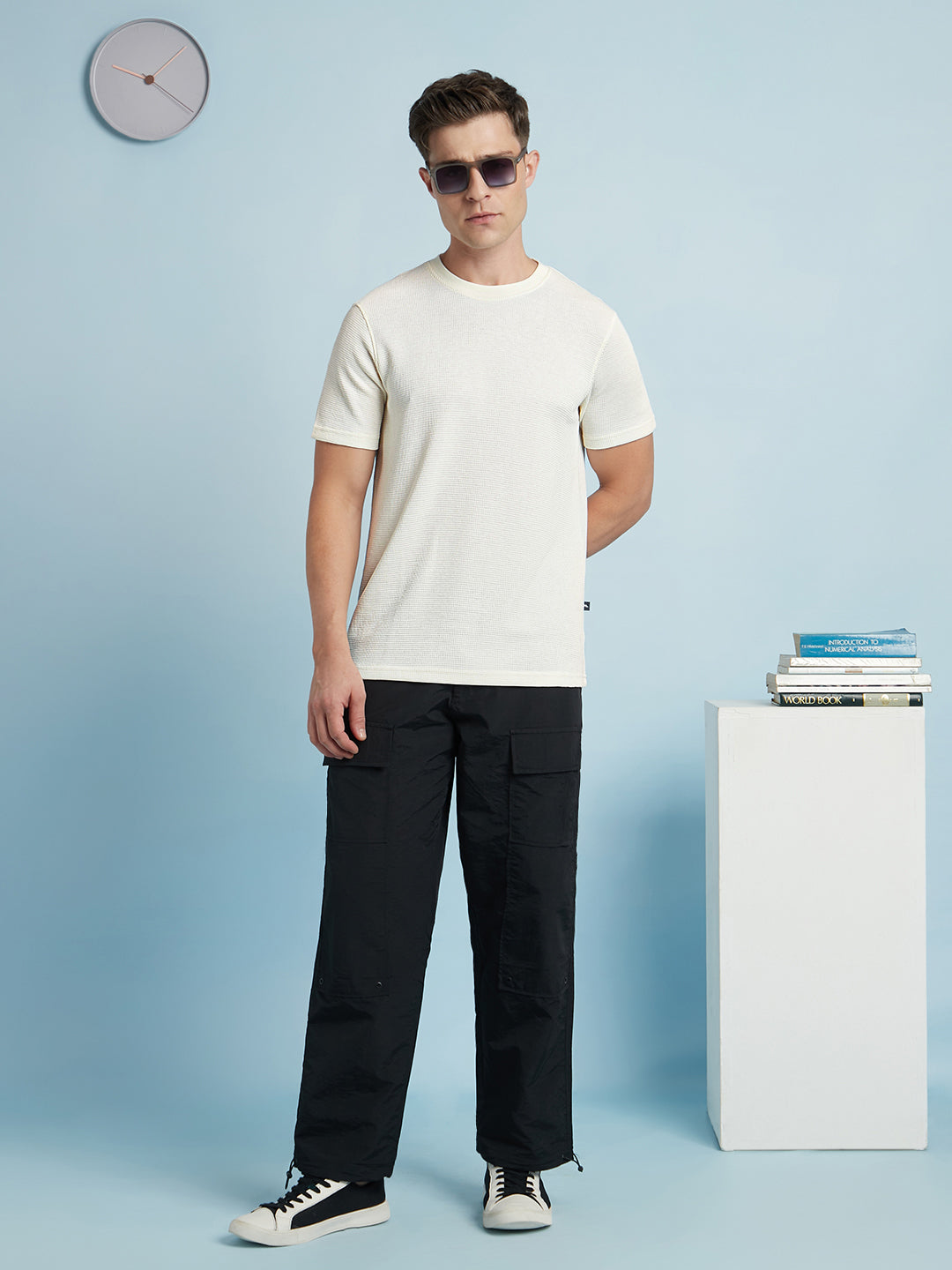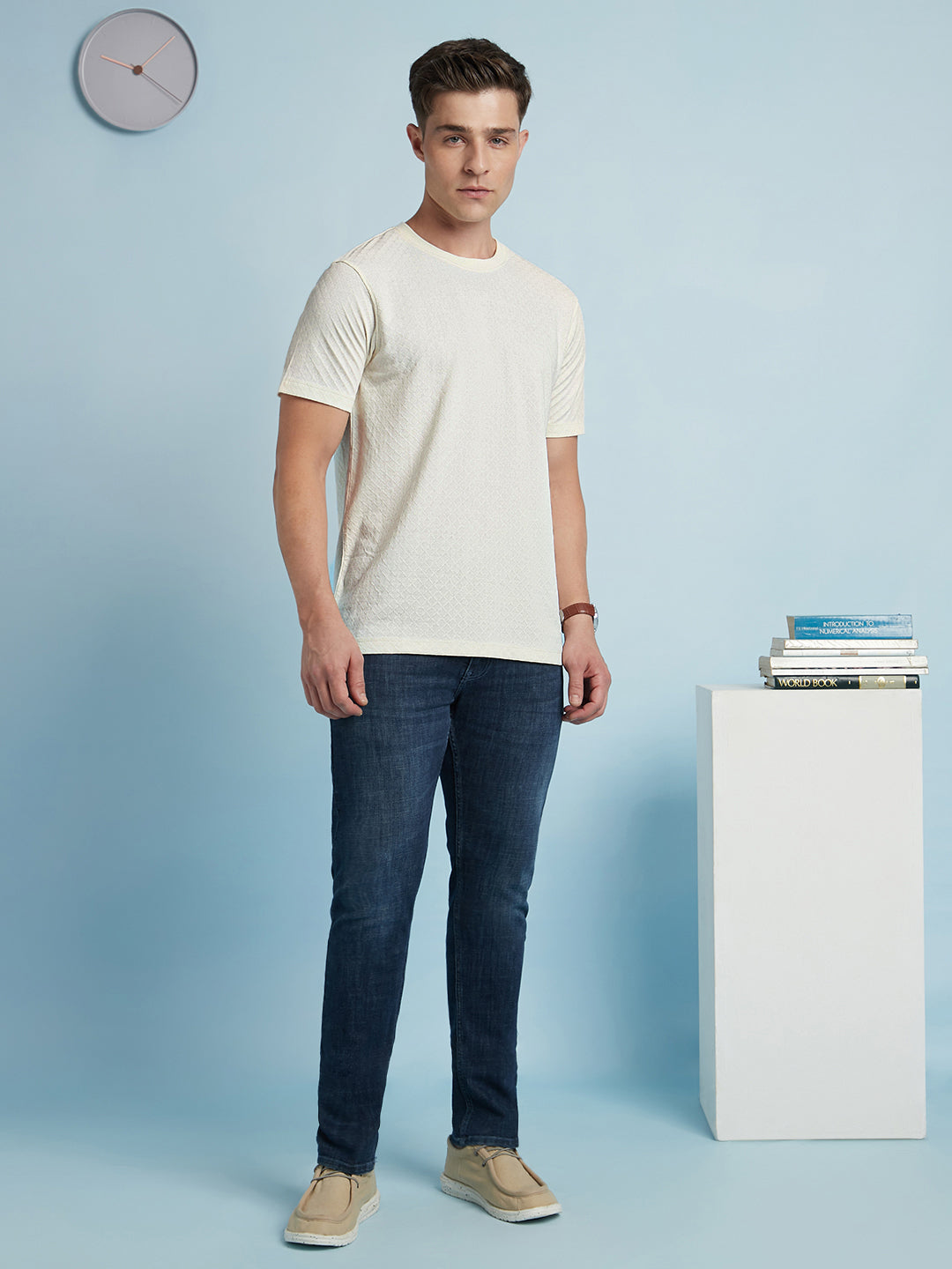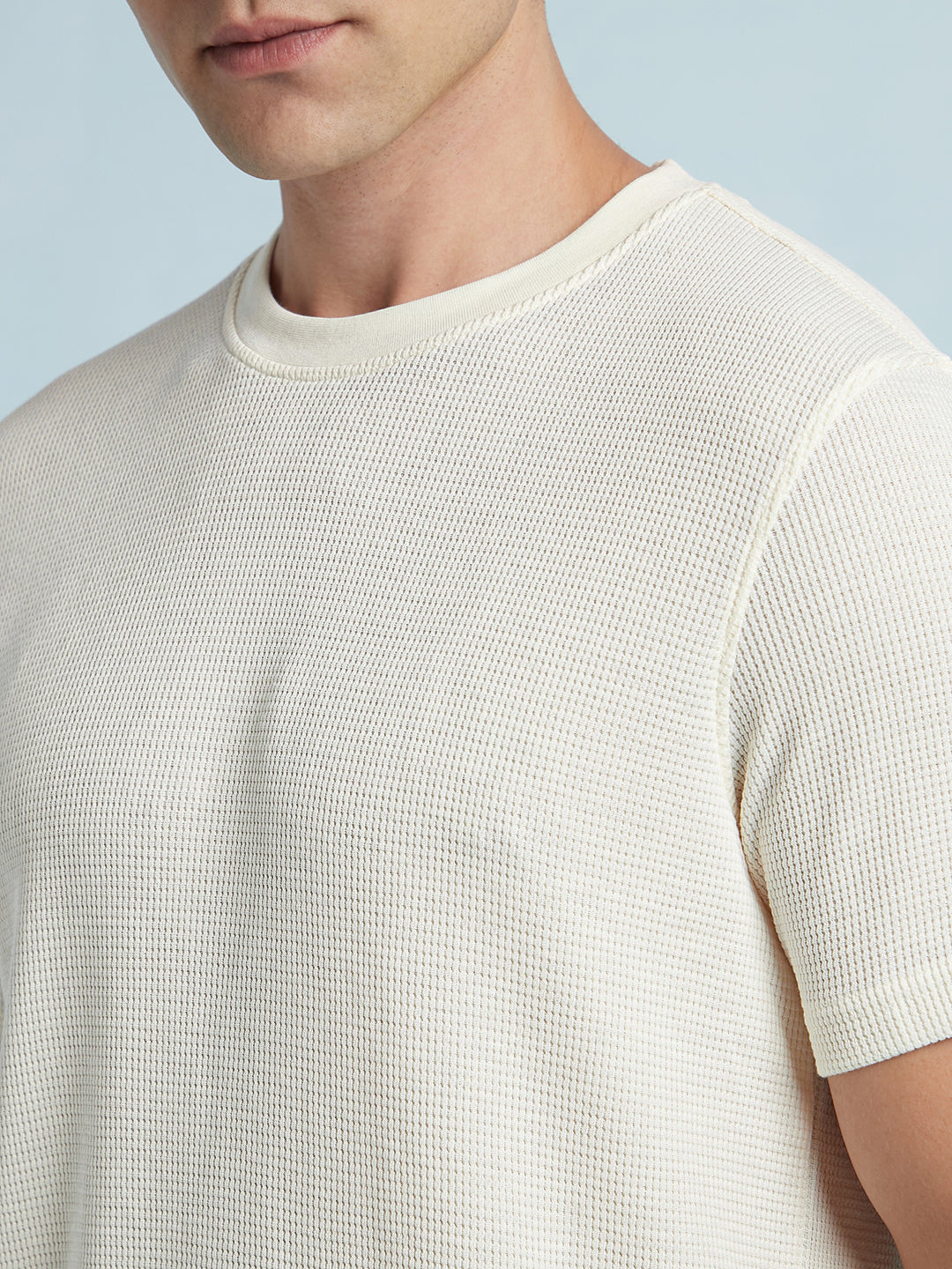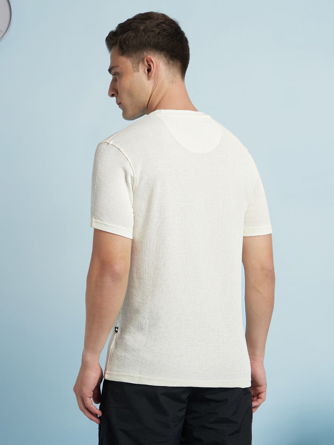 Men Off White Solid Textured Round Neck Half Sleeves Regular Fit T-Shirt