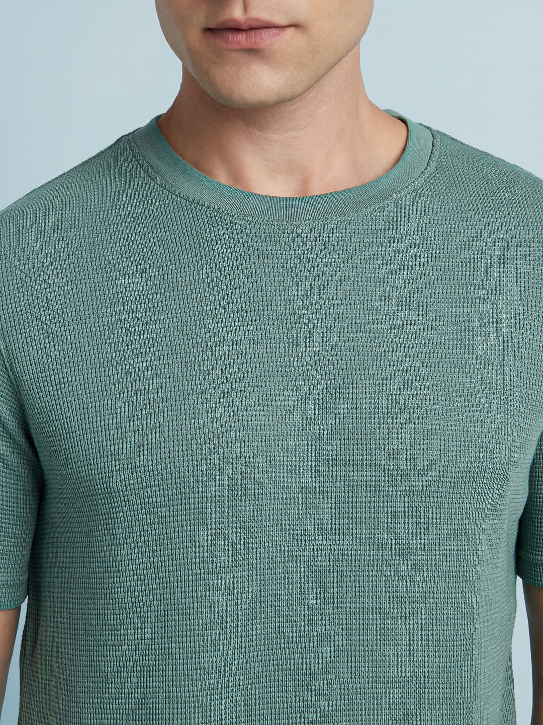 Men Sage Green Solid Textured Round Neck Half Sleeves Regular Fit T-Shirt