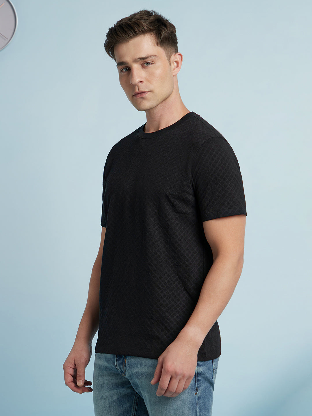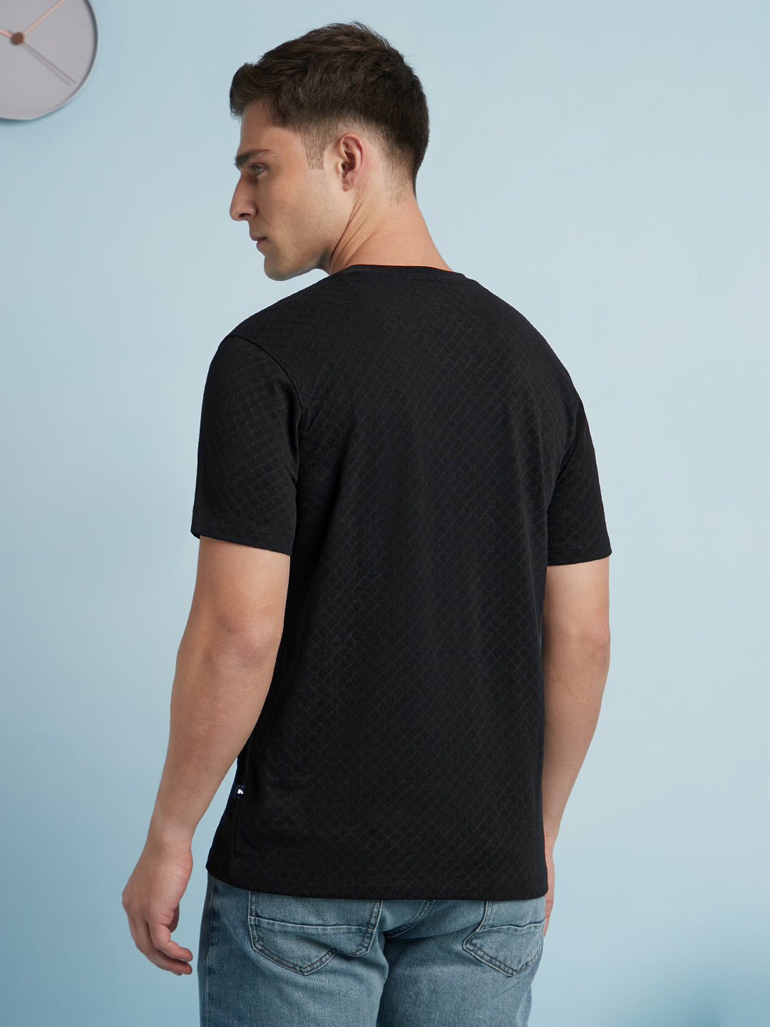 Men Black Solid Textured Round Neck Half Sleeves Regular Fit T-Shirt